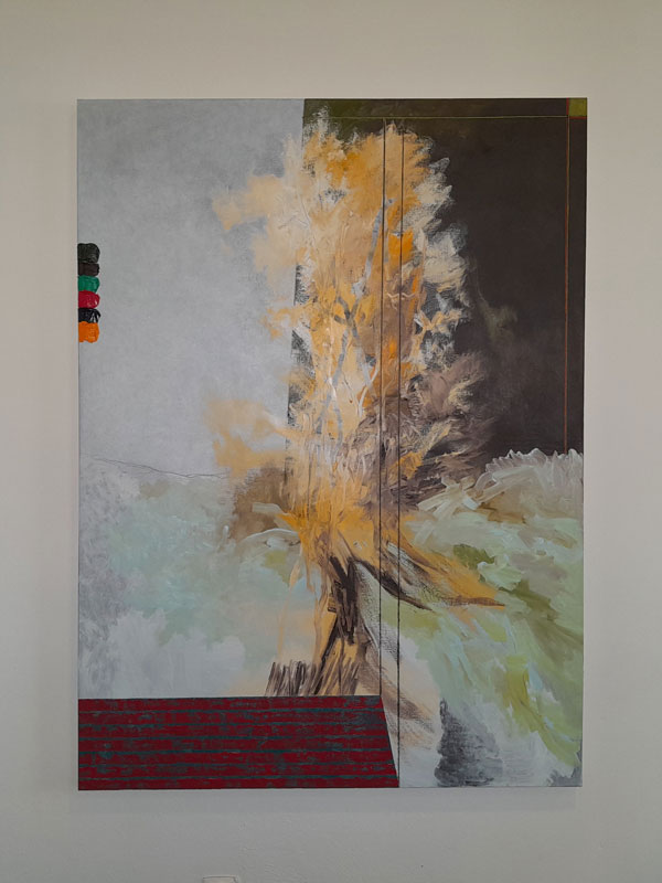 “A Ponte, o Campanário, a Casa e o Barqueiro” nasce, acima de tudo, da inquietude do autor: “Porquê riscar aqui ou ali? Porquê colocar aquela mancha desta forma, com esta cor? Mas afinal quem fala comigo? Estou realmente a falar comigo mesmo ou com a pintura? E a pintura também fala? E por que será que tudo fica, mais cedo ou mais tarde, resolvido na pintura? Tantas questões por responder, que são solucionadas no quadro. Naturalmente que a decisão de iniciar uma pintura, um desenho pressupõe uma ideia prévia, mas neste processo de execução será apenas este esforço de resolver o que não tem solução.” As interrogações do artista extraídas do texto da folha de sala são como vozes ocultas, mas que predominam em cada processo criativo. Às perguntas, só existe uma forma de resposta: a obra. As mesmas dúvidas servem também para evocar o início da ideia criativa. De onde surge este apelo ao ato de criar. A obra nasce da obra, neste caso, é uma proposta de evocação da pintura “Landscape with a Stone Bridge” (1638), de Rembrandt van Rijn, que Rui Algarvio observou numa exposição, em 2017, no Museu Nacional de Arte Antiga de Lisboa. Foi esta miragem artística que serviu de impulso para a desconstrução e fragmentação da paisagem. “E quando me confronto com a obra de outros artistas? Há momentos em que tenho a sensação de que o artista soube responder a todas estas inquietações e o resultado foi tão bom que nada mais há a acrescentar e que nos resta apenas contemplar”, conclui. Na Capela do Centro Cultural de Cascais, as séries de quadros e de desenhos de Rui Algarvio têm mundos dentro e, pela própria disposição em sala, cada fragmento transforma-se em poesia visual que é, afinal, o universo do pintor. No ato contemplativo, depreende-se que o artista também é um alquimista que estabelece pontes entre o mundo real e o da imaginação, como se fosse movido pela mesma força de braços que os barqueiros que navegam no rio do quadro de Rembrandt, peça disponível no Rijksmuseum, em Amesterdão.