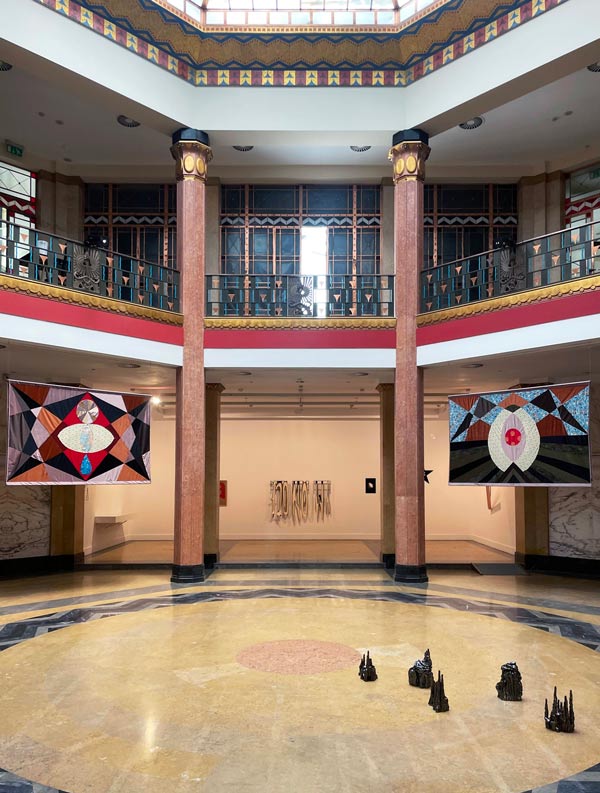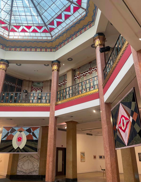Aponte-se, ainda, a presença de outras peças exemplares tais como duas magníficas telas de Jorge Pinheiro e dois óleos de Tiago Batista, estes últimos já exibidos na primeira exposição, em Lisboa. Especialmente ao nível estético, visual e formal, da autoria de Alisa Heil, um conjunto de oito estandartes, distribuídos pelo perímetro das arcadas que determinam o centro do espaço. Produzidos com a técnica patchwork, combinam retalhos de tecidos em padrões geométricos e cada um homenageia uma figura feminina histórica. Partindo desta última obra, sublinha-se a proposta desaceleração por via da contemplação da arte, desafio este a ter em conta. Reitera-se, assim, o apelo a uma experiência lenta, demorada e dedicada, que rompa com a velocidade da vida. Por isso, Mover mas abrandar, parar e pensar.