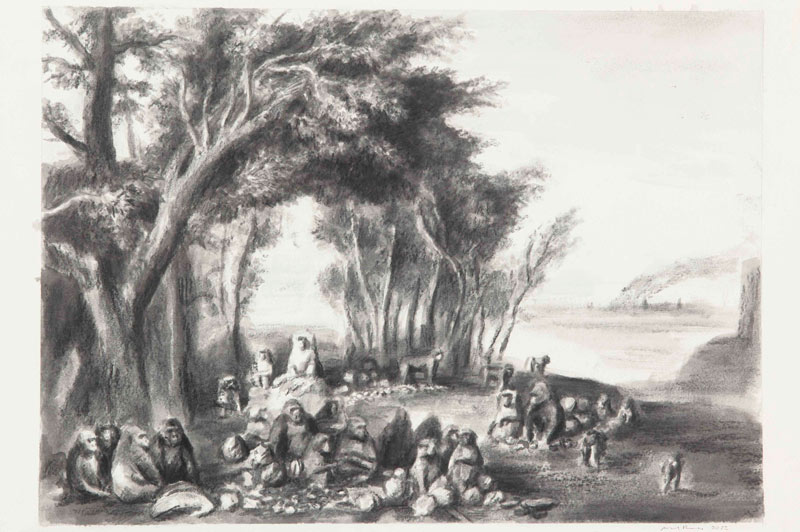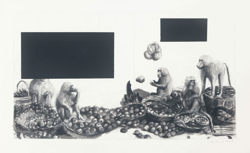 (…) os personagens e as escalas são disfuncionais (a presença de símios e de macacos na cena em vez de seres humanos, a escala desmesurada de certos elementos vegetais), são referência a representações de abundância do período de grande expansão e conquista do Ocidente (séculos XVI e XVII), apresentados de forma distópica, num mundo de escassez de recursos. (Almeia, B. P. [2023]. Folha de Sala)