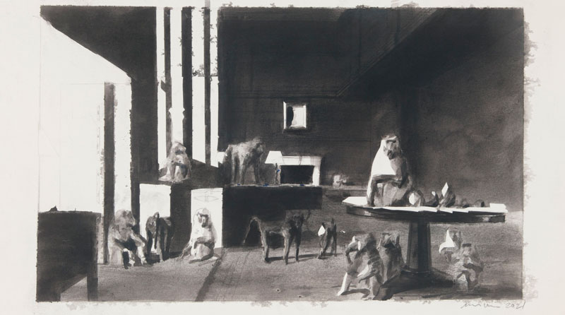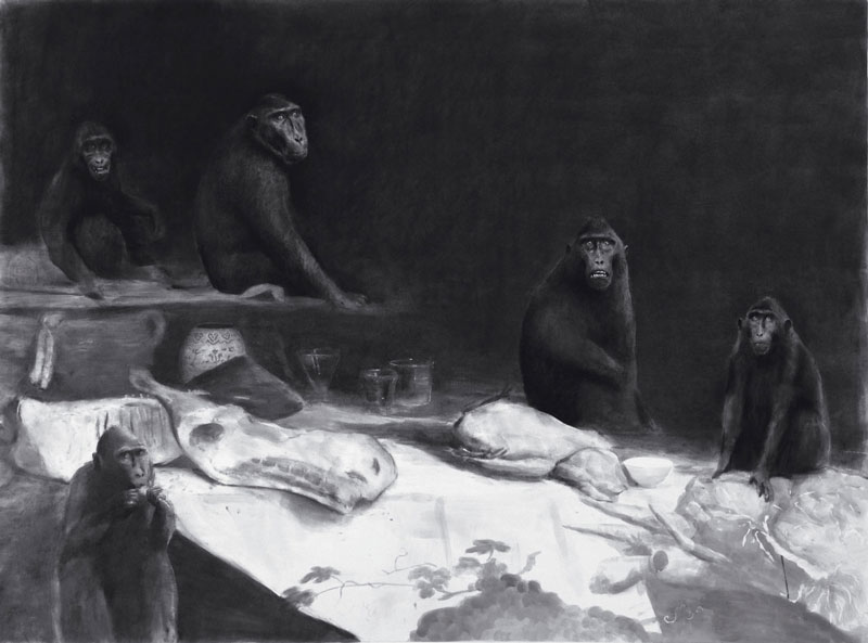 A narração translada em pequenos apontamentos, enfatiza-se a palavra, a imagem, renunciando, assim, a não-diálogos que fluem livremente no espaço, saltando de um tema para o outro, em que emergem através de gestos pictóricos, dilacera o espaço com longos silêncios. Por sua vez, as obras requerem um olhar de um conhecedor de arte, que saiba parar, olhar, ver e sentir, contemplar cada uma, e observar cada pormenor para percecionar os diversos mecanismos de visibilidade e de invisibilidade de uma obra de arte, captando, desta forma, os mistérios do ver. Ao debruçarmos atentamente para cada uma delas, tornamos visível o invisível, sentimos a história e a não-história, o tempo infinito e o perpétuo recomeço da pintura da História da Arte Ocidental. Assim, estabelece-se na fissura da tradição estética a obra de arte, enquanto lugar. Um lugar, onde brota o ser, o humano e não-humano, a condição humana e a natureza, o ser humano e o animal. O animal ecoa um passado, cuja linguagem nos remete para a tradição da pintura flamenga do século XVII e XVIII, através do contraste de luz e sombra, de claros-escuros, ou de cor e não-cor, que, por sua vez, quebra com ela mesma através do silêncio da contemporaneidade. Uma sensação de suspensão de tempo, que se translada através da ironia. Nesta série intitulada Terra, o artista mergulha na essência da condição humana. Os macacos ou os símios aludem ao mundo contemporâneo, porém, espelha a uma distante miragem do que se entende de Novo Mundo. Quase numa sátira social, observamos uma obra que nos desperta o olhar - Le Déjeuner sur l'herbe, em memória da obra (1863) de Edouard Manet. Assim, apreciamos as palavras de Bernardo Pinto de Almeida (2023):