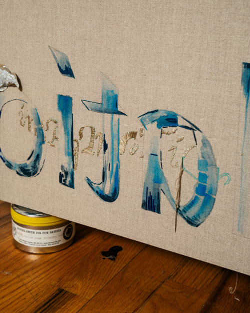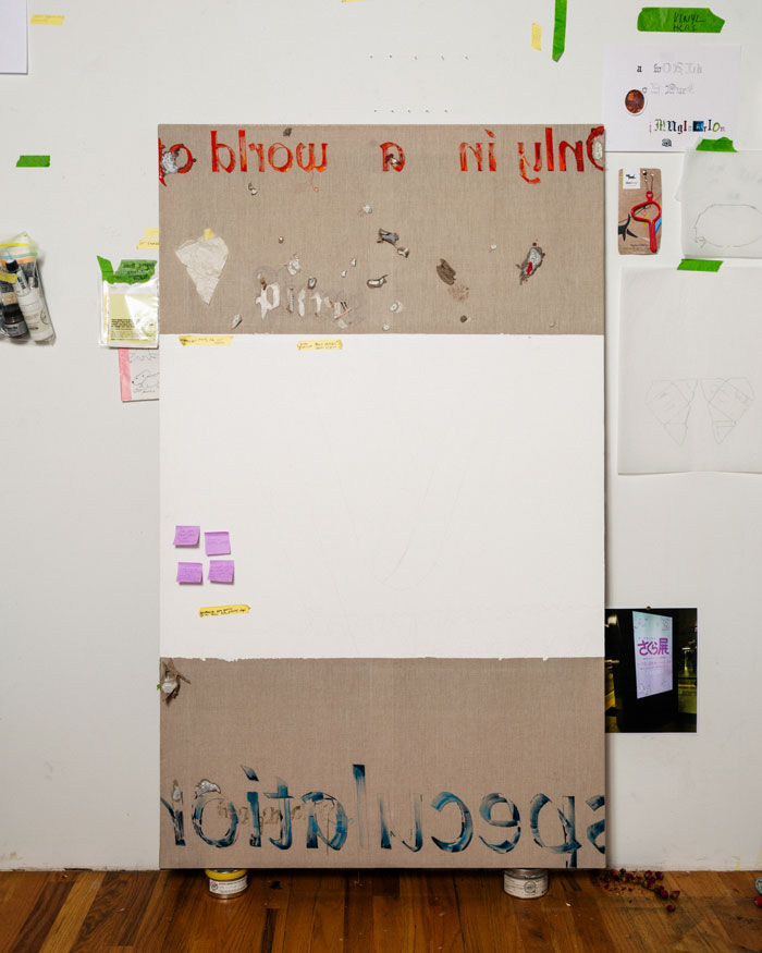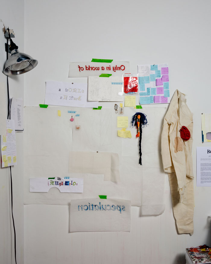 Blade Study presents Paige K. B.: Artist's Studio in the production of her booth, Very Beautiful Images With Quite A Bit Of Concerning Text Laid Over The Artwork, Booth #426. © Eric Helgas