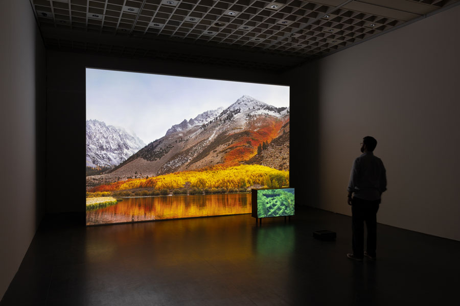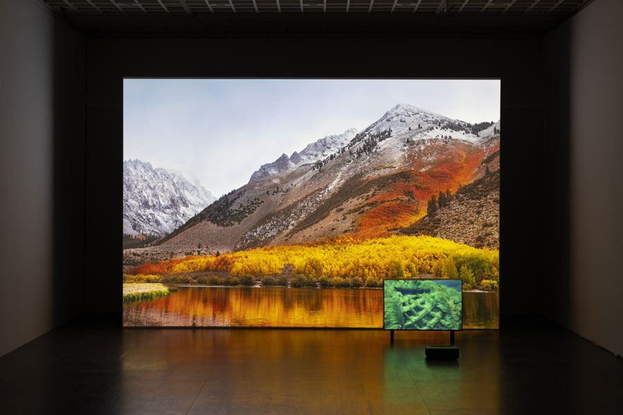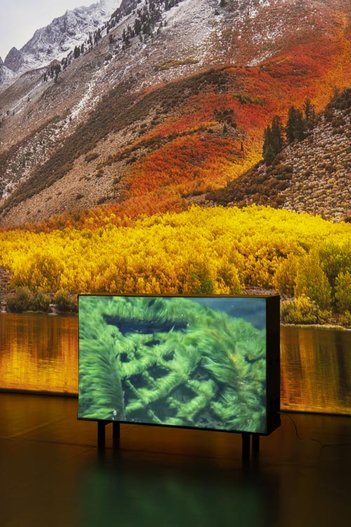 “A calma antes da tempestade” é a expressão que não me sai da cabeça, desde que fui capaz de abandonar a exposição de Alexandre Estrela, na Culturgest de Lisboa, intitulada “A Natureza Aborrece o Monstro” [1]. Antes sequer de entrarmos na sala, qualquer que seja o caminho que ousemos tomar, somos surpreendidos: vozes estranhas proferem palavras surdas, sons indistinguíveis remetem-nos para uma floresta exótica, luzes baixas antecipam qualquer coisa. Encontramo-nos num limbo entre a vontade de entrar e perceber o que nos aguarda e o medo daquilo que ainda desconhecemos, a aflição e o desassossego de nos depararmos com um tal monstro. O peso aumenta no peito, o movimento frenético das imagens que se sobrepõem umas às outras assalta-nos a visão, os focos de luz que rasgam o espaço cegam-nos, interrompendo qualquer sensação de paz e tranquilidade com que pudéssemos ter começado o percurso. O crescendo, não apenas sonoro, mas da confluência de todos estes fatores culmina no corpo nervoso do espectador. Ninguém está seguro. Há uma constante sensação de desequilíbrio e fascínio simultâneos, para quem se deixa verdadeiramente absorver pela experiência. Quem se atrever a entrar nesta exposição, com certeza não sairá de lá mais sereno. O universo peculiar e enigmático de Alexandre Estrela propõe experiências, que são tanto cativantes, quanto aterradoras e arrepiantes. O monstro, criatura bizarra do imaginário popular, que tanto se concretiza pela fusão de dois corpos distintos, qual um bicho híbrido entre o coelho e o pato [2]; como pelo potencial sinestésico que a própria palavra suscita. Dicotomia esta que apresenta no lado oposto a ideia de natureza, não só pela idealização de um Jardim das Delícias no qual reina a harmonia e a vida em liberdade, como também pela sua representação enquanto Gaia [3], a Mãe-Terra, que promete devorar tudo o que lhe causar mágoa e sofrimento. Como propõe José Gil, “Provavelmente, o homem só produz monstros por uma única razão: poder pensar a sua própria humanidade.” [4] “Um silêncio aterrador”, como diz o próprio artista, assola-nos – a inquietação que advém tende a aumentar na segunda volta à exposição. O compasso de espera adquiriu uma gravidade maior na experiência e revelou-a dolorosa. A temperatura da sala arrefeceu e o batimento cardíaco aumentou. Assim como nos planos estratégicos das tropas portuguesas durante as passagens pelos matos de Angola, reproduzidos e reportados intensamente no filme Africa Addio [5], o silêncio camuflado atravessa o espaço-tempo da exposição. Embora o impacto real do som, juntamente com o alvoroço das imagens em movimento, não tivesse sido tão potente como havia sido da primeira vez quando fui sobressaltada pelas diversas explosões sonoras (destoantes das imagens idílicas, porém misteriosas que servem de cenário), o fator surpresa tinha agora sido substituído pelo medo e a antecipação da sensação de desconforto e angústia provocadas pela própria experiência da exposição. No centro da imagem de uma praia, somos confrontados com um olho hipnotizante, um buraco negro [6]. O olhar é seduzido a fixar esse círculo fundo e inextinguível, logo depois para ser sobressaltado com o movimento vertiginoso de uma outra projeção de vídeo, que atravessa a sala e se vê refletido através de um jogo de espelhos. O nosso estado de alerta é ativado e, de repente, sentimo-nos sob pressão. O som ensurdecedor de um helicóptero traz com ele uma sensação de perigo e medo. Sentimo-nos em guerra, mas com quem? Voltamos à antiga e insaciável demanda do homem versus a máquina; o monstro versus a natureza. Por oposição, pequenos ecrãs de cores vibrantes e tons quentes presenteiam-nos com paisagens [7], ou partes delas, que parecem pairar no espaço, pelo desvanecimento dos seus limites no fundo, causado pela iluminação quase nula da sala. São pequenos momentos de tranquilidade, que contrastam com a ansiedade provocada pelo ruído intermitente e assustador que nos rodeia. Em contrapartida, existe um magnetismo inerente a toda a exposição, atingindo a sua potência máxima no corredor que vincula os dois hemisférios. Atraída pelo som hipnotizante que cobria toda aquela sala e, de forma mais ou menos consciente, senti o meu corpo aproximar-se de um ecrã metalizado, cuja superfície de alumínio refletia o brilho embriagante e as cores deslumbrantes de uma “caverna subaquática” [8]. De repente, um tubo fino de metal bate furiosamente sobre o ecrã, ecoando o som estridente de um sino ou badalo. À distância, avisto uma escultura com reentrâncias, uma circular e outra quadrada [9], que, por sua vez, faz ressoar a vibração de um gongo quando tocado, da qual superfície cintilante se revela. Após observar repetidamente o processo, percebi que essa placa de alumínio não tinha sido golpeada pela suposta baqueta e, consequentemente, não teria nunca oscilado, como até então eu jurava ter visto. Pela altura do fim da minha visita, começava a conformar-me com a ideia de que as projeções de vídeo teriam, de facto, uma função primordial no corpo de trabalho apresentado. A ambiguidade e o mistério provocados pelas obras de Alexandre Estrela, como refere o curador Bruno Marchand, constroem “propostas sinestésicas que tanto revelam quanto destabilizam a nossa perceção, questionando a sua mecânica, os seus limites e a sua fiabilidade.” É, portanto, inevitável pensar nesta questão da falsidade das imagens. Aquilo que eu via, ou pensava que via, não era afinal de contas totalmente verdadeiro [10]. Ora, na primeira vez que olhei para o amplificador de som, onde estava projetado um vídeo que mostrava uma rede debaixo de água coberta de musgo [11], reparei numas manchas escuras e estranhas que me pareciam ser dois peixes colados à lente da câmara que capturou a imagem. Porém, após observar mais atentamente o q