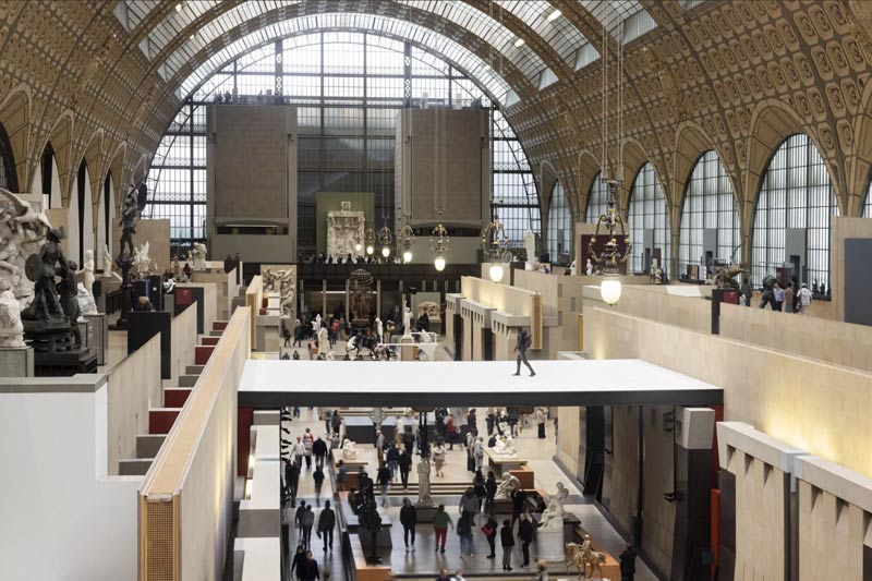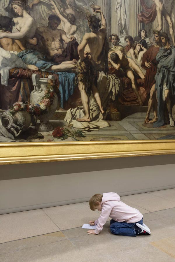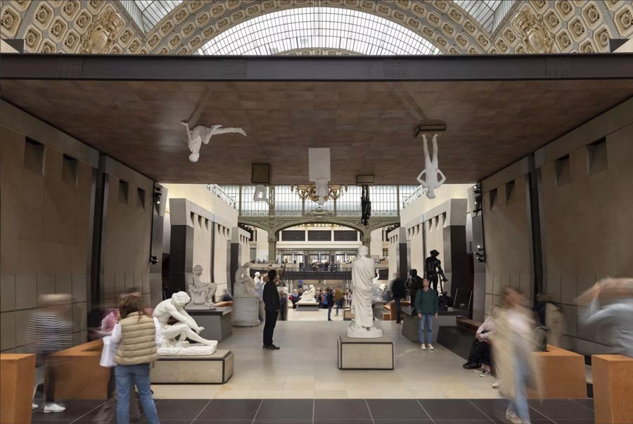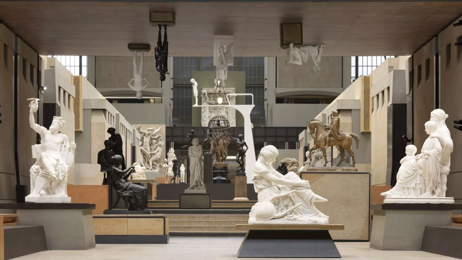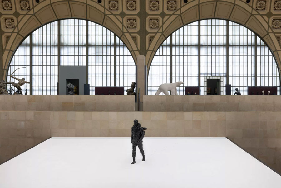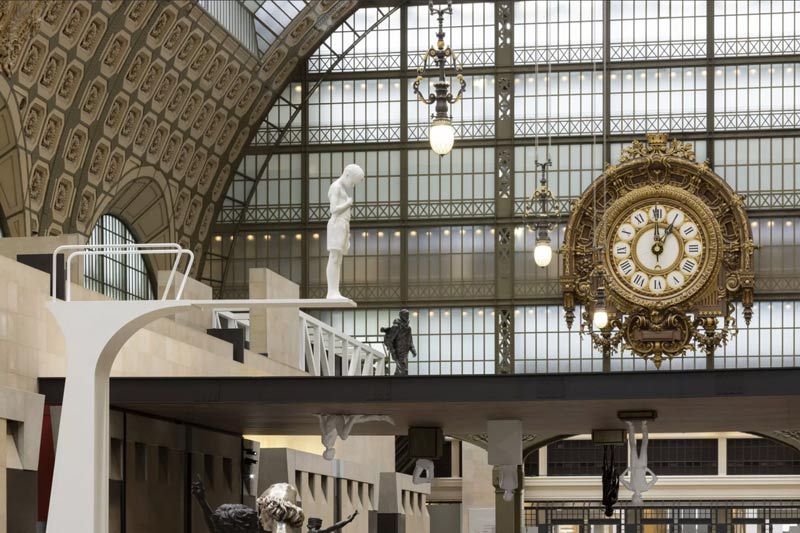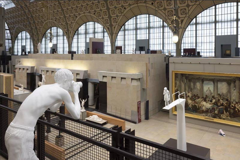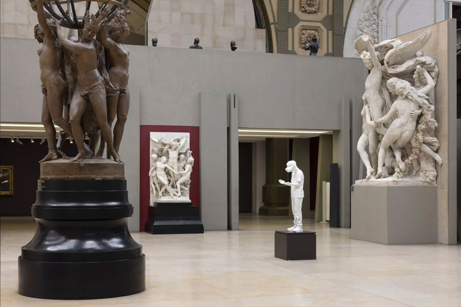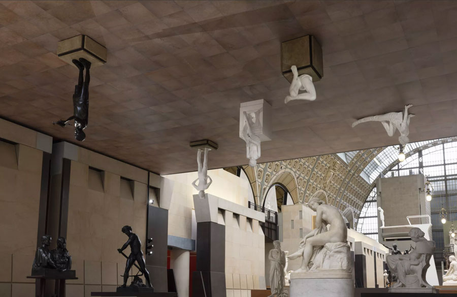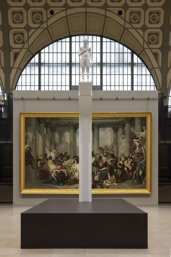 Nas suas instalações escultóricas, Elmgreen & Dragset destacam a complexidade de práticas e objectos banais do quotidiano, sublimando estes episódios familiares e não heróicos e dotando-os de um novo estatuto. Ao refutarem a forma como organizamos e vivenciamos os espaços públicos, a dupla de artistas introduz-nos constantemente a novas possibilidades de apresentar arte. Desde a transformação da Fundação Bohen de Nova Iorque numa estação de metro da 13th Street em 2004, à instalação Prada Marfa no deserto do Texas em 2005, ao The Welfare Show nas Serpentine Galleries em 2006, às suas contribuições para os Pavilhões Dinamarquês e Nórdico na Bienal de Veneza em 2009, até à sua piscina vertical gigante no Rockefeller Plaza em Nova Iorque em 2016, Elmgreen & Dragset criam instalações cativantes dotadas de um humor insólito que revelam simultaneamente a crítica institucional patente no trabalho da dupla. O título da exposição faz referência à instalação de esculturas adicionais neste espaço sublime, já repleto de arte, onde o icónico relógio da Belle Époque marca o tempo. L’Addition é também uma reflexão sobre o papel que a tecnologia desempenha na vida contemporânea, como revela a representação de figuras que interagem com dispositivos tecnológicos. Conscientes do poder que o contexto em que uma obra de arte é exposta tem na sua leitura e significado, a intervenção site-specific da dupla convida a percepcionar as esculturas do museu de um novo prisma ao estabelecer relações sincrónicas astutas com a sua colecção, arquitectura e história. A intervenção arquitectónica original na icónica gare convertida em museu d’Orsay é uma subversão criativa excepcional, em que os artistas brincam com a inversão da estrutura da nave do edifício. A dupla exibe toda uma série de novas esculturas de cabeça para baixo, que dialogam com as obras do século XIX na colecção expostas em permanência no mesmo local do salão principal há mais de quarenta anos. Elmgreen & Dragset privilegiaram de forma muito específica as expressões artísticas de uma masculinidade mais vulnerável no acervo e construíram esculturas que se relacionam com elas na temática e na gestualidade - mantendo os seus corpos em poses idênticas mas a interagirem com objectos e dispositivos modernos como drones, óculos de realidade virtual e auscultadores. A obra David ecoa o gesto de Chanteur florentin du XVe siècle (1865) de Paul Dubois. As duas peças incentivam-nos a imaginar o que os dois jovens estarão a ouvir. Apesar da temporalidade histórica que separa o rapaz contemporâneo com auscultadores do cantor florentino a tocar bandolim, há um paralelismo na experiência de ambos. Também Boy with Drone imita, com a mesma sagacidade, o gesto do Anacréon (1851) de Eugène Guillaume. A nossa expectativa de ver o pássaro, pousado na chávena que Anacréon segura firmemente, abrir as asas e voar é equivalente à de ver o drone, no braço estendido da criança moldada por Elmgreen & Dragset, ser activado e levantar voo. Os rapazes de This Is How We Play Together parecem estar tão imersos no universo que vivenciam nos seus dispositivos de realidade virtual quanto o jovem Aristóteles no estudo do seu manuscrito em Jeunesse d'Aristotle (c. 1875) de Charles De George. Ambas as figuras absortas na aprendizagem e na curiosidade tão típicas do crescimento e da formação da identidade na juventude. Nestas instalações escultóricas, a dupla de artistas explora a omnipresença da tecnologia nas nossas vidas e a forma como ela se tem vindo a tornar numa extensão de nós mesmos. As figuras dos Elmgreen & Dragset reflectem também o isolamento que advém da nossa absorção no mundo digital, ao ponto de vivermos cada vez mais momentos completamente privados mesmo em espaços totalmente públicos. Podemos lê-las como um convite à avaliação do nosso grau de envolvimento com a tecnologia e com a sociedade. A obra 60 minutes, é mais um exemplo do interesse dos artistas em memorializar as experiências triviais do quotidiano. A peça é uma cópia de um objeto mundano tipicamente reservado à lavagem da roupa, um evento tão banal que parece não merecer ser comemorado. A forma cúbica da máquina de lavar roupa é lida alternativamente como plinto para a escultura do rapaz sentado. Este trabalho faz-nos pensar em como existimos nas nossas casas neste momento histórico em que as partilhamos com a tecnologia a um nível tão elevado. Um aspeto central na prática de Elmgreen & Dragset é a proposição de utilizações intencionalmente incorrectas de espaços, edifícios, situações sociais e objectos. Esta estratégia pretende demonstrar como o normativo no que aceitamos como sendo natural pode ser reformulado numa perspectiva peculiar. Há uma complexidade inerente a todas as coisas que permite sempre abertura para diferentes modos de ver. Ao alterarem de forma dramática as configurações espaciais expositivas, os artistas fomentam um discurso renovado em torno da exibição de arte. Em L’Addition, Elmgreen & Dragset justapõem esculturas figurativas contemporâneas aos seus referenciais históricos num sistema complexo de conotações, condições perceptivas e associações que cria um diálogo interessante entre as práticas escultóricas de representação do corpo masculino ao longo dos séculos. Moldadas em materiais tão distintos como o silicone e o bronze, as obras da dupla contemplam uma hiper-realidade enquanto reinterpretam formas históricas. O Desenho representa um adolescente ajoelhado a desenhar em frente à pintura monumental de Thomas Couture Les Romains de la décadence (1847). O grau de hiper-realismo da escultura é inclusive reforçado com o uso de roupas reais sobre a figura de silicone. Facilmente confundimos o rapaz curvado sobre uma folha de papel com uma criança real. Faz-nos lembrar um aluno que ficou para trás do seu grupo numa vi