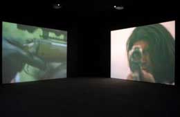 CHRISTIAN MARCLAYCrossfireWHITE CUBE - BERMONDSEY 144 – 152 Bermondsey Street London SE1 3TQ 01 FEV - 10 MAR 2007 Após o grande sucesso da exposição do artista, músico e dj americano Christian Marclay (Califórnia, 1955) no Barbican Centre em 2005, a nova vÃdeo-instalação e o grupo de imagens apresentados na galeria White Cube volta a mostrar em Inglaterra o trabalho brilhante de um artista pouco conhecido pelo grande público. Activo como artista plástico desde o inÃcio dos anos oitenta, Christian Marclay desenvolve um trabalho muito particular ao explorar as relações e as possÃveis formas de articulação entre som e imagem. Marclay recorre frequentemente ao uso de colagens em que junta excertos de composições visuais associadas à industria e ao marketing discográfico e com as quais realiza imagens, objectos e grandes instalações que apresentam uma notória exuberância e uma estética entre o Glam e o Pop. Na exposição patente na White Cube, o artista prossegue o seu desenvolvimento de um hipotético vocabulário entre música e imagem e a sua transposição do som para uma forma visÃvel, abrindo um espaço infinito entre as possibilidades daquilo que ouvimos e do que vemos. “Little Bill Daggett: I suppose you know, Bob, if I ever see you again I´m just going to start shooting and figure it was self-defense. Bill Munny: I´ve killed women and children. I´ve killed everything that walks or crawls at one time or another. And I´m here to kill you, Little Bill, for what you done to Ned.†(excerto de um diálogo entre Clint Eastwood e Gene Hackman do filme Unforgiven, Clint Eastwood, 1992) “Crossfire†(8’30’’, 2007) a obra que dá o nome a toda a mostra, consiste numa instalação vÃdeo de quatro canais, cada um projectado numa das paredes da sala. Um ruÃdo forte e agressivo que se propaga em toda a galeria antecede a sua visualização, não permitindo, contudo, identificar claramente da sua origem. Ao penetrar no espaço, o visitante vê-se confrontado com quatro projecções gigantescas de cenas de tiroteio, que se alternam a grande velocidade, como que realizando um diálogo entre si. Encontrando-se no meio deste fogo cruzado, sem qualquer possibilidade de fuga a um ataque que chega, de um modo ruidoso quanto rápido, de todas as partes, nada mais lhe resta do que procurar reconhecer os inúmeros excertos - editados de forma excelente - que se repetem nas diversas projecções e com uma cadência que remete para certas obras de Bruce Nauman e de Candice Breitz. O ritmo sonoro cria um impacto muito forte que, há medida que o tempo passa, gera efeitos melódicos inesperados que confirmam ainda mais o editing excelente de toda a composição. Em certos momentos, o que se vê – e se ouve – é apenas o ritual de preparação do tiroteio: rumores de gatilhos e de armas a serem carregadas que antecedem e preparam para o que está para acontecer. O ritmo, em crescendo, cria um suspense muito semelhante ao gerado pelos filmes de acção dos quais os excertos foram retirados e atinge o auge, quando, novamente, o artista retoma as cenas de grande violência e impacto, sonoro e visual. Utilizando um processo semelhante na transposição de sons para imagens nas obras em papel que apresenta, Marclay desenvolve uma série de seis trabalhos (“Skiilpâ€, “Visshh!â€, “Shtoomâ€, “Whompâ€, “Aaaaahhh†e “Click Clickâ€, todas de 2006) realizados a partir de colagens de pequenos fragmentos de comics americanos. Utilizando a onomatopeia de forma tautológica, Marclay cria imagens a partir de expressões verbais de rumores fortes, remetendo para certas obras de Roy Lichstenstein (como a célebre “Whaam!â€, 1963), não só pelo uso da palavra associada a um som mas também pela forma como amplia a imagem de banda desenhada a uma escala muito superior à natural, gerando bandas cromáticas que enfatizam a materialidade do papel e as cores da figura original. Toda a exposição ganha a sua força no acto de retirar certos excertos do seu contexto narrativo original, conferindo-lhes, através deste processo de descontextualização, uma liberdade e uma força insuspeitáveis.