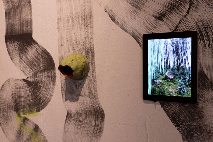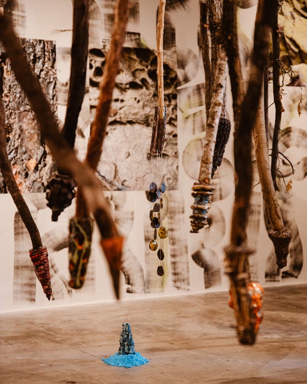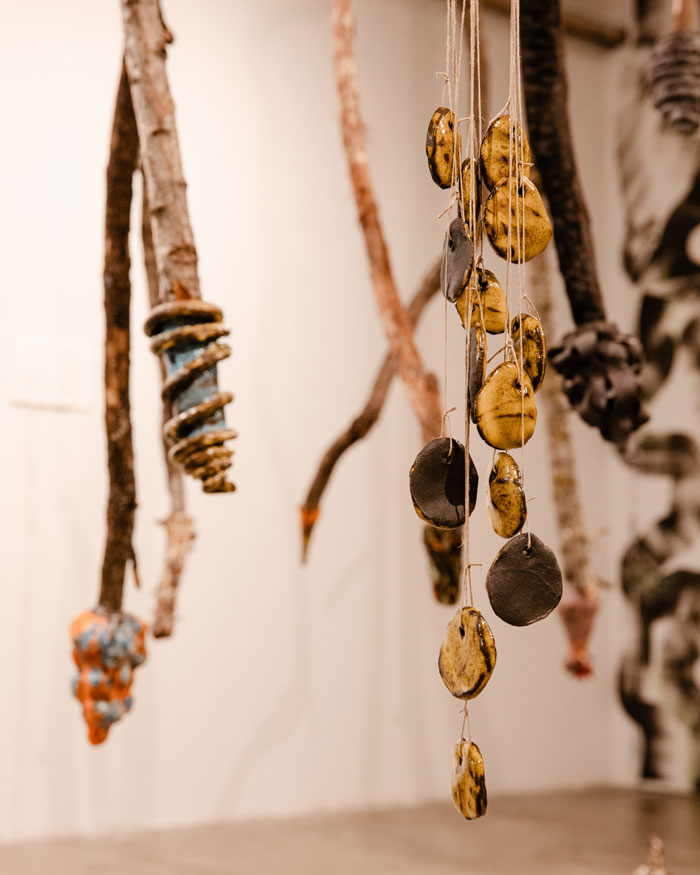 Ainda na sala principal, ramos de árvores suspensos apresentam coroas de cerâmica brilhantes. Nas extremidades dos ramos, onde deveriam existir as raízes ou as fibras da madeira, encontram-se formas escultóricas cobertas por vidrados coloridos e reluzentes. Funcionam como uma extensão do próprio organismo e, de repente, um novo ser emerge. Artificial e orgânico fundem-se, para dar origem a uma matéria única, onde a natureza e a escultura se (con)fundem. “Gramáticas Pardas” apresenta uma constelação de gestos que se prolongam uns nos outros. São inscrições de passagem, marcas deixadas num território em permanente transformação. A madeira parece recordar a violência lenta do tempo; a pedra, a persistência do que resiste; o vídeo, a impermanência que insiste em apagar e reinscrever. Como diz Ana Anacleto, “Talvez estejamos a falar de uma gramática da invisibilidade, que atravessa paisagens, corpos, memórias e territórios descartados, periféricos, semi-ocultos fixando-se precisamente na sua condição de liminaridade.”