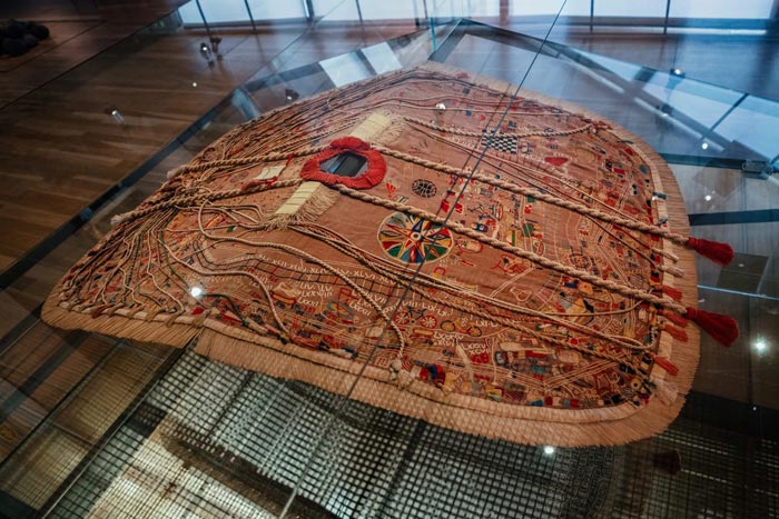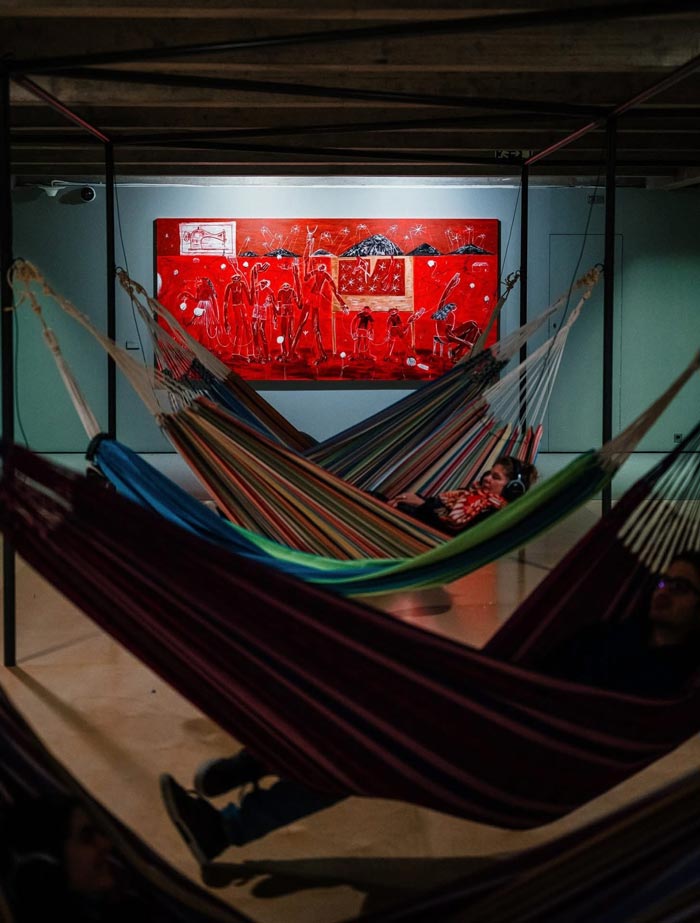 E nesse sentido, complexo brasil, exposição inaugurada na Gulbenkian em Novembro de 2025 com a curadoria de José Miguel Wisnik, Milena Britto, Guilherme Wisnik e projeto expositivo de Daniela Thomas, acerta na dissolução da unidade para revelar a vastidão e diversidade de um país que, valha a contagem oficial, é novo, e conta, com a sua história, uma história que é maior que ele mesmo. Ambiciosa e representativa daquilo que busca convocar, a exposição de 1600 m2 na Fundação Gulbenkian abarca (ou pretende abarcar) a quase totalidade da história e da cultura brasileira por meio de um panorama culturalista de diferentes regiões e fases. Na esteira dos diálogos transatlânticos cuja exposição de Paula Rego e Adriana Varejão é um exemplo, a Gulbenkian dedica dois pisos à tarefa que os curadores se propuseram: narrar o Brasil / os Brasis por meio de uma escolha de obras expressivas. O formato expositivo remete a uma estética antropológica de exposição dos povos: dividido por regiões e/ou culturas, a exposição resvala em um carácter pedagógico e histórico, também porque dotado de um viés culturalista. A imensidão do acervo é impressionante e deve-se também à sua diversidade: pintura, fotografia, instalação, vídeo, literatura, poesia – estão todas lá. De Cláudia Andujar a Clarice Lispector, de Pedro Américo a Denilson Baniwa, Bispo do Rosário a Oscar Niemayer, o Brasil é apresentado pelos melhores espíritos que já passaram por esta terra, revelando uma amplitude marcante de obras e temas. É atravessado, também por isso, pela implicação do passado no presente e dotado de um forte espírito decolonial, sublinhando nas ruínas da história colonial o aspecto bárbaro que existe na suposta civilização. É em uma arquitetura livre e ampla, que convoca o tempo e o caos organizado, que o complexo brasil revela ao mesmo tempo a riqueza e a exuberância da cultura brasileira e sublinha a inscrição e os efeitos do colonialismo nos povos africanos e indígenas, na estrutura sócio-económica do país e na sua psique nacional. Linha norteadora da exposição, a cultura brasileira é apresentada como inextricavelmente produzida/destruída pela violência colonial, pela inscrição material do racismo e pelo abatimento de culturas ricas e complexas por meio da demonização de práticas e povos. Fá-lo por meio de obras às vezes duras e às vezes fantásticas, dividindo sua energia entre a expressão de identidades solapadas pelo colonialismo e a reconfiguração do passado durante o processo histórico. Um exemplo emblemático são os quadros históricos que retratam práticas canibais e que acompanham a consequente apropriação modernista desse imaginário, na década de 20, no campo da cultura. A obra no início da exposição é emblemática do que pretende convocar. Uma árvore/madeira retorcida, obra de Henrique Oliveira, recebe os visitantes à entrada: chama-se O Retorno. O tempo tem caminhos misteriosos e aquilo que fazemos sempre está connosco onde quer que estejamos. A obra, que antecede a primeira parte da exposição, dedicada às culturas indígenas, funciona como uma mensagem a respeito das fleurs du mal plantadas pela cultura colonial no país – e as árvores, plantas, obras, músicas, esculturas, arquiteturas, violências e fracturas que daí surgiram. As obras aparecem, nesse sentido, ora como representações narrativas de uma história, ora como expressões do atravessamento sensível da história e da violência nos corpos artísticos, revelando a constante desconfiguração e reconfiguração linguística, psicológica e física necessária para lidar com a violência que marca a história do país. É o caso por exemplo do Manto de Arthur Bispo do Rosário, peça belissimamente exposta no primeiro piso da exposição. Bordado com palavras, símbolos e números, feito de uma bricolage de tecidos desfiados, o Manto é uma tentativa de reconciliar o eu ao uno, registrando memórias e emblemas em um manto que é continuidade e testemunha de um eu psicótico ou mágico, atravessado por tensões históricas. Foi confeccionado para ser usado, segundo ele, diante de Deus no dia da sua passagem. Tendo vivido anos de sua vida em instituições psiquiátricas, o trabalho de Bispo do Rosário revela não só o atravessamento da religião no seu trabalho, como questiona as fronteiras entre desorganização psíquica, misticismo e violência institucional em um objeto que funciona ao mesmo tempo como proteção e como emblema. De facto, no Brasil, o extraordinário e o cotidiano, a fé e a mendicância, a violência e a cegueira, o canibalismo e a antropofagia configuram uma encruzilhada constante, em que há sempre uma história de histórias, uma estrada de estradas e um tempo cheio de contradições onde pulsa o coração do país. Próximo de fotografias de Claudia Andujar, das histórias do cangaço brasileiro, de cabeças decepadas, do anúncio documental de escravos fugidos e dos esforços ‘progressistas’ de destruição da Amazónia, a exposição é uma panóplia de arte e história, sublinhando a violência estruturante da experiência nacional, bem como a exuberante pluralidade de formas estéticas que se inscrevem na cultura brasileira. Como sintoma, como vingança ou como simples ímpeto criador, as obras apresentadas aparecem sobretudo como uma expressão da história nacional, registro do movimento de dominação, contradição, transformação e metamorfose que atravessou as suas geografias e povos. No meio disto tudo encontram-se também as vanguardas estéticas que se dedicaram a pensar, pintar e construir esteticamente o país – seja o modernismo arquitetónico brasileiro, sejam as vanguardas concretistas e neo concretistas, expostas como poesia e como design – e que revelam as mudanças materiais advindas da segunda metade do século XX bem como o projeto político de dar contorno à identidade nacional por m