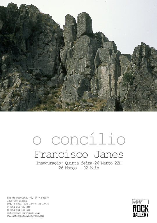 Francisco Janes vive e trabalha em Lisboa. Nasceu em Novembro de 1981. Frequentou o curso Filologia e Literatura Moderna Inglesa e Portuguesa na Faculdade de Letras da Universidade de Lisboa; Posteriormente, inscreveu-se em Fotografia no Ar.Co, tendo concluÃdo o Curso Avançado de Fotografia em 2007 e o Programa de Projecto Individual em 2008. Foi-lhe atribuÃda a Bolsa Ernesto de Sousa 2008. Sobre estar presente. Algumas lacónicas e desordenadas palavras sobre o concÃlio de Francisco Janes o concÃlio, instalação composta por três projecções de imagem e por diversos excertos sonoros (água, vento, fogo, o canto de um pássaro), é o projecto mais complexo e, não por acaso, mais extenso, no que ao tempo de preparação concerne, que Francisco Janes realizou até à data. Trata-se de um projecto exemplar do processo de trabalho do autor: está indelével e estruturalmente marcado pela ideia de experiência e, mais do que isso, pela vontade de materializar, de traduzir, de propiciar essa experiência ao espectador; desconstrói a ideia de linguagem e de disciplina em favor da de dispositivo; parte, como outros projectos da sua autoria, de um lugar especÃfico, algures na Serra da Estrela, nascendo de longas caminhadas, de estadas solitárias, de um monólogo interior, num lugar cuja reverberação ecoa um tempo geológico e original. Nesse sentido, as suas peças têm uma qualidade de ambiente, são dispositivos que estão para além de uma ideia de instalação para se afirmarem como abertura para outro espaço, a um tempo, mais amplo, distante e preciso. O espaço do encontro entre fenómeno e consciência. No curto espaço em que cabe esta apresentação, gostaria de isolar um facto suficientemente raro no nosso contexto para ser realçado, a vizinhança ou contiguidade, um encontro, entre trabalhos de autores e épocas diversas. Refiro-me ao filme "A manta vermelha" que dialoga, consciente ou não desse diálogo, como nenhuma outra peça o tinha feito até hoje na arte portuguesa, com esses "ovni" que são as experiências fÃlmicas de Ângelo de Sousa nos anos 70. Como naqueles, a câmara torna-se num dispositivo háptico que se abre aos sortilégios da realidade envolvente. Como um olho, somente menos avisado e menos perfeito, molda-se ao fenómeno conferindo-lhe qualidades próprias da percepção da imagem (cor, luz, difusão, temperatura), produzindo, como nos filmes de Ângelo, efeitos visuais de intenso fulgor pictórico. Falar de encontro não seria mais apropriado que falar de cinema, no caso vertente. Antes de mais, encontro consigo próprio, que é aquilo que o trabalho do autor, fortemente ancorado numa atenção e num escrutÃnio constantes ao fluxo do pensamento e das sensações, essencialmente mapeia e regista. Espaço (e tempo) do cinema, no sentido de configurar uma experiência propriamente fÃsica e comunitária. Tudo o mais, que é o essencial, joga-se num constante movimento dialéctico entre ver e ouvir, pensar e estar, projectar e interiorizar, entre frio e calor, a névoa e a pedra, o fogo e a água, a imagem e a palavra. Nuno Faria, Março 2009 A ROCK Gallery localiza-se no edifÃcio "TransBoavista", especificamente na Rua da Boavista 84, em Lisboa. Apresenta-se como uma galeria com o intuito de promover exposições de artistas -emergentes- com uma visão actual da arte contemporânea, e um percurso construido no séc. XXI. É uma galeria inquietante e de emoção. A ROCK Gallery preconiza o ideal de actuar como uma interacção de novas ideias, de forma a criar o perfeito contexto para artistas, crÃticos e coleccionadores. Horário: Terça a Sábado, das 14:00 à s 19:30H Rua da Boavista 84, 2º and - sala 5 / 1200-068 Lisboa - Portugal Tel: +351 213 433 259 Tm: +351 96 110 65 90 Email: vpf.rockgallery@gmail.com Rock Gallery presents itself as a gallery with the intention of promoting exhibitions of young artists with a current vision of the contemporary art, and a distance set up as the XXI century. It extols the ideal of acting like an interaction of new ideas of form to create the perfect context for artists, critics and collectors. Rock Gallery came out of the need to give a change to young artists show their works, on the other side like it is consequence of the strategy that begun with the opening in 2005 of the expositive spaces VPFCream Art and Platform Revolver in the same building