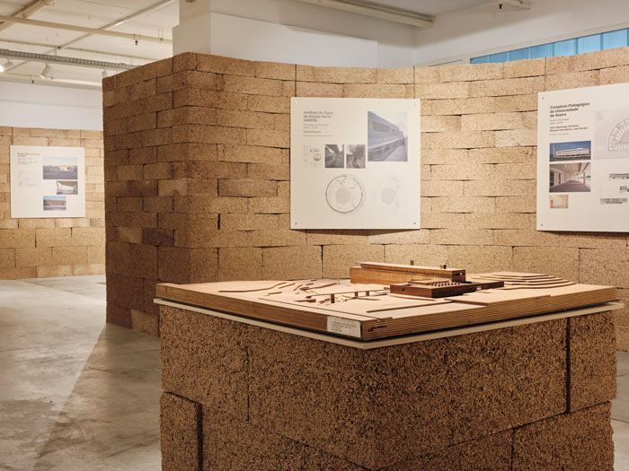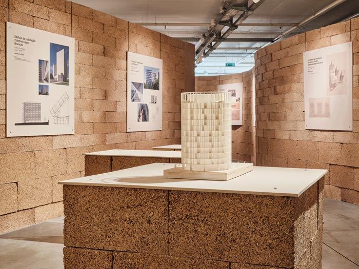 A montagem acompanha essa intenção com meios deliberadamente sóbrios. A exposição assenta sobretudo em fotografias, complementadas por desenhos técnicos, algumas maquetas [2] e, mais pontualmente, vídeos. À entrada, a sala maioritariamente revestida por blocos de cânhamo impõe desde logo uma atmosfera contida, quase austera. O visitante encontra primeiro uma sucessão de imagens organizadas com clareza, distribuídas por mesas e painéis murais, acompanhadas por pequenos desenhos e legendas reduzidas ao essencial. O percurso lê-se sem dificuldade. Essa contenção revela-se eficaz: torna a mostra acessível a um público mais vasto e evita o excesso documental que tantas vezes transforma exposições de arquitectura em dispositivos opacos, defensivos ou excessivamente disciplinares. Entre os momentos mais conseguidos contam-se a apresentação do projecto de Valorização da Fortaleza de Sagres, de João Carreira, a partir das páginas do Jornal dos Arquitectos de Julho/Agosto de 1989; a do Parque da Cidade do Porto, apoiada por um vídeo que reconstitui a história do projecto; e a inclusão de excertos de Neighbors, o vídeo apresentado na representação portuguesa na Bienal de Veneza, em que Álvaro Siza revisita conjuntos de habitação social por si projectados, neste caso em Haia.