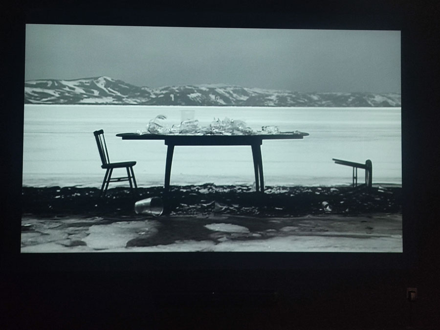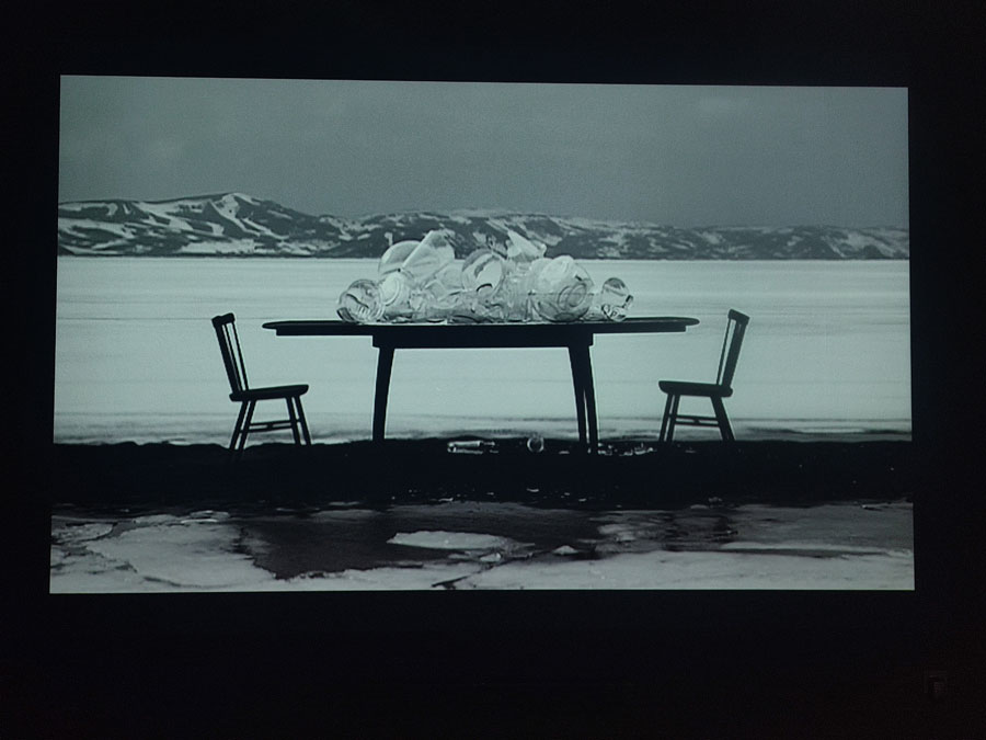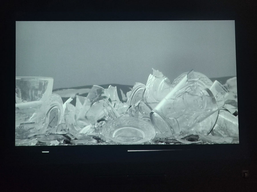 Esta paisagem sonora é dominada pelo som de tiros e de vidro a ser partido pelo tiroteio. O vídeo apresenta uma mesa retangular, com louça feita de vidro em cima, e duas cadeiras nos seus extremos. Esta mise-en-scène está posta na margem de um lago, que por sua vez avista ao fundo uma montanha não muito dramática, mas com neve. O filme é a preto-e-branco, o que sublinha o contraste da neve com o negro do solo, fazendo questão que a montanha não seja ‘só paisagem’. Os grandes-planos focam-se nos cacos, no caos, nos pós e no impacto que os tiros causam ao vidro, entrando em diálogo direto com a abordagem escolhida para esta exposição retrospetiva, que se apoia na ideia de arquivo fragmentado, em cima da mesa.