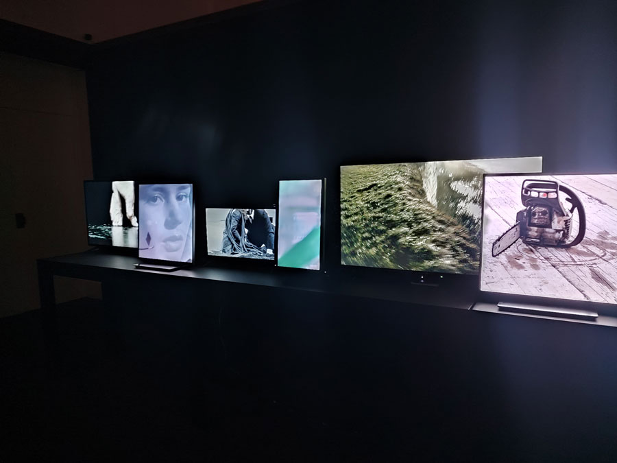 Aquele ecrã que em The Dark Side of the Loop abraça os outros ecrãs, também destaca a paisagem, e presenteia-nos com um dos aspetos que mais me fascinou no seu trabalho: através de um sentido de trans-corporeidade (Stacy Alaimo) há a exploração da fricção entre as superfícies duras e moles, diferentes estados sólidos e líquidos, quer no plano físico quer no plano emocional. Falo de trans-corporeidade, pois quer nos vídeos apresentados na exposição, quer em ARSA, há um vai e vem entre fronteiras físicas que identifico com a definição de Alaimo: uma nova materialidade que se foca no sentir os sentidos como substancialmente e perpetuamente interconectados com o fluxo das substâncias e agência do meio em que nos inserimos [2].