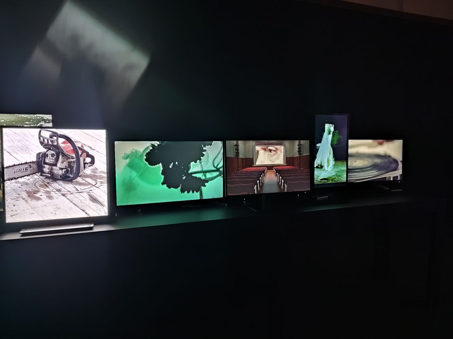 Federico Rudari: Com a apresentação do filme ARSA a acontecer em Lisboa, a ideia era como é que podemos também introduzir de uma forma mais sólida e mais completa um trabalho que, na verdade, só resultou... o cinema sucede depois da videoarte. Ou seja, a videoarte vem muito antes do cinema. Eles nunca tinham apresentado uma exposição individual em Portugal e eles têm vindo a pensar e a trabalhar muito a instalação. Quando eu e a Orsula fomos convidados através da Festa do Cinema, a ideia era através do meio da instalação, criar uma ideia de retrospetiva. Nós não queríamos perder esses elementos através de uma... Não sei, de uma… outra opção era fazer por exemplo fazer uma screening night. Tínhamos de ter vários filmes, mas ia-se perder a ideia de tudo a acontecer ao mesmo tempo, que é um pouco isso da instalação, de vários elementos que encontramos num objeto. Portanto tivemos focados em mantermos esta forma de trabalhar com a instalação (…) e que ao mesmo tempo, nos permite ser mais abrangentes do que apresentando só um vídeo para um público que não conhece muito o trabalho deles. Portanto, eles depois, como falávamos há pouco, partilharam connosco qualquer elemento da mesa, era muito importante para eles. E a partir daí, pensámos nesta dualidade de um vídeo, integrando a imersão, e outros elementos que pudessem dialogar no espaço com esse trabalho. Todos aqueles fragmentos fazem parte de uma peça que tem um título, que tem uma data, que tem uma primeira apresentação. Portanto, a ideia era, se nós não estamos a apresentar peças ou obras completas, também vale a pena tirar as marcas clássicas das obras, como o título, o material, etc. Isto é para deixar o máximo de liberdade interpretativa antes de ter uma ajuda, uma introdução ao trabalho; outra coisa que nós também trabalhámos e que acho interessante, é que quisemos a escuridão para impedir a leitura da folha de sala. A experiência tem que acontecer, antes de ler o texto, para não perturbar a leitura individual.