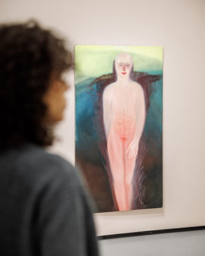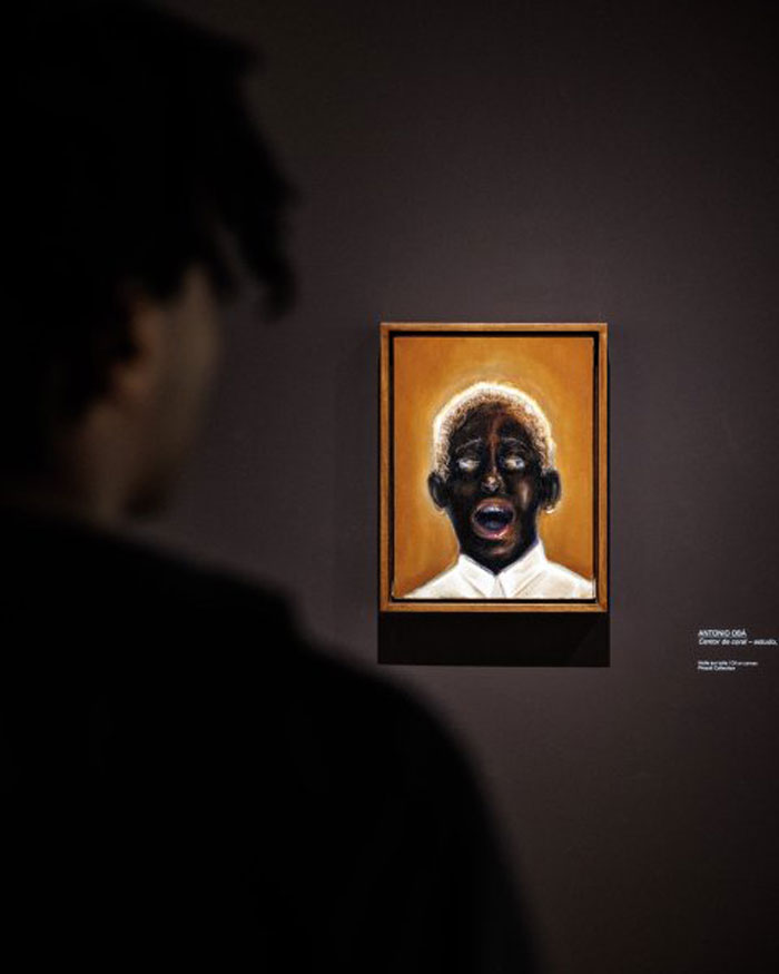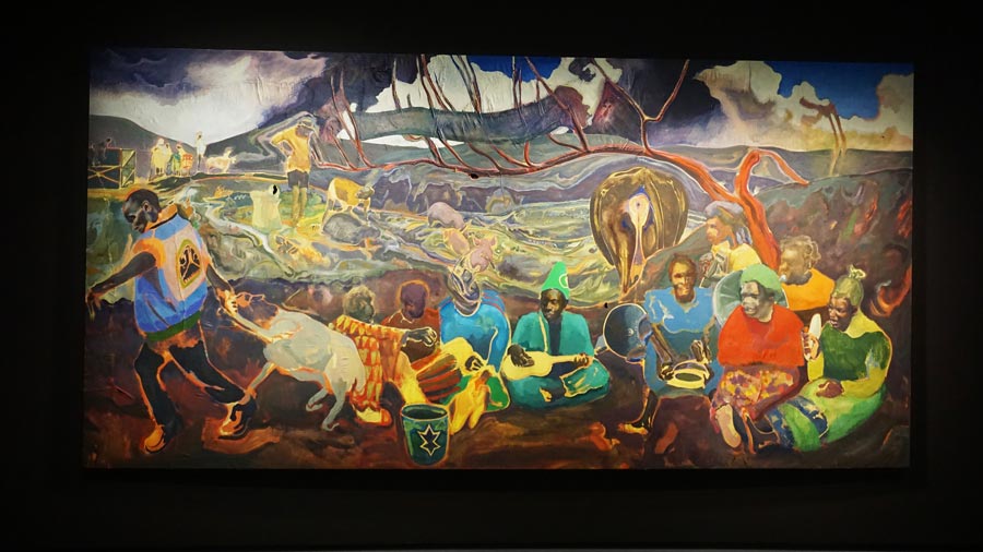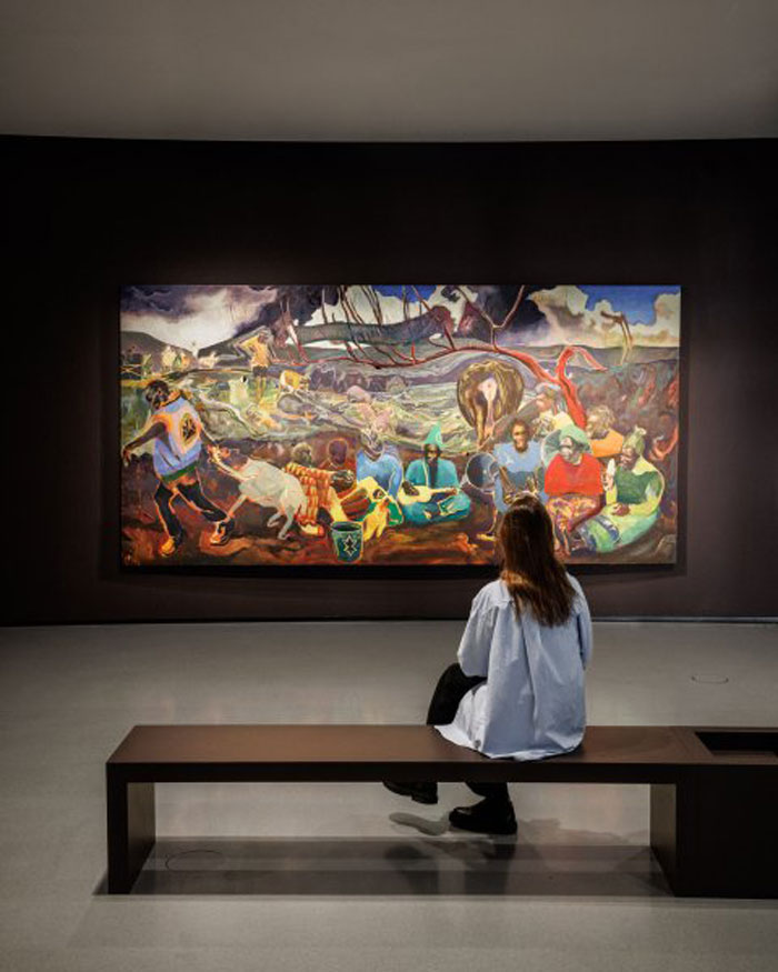 É a narrativa pura e dura que nos coloca em linhas de imaginação, a questão surge em perceber porque é que esconder o que nos fez chegar até aqui é mais bem aceite do que entender a profundidade que Rosa Montero nos transmite ao citar Siri Hustvedt: “Há em mim uma mulher atormentada e outra que observa” [1]. A questão do género está presente em todas as suas obras, assim como o exílio, pensando na sua produção como uma denúncia, ponto de reflexão e elaboração. Digerindo a ideia de projeto presente na ação de se exilar, entendendo-o numa dimensão em que o corpo consciente, razão e sentimentos, é inteiro tocado, e por isso não só considerado o ato na sua forma mais burocrática e institucional, assim como nos faz entender Ana Mendieta e refere bell hooks citando Paulo Freire, o exílio enquanto uma prática de conexão e desconstrução da localização geográfica e estados psicológicos. A obra Dandora (Xala, Musicians) (2022), de Michael Armitage. Um universo, desde os materiais, as cores, que o artista utiliza até os contextos que pinta. As obras de Armitage precisam de ser vistas ao vivo, principalmente sobre o espaço em que se soube escolher exatamente qual a melhor cor da parede e a luz perfeita que irá sustentar tanta abundância. Cada olhar é um suspiro de uma conversa interna que leva qualquer um para onde convoca a vulnerabilidade. Tem textura, na utilização de Lubugo, um tecido de casca da figueira tradicionalmente utilizado para rituais fúnebres, proveniente do Uganda, que como base da tinta a óleo permite a intensificação da cor de uma forma muito poética. O verde, amarelo, laranja, vermelho, o castanho meio roxo e o azul, não são simplesmente vibrantes, parece que o Lubugo absorve a cor e dá vida, tanto que, mesmo independentemente dos tons frios ou quentes, o quadro parte de uma tonalidade muito própria. Vêm-se os buracos da cortiça ao longo do que constitui a tela e os agrafos que unem os vários pedaços. Não se observava algo assim desde o cinema produzido por cineastas africanos que souberam transmitir África com toda a complexidade que lhe é característica: não existe um só acontecimento. A unilateralidade chega a ser uma farsa. Dandora é uma obra de aproximadamente 220 × 440 cm. Na descrição refere-se que Dandora é o maior aterro a céu aberto de Nairobi onde vivem, nas proximidades, cerca de um milhão de pessoas. O termo «Xala» refere-se, não por acaso, ao romance e filme do artista senegalês Ousmane Sembène, que retrata a corrupção das elites pouco depois da independência, tendo Armitage se inspirado numa sequência. Cave (2021) simbolizou a obra que faz a exposição parecer sobre a vida do espectador por despertar tantas emoções, perplexidade, êxtase, vontade de sentar nos assentos espalhados pela exposição e ficar ali só a contemplar. Fruir. Viver para ser tocada por mais arte, viver da arte, ser artista. A obra parece toda ela uma rocha sedimentar que reúne duas pessoas, vários corpos, fetos, animais, a natureza em interação. Talvez seja isso que representa Corps et âmes ou o que simbolizou esta visita a um espaço onde a esperança pode residir. A natureza em interação.