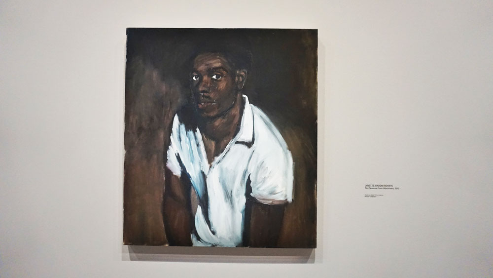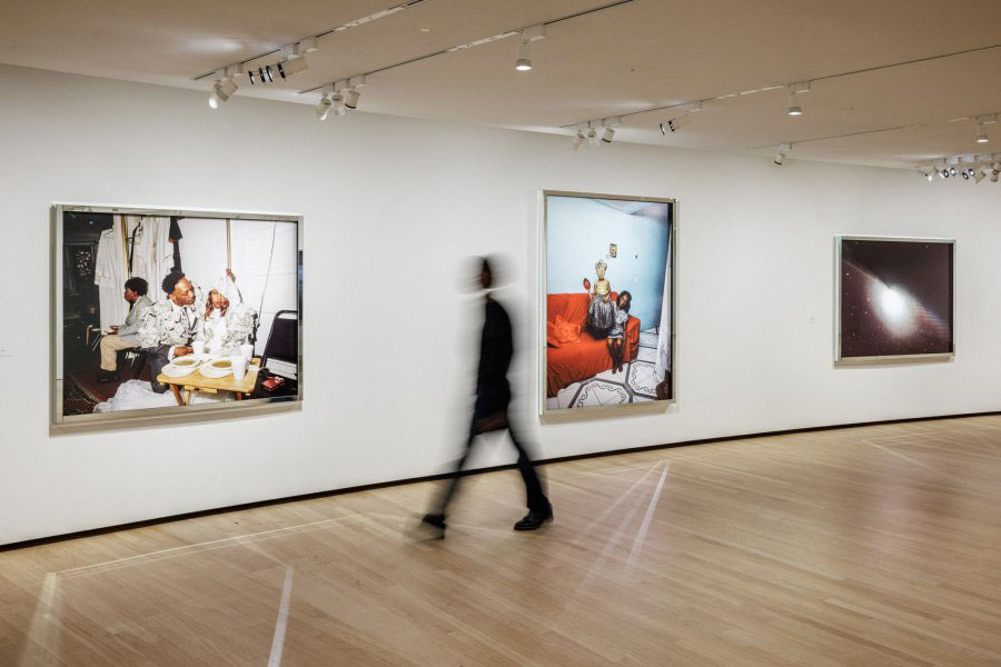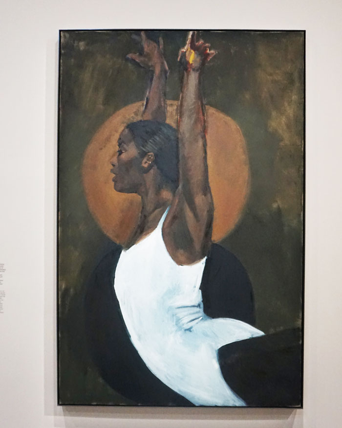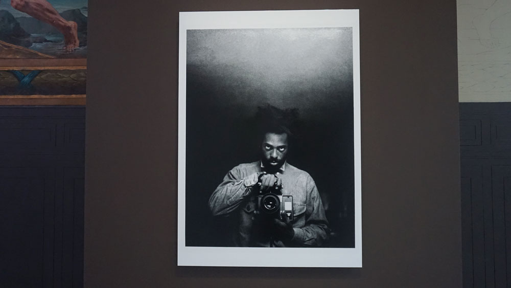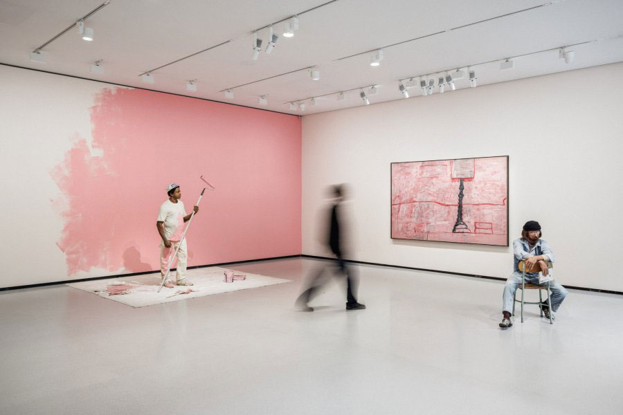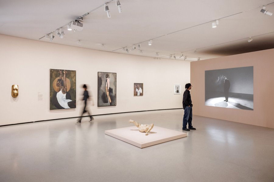 A curadoria é de Emma Lavigne, Diretora e Curadora Geral da Coleção Pinault – para além de outros cargos atuais e depois de um percurso que requer, arrisca-se, merece atenção –, com colaboração para a playlist de músicas, curadas por Vincent Bessières, que é possível ouvir perto desses corpos dançantes. A playlist com duração de 1h56, inclui Aretha Franklin, Miles Davis, Nina Simone, Erykah Badu até Kendrick Lamar – uma seleção de “Jazz & People” como se refere no subtítulo apresentado nas plataformas de áudio. É impossível não se notar a presença maioritária de músicos americanos, o que causa um estranhamento quando no vídeo em que se fala sobre a instituição se afirma que se trata de referências musicais selecionadas pelo especialista em música, que alimentam o trabalho dos artistas apresentados na exposição. O que significa alimentar neste contexto? O Jazz não se forma apenas a partir de onde se popularizou, não obstante, fala-se de diásporas. Trata-se de uma escolha. Está esclarecido que é uma exposição com a presença dos países que investem na arte. Não contempla artistas que não atingiram ainda grandes proporções no mercado artístico, visto tratar-se de uma curadoria comercial como a arte sempre foi – principalmente nestes contextos – mas também sensível como sempre tem de ser, até para sobreviver, apesar dos apesares. As obras estão espalhadas pelos vários cantos do edifício, desde o primeiro andar até ao térreo. Ali Cherri, artista que se expressa sobre diversas vertentes como performance, escultura, desenho, instalação e cinema, por exemplo, ao realizar o filme The Watchman que reflete com planos extremamente interessantes e numa lógica transcendental a memória da guerra omnipresente, em Corps et âmes instala esculturas ao longo das 24 vitrines ao redor de uma das rotundas do edifício. Cherri inspira-se nas imagens em movimento que ecoam os vinte e quatro fotogramas por segundo que criam a ilusão cinematográfica na série de esculturas denominada Twenty-Four Ghosts per Second. “Cada vitrine torna-se um fotograma congelado, uma sequência suspensa, reanimada pelo olhar do espectador” como o mesmo refere nas suas redes sociais. O projeto é inspirado no filme O Sangue de um Poeta (1930), de Jean Cocteau, sendo que algumas das vitrines contêm trechos do roteiro da longa-metragem. As esculturas com materiais como terra, bronze, gesso, pedra, madeira e aço são a materialização do trabalho do artista nascido em Beirute e a residir em Paris, sobre como a violência política se dissemina nos corpos das pessoas e na paisagem física e cultural. Cherri desenvolve esculturas intervencionadas, para refletir a violência colonial. O seu trabalho enfatiza a riqueza sobre a noção da prática artística realizada a partir de vários suportes. Todos estes sons fazem corpos mexerem, mesmo que, só na imaginação, enquanto se observa os retratos de Zanele Muholi com os contrastes de luz intensos sobre a pele, em Mfana, Philadelphia (2019). Kerry James Marshall com The Wonderful One (1986). Diane and Allan Arbus com Dancer Jerome Robbins (1953). Lynette Yiadom-Boakye com No Pleasure from Machinery (2013) e Light of The Lit Wick (2017). Obras de extrema relevância, que nos colocam num silêncio da apreciação. Cabe salientar a presença de cadernos de esboços como parte da obra em exibição, contribuindo para as histórias que se quer contar, entendendo-as num conjunto de fatores que reúnem riscos, testes, erros e elaborações. Retiram talvez artistas de um pensamento difundido de existência constante sobre o caos, desorganização, do génio inato e muitas vezes, da anulação do criador, valorizando-se apenas a criação. Acontece com Portrait of Miriam Cahn (2024) por Jocelyn Wolff. Acontece com o caderno de esboços de Mira Schor (2020). Acontece com Duane Hanson com a fotografia enquanto produz a escultura hiper-realista Jogger (1984), como também com o autoretrato analógico – denominado Monster (1988) – do cineasta Arthur Jafa com a máquina fotográfica na mão, à entrada da sua obra audiovisual imersiva.