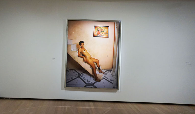 Os retratos de Lawson não são nada triviais, há sempre algo para além dos detalhes – que são muitos –, que colocam os diferentes contextos das pessoas que fotografa numa dimensão metafísica, difícil de se explicar. A capacidade de criar uma discussão que não se limita a estereótipos sobre a comunidade negra, quando existem nas suas fotografias elementos que podem recair sobre essa interpretação, é para poucas. Em Daenare (2019), Lawson regista uma mulher negra nua com uma tornozeleira, deitada numa escadaria, fazendo parte da composição uma pintura de natureza morta, pendurada na parede rosa salmão. Esta mulher com o seu pequeno afro e um olhar fixo para a câmara, transmite completa segurança sobre o seu próprio corpo, mesmo que, uma tornozeleira possa representar automaticamente vigilância, confinamento ou punição. Ela firma-se pela noção de si mesma e a energia sensual está exatamente nesse existir – desta e de todas as outras pessoas retratadas nas várias fotografias fixadas na parede. Cada obra de arte de Dean Lawson é uma composição em que a fotografia é o início de um registo atravessado por outros elementos como: hologramas incorporados, rabiscos de caneta e os limites emoldurados com uma estrutura de espelho, como que, para aceder ao universo imortalizado, tivéssemos que olhar para nós mesmos. Os corpos estão protegidos por grandes cristais que se espalham pelos cantos da sala demonstrando, mais uma vez, que se trata de um trabalho fortemente espiritual. Ana Mendieta surge mesmo antes de qualquer indicação sobre que caminhos seguir na exposição. Com três obras expostas ao longo da mostra, é inevitável que não se veja Silueta Sangrienta, uma curta metragem em que a artista cubana reflete a presença física, a perda e ligação entre corpo e território. Mendieta reconhece a existência do seu corpo na natureza enquanto a silhueta do seu corpo é desenhada no chão de terra. Mantendo-se dentro desse perímetro ilimitado que se transforma ainda mais familiar, a sua existência expande-se com takes intermitentes, em que o seu corpo aparece de costas e barriga para cima. Vai aparecendo e desaparecendo, juntamente com imagens do interior da silhueta desenhada sobre a terra, preenchida com um líquido vermelho vibrante. Este trabalho faz parte da série de fotografias e vídeos denominada Siluetas que realizou entre 1973 e 1980, em Lowa City e no México. São mais duas obras da artista – Butterfly (1975) e Flower Person, Flower Body (1975) – que fazem parte da exposição e, para além do contributo que constitui Corps et âmes, uma mostra colectiva com mais de 100 obras de 43 artistas, as criações de Ana Mendieta não estão expostas uma ao lado das outras, o que faz pensar na potencialidade que as suas criações – feitas abertamente sobre o seu corpo e experiência – têm para o colectivo. Este tipo de produção artística é encantadora, não seria também coincidência ler que Mendieta em vida disse que o ponto de viragem para começar a fazer o seu trabalho da forma como o conhecemos, é ter percebido que de outra forma, não teria alcançado o que entende como real, isto é, mágico.