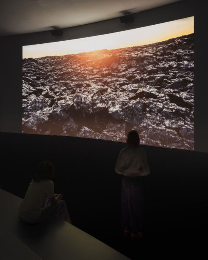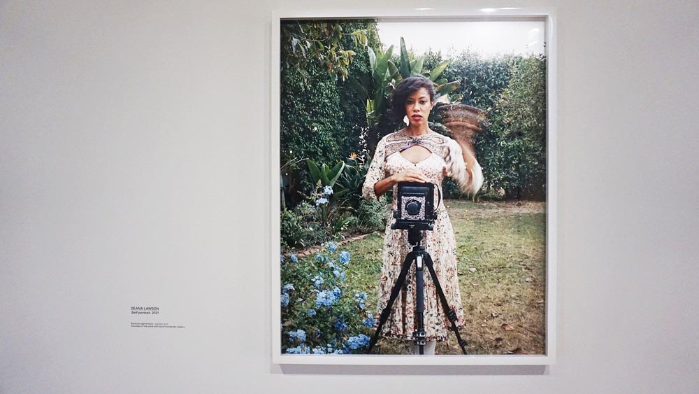 Apresentada em tela gigante numa sala escura, AGHDRA (2021) evoca uma contemplação consciente do oceano tendo o sol como horizonte. O mar é observável pelo movimento das ondas, o que seria a água é descrita na sinopse como coberta sobre um “material desconhecido e não identificável”, sugerindo “algures entre o plástico, o asfalto e o magma”. Observo rochas pretas com nuances cinzas que oscilam sobre o som do baixo em predominância, e de uma voz adulterada. De alguma forma, cria-se um mecanismo de defesa para caminhos de tranquilidade em meio à consciência de que aquelas rochas poderão ser corpos da história. Memória ressignificada. Matéria profunda, sedimentada com matéria orgânica de séculos de vidas passadas e camadas de tempo. O momento é de pertença. No espaço que antecede um conjunto de retratos tirados pela artista Dean Lawson, a obra Self-portrait (2021), um autoretrato de corpo inteiro que coloca em crítica um método que tem em consideração a memória, experiências pessoais vividas pela própria, como linhas orientadoras para a compreensão dos temas que lhe são sensíveis artisticamente. Lawson aparece num contexto florido em que o padrão do seu vestido com um detalhe de asas de libélula no colo, participam. Com a mão direita apoiada sobre a câmara à sua frente – personalizada com pedrarias de tons de rosa e lilás – apoiada sobre um tripé, o olhar atento de quem tem os pés assentes na terra, e o gesto, marcam a captação do momento deixando a sua mão esquerda em motion blur.