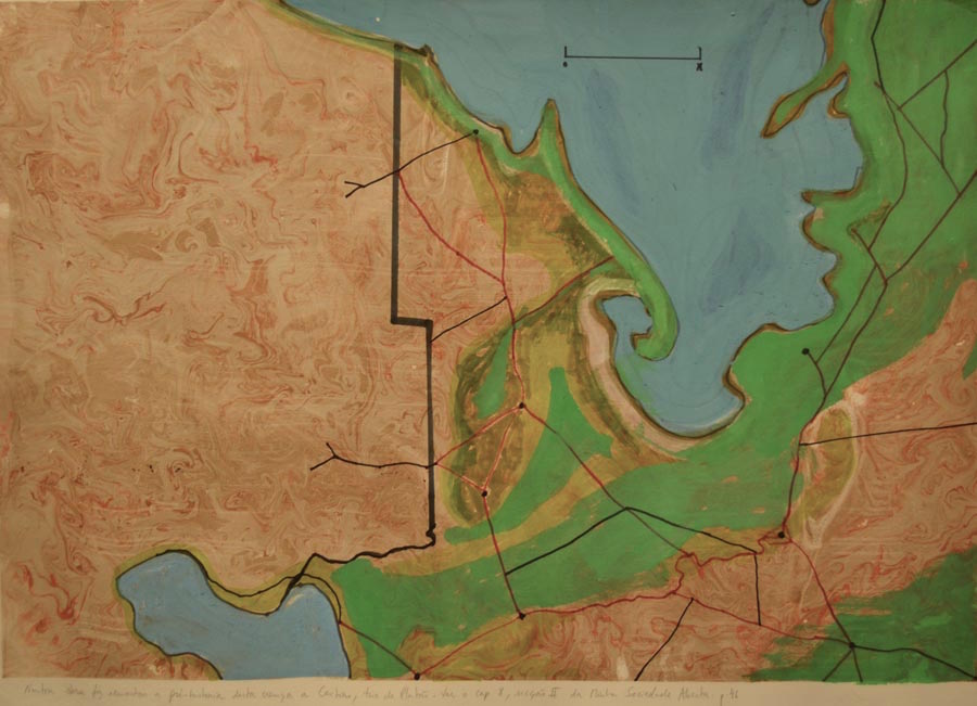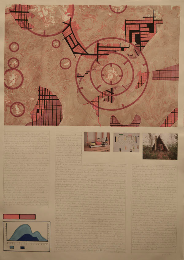 Estamos ainda no plano da competência, mas, Pedro Calhau vai mais longe ao roçar o patamar da genialidade na série “Cosmos”. Aqui, dá-se a fusão do conhecimento criativo com o pensamento filosófico. Olhar para esta série é mergulhar num atlas de intensa busca do conhecimento. Ilustrações de mapas e constelações entram em debate com textos de crítica sobre diversas correntes filosóficas. Cada uma destas “páginas”, ou seja, destes trabalhos artísticos, trata-se de um convite tertuliano para refletir sobre a episteme como manual de instruções sobre a felicidade neste mundo. Assim, ao lado de um rio cartografado, Pedro Calhau fala-nos da velha querela entre a escola britânica e a escola continental de filosofia, opondo o empirismo clássico ao racionalismo clássico. Um desenho com diversos alvos de espingarda tem como legenda um texto sobre o contraste entre o pessimismo e o otimismo epistemológico, análogos ao tradicionalismo e ao racionalismo epistemológico. Seguem-se, depois, mapas associados ao conceito da anamnesis; desenhos de fotografias de satélite para consulta meteorológica postas em diálogo com a teoria da verdade manifesta e, também, registos orográficos ilustrando a teoria pessimista de Platão sobre a natureza de quase todos os homens, bem como das suas consequências na formulação das leis. Por isto, deixar-nos deliciar, unicamente, pelas magníficas imagens ou pelo efeito das palavras mais chamativas e não lermos os textos, seria desrespeitar o verdadeiro alcance deste processo criativo, no qual se aponta para a filosofia como a arte da prosa, lembrando a caracterização hegeliana das artes. Num dos seus melhores textos, Pedro, o artista-filósofo, chega a concluir que a maior parte do conhecimento é mediado através de modelos tradicionais e do que nos foi transmitido oralmente. Mas, apesar de não existir conhecimento sem tradição, esta encontra-se sempre sob escrutínio, ao ponto de poder ser destruída. Aonde poderá, então, pairar a verdade? Algures entre a alternância do continuar e do romper. O trabalho artístico de Pedro Calhau lembra-nos bem que as respostas já existem na imensidão do mundo, apenas temos de as ativar ousando perguntar. As descobertas serão, então, inesgotáveis ao explorarmos os percursos emaranhados das relações entre o tempo e o espaço. De tamanha curiosidade não há que ter vergonha. Basta assumi-la, como declara o artista num texto-legenda da série “Nous”: “(…) O interesse alargado do meu trabalho é o mundo em toda a sua diversidade (…)”. Assim, deseja um corajoso!