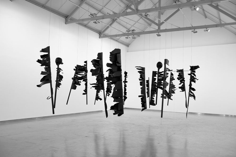 Mas somos, também, espectadores desse dilacerar, desse desmoronamento, e ao mesmo tempo, agentes desse fim, dessa perda, que o artista representa com tanta beleza. Poderíamos, aqui, vislumbrar, no corpo da exposição, uma quebra de espectativas, ou a queda do ocidente? As nações, tal como as conhecemos hoje, tendem a diluir-se, a esboroar-se, e as suas fronteiras a esbater-se. Também observamos uma desterritorialização, e o fim de velhos paradigmas. Essas bandeiras, ao qual somos convidados a entrar, a habitar, podem evocar, também, um apelo à partilha, à comunidade, ao cooperativismo, ou a um regresso ao bem comum. Rui Chafes parece corresponder ao homem contemporâneo de que fala Agamben: Capaz de se distanciar, e vislumbrar as sombras do seu próprio tempo: “O contemporâneo não é apenas aquele que, percebendo o escuro do presente, nele apreende a resoluta luz; é também aquele que dividindo e interpolando o tempo, está à altura de transformá-lo e de coloca-lo em relação com os outros tempos, de nele ler de modo inédito a história, de citá-la segundo uma necessidade que não provém do seu arbítrio, mas de uma exigência à qual ele não pode responder. É como se aquela invisível luz, que é o escuro do presente, projectasse a sua sombra sobre o passado, e este, tocado por esse facho de sombra, adquirisse a capacidade de responder às trevas do agora” (Agamben).