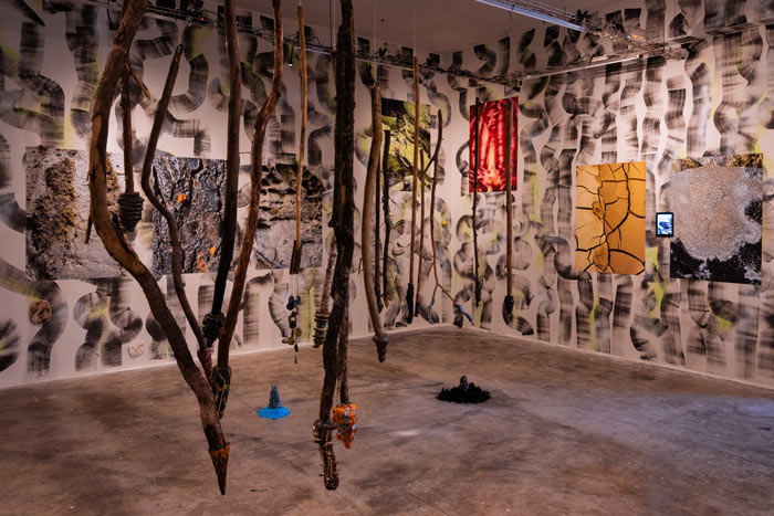 Ainda na sala principal, ramos de árvores suspensos apresentam coroas de cerâmica brilhantes. Nas extremidades dos ramos, onde deveriam existir as raízes ou as fibras da madeira, encontram-se formas escultóricas cobertas por vidrados coloridos e reluzentes. Funcionam como uma extensão do próprio organismo e, de repente, um novo ser emerge. Artificial e orgânico fundem-se, para dar origem a uma matéria única, onde a natureza e a escultura se (con)fundem. “Gramáticas Pardas” apresenta uma constelação de gestos que se prolongam uns nos outros. São inscrições de passagem, marcas deixadas num território em permanente transformação. A madeira parece recordar a violência lenta do tempo; a pedra, a persistência do que resiste; o vídeo, a impermanência que insiste em apagar e reinscrever. Como diz Ana Anacleto, “Talvez estejamos a falar de uma gramática da invisibilidade, que atravessa paisagens, corpos, memórias e territórios descartados, periféricos, semi-ocultos fixando-se precisamente na sua condição de liminaridade.”