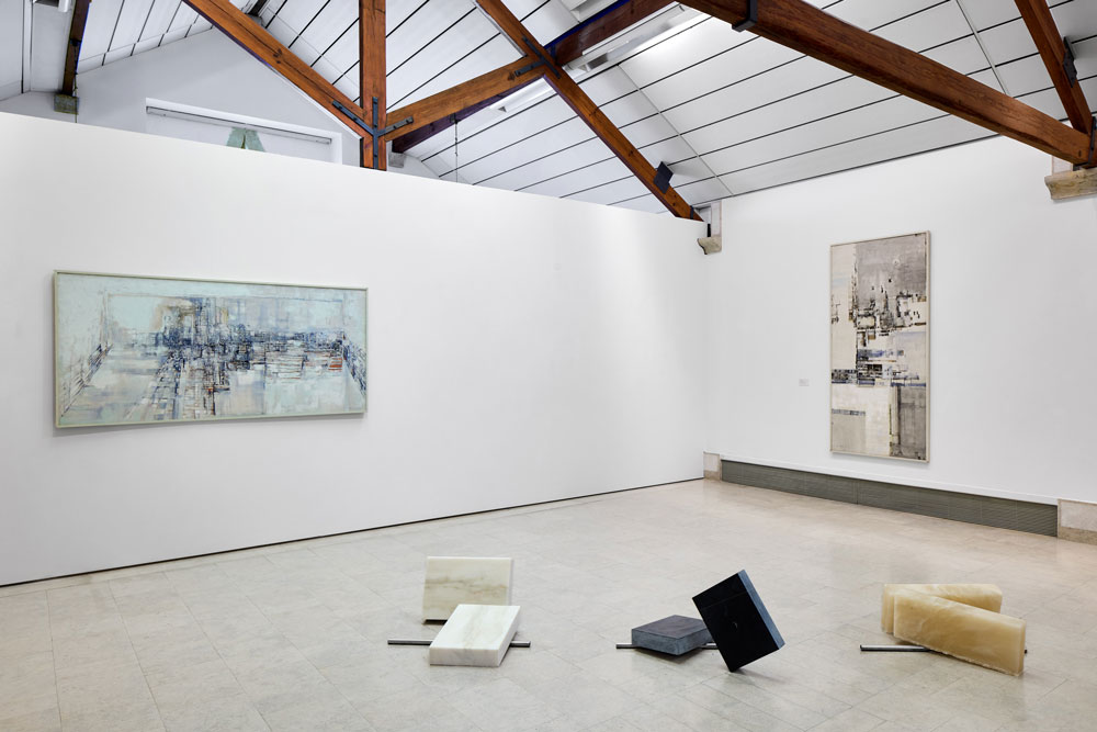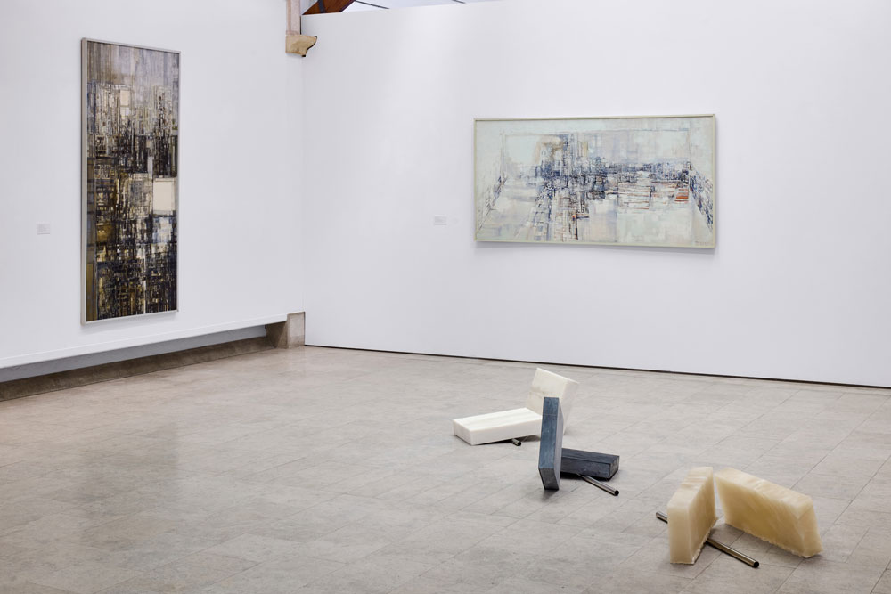 Continuando o trajecto da exposição, depois de pequena paragem por corpos estanques nas naturezas mortas de Vieira, continuamos a compreensão corpo-espaço, metáfora amorosa e processual numa sala que continua a apresentar as obras de Sanches e Teresa. Na última sala da exposição, o corpo afasta-se do espaço, dando conta de onde estamos afinal. São paisagens onde se compreende o corpo, o nosso, como actor político em cenários mais ou menos urbanizados. As pinturas sobre papel - alimentamos aqui a nossa relação da informação para-expositiva que nos é dada - sob o título “No passarán! — slogan adotado pelos republicanos contra os franquistas na Guerra Cilvil de Espanha, que decorreu entre 1936 e 1939, e que perdurou no tempo como símbolo da resistência e da luta contra o regresso histórico dos fascismos —, são estudos para a realização de cenários para uma peça de teatro popular da autoria do ativista, dramaturgo e ator espanhol Luis Mussot Flores e resultam de um pedido de António Moreno, um eletricista espanhol que fundou uma companhia teatral amadora nos arredores de Paris.” O nosso corpo afastado do espaço, compreendendo a sua posição, espacial e política, observa outros corpos no mesmo espaço. A gravidade é o mistério do corpo, é a frase de Machado de Assis utilizada como epígrafe na sala dedicada às obras de Frida Baranek. E dir-se-ia durante este trajecto que o corpo é também a gravidade do mistério, tentando alinhar a relação que estabelecemos com o mote de Vieira, de nada excluir do nosso espanto. Se terá este guião relacional exposição-corpo servido para atiçar a curiosidade adolescente, talvez nunca o saiba, mas a verdade é que me serviu para estabelecer com ela a minha relação. É inevitável, por muita informação que haja disponível, é apenas com o meu corpo neste espaço que acrescento à vivência uma nota, uma brisa.