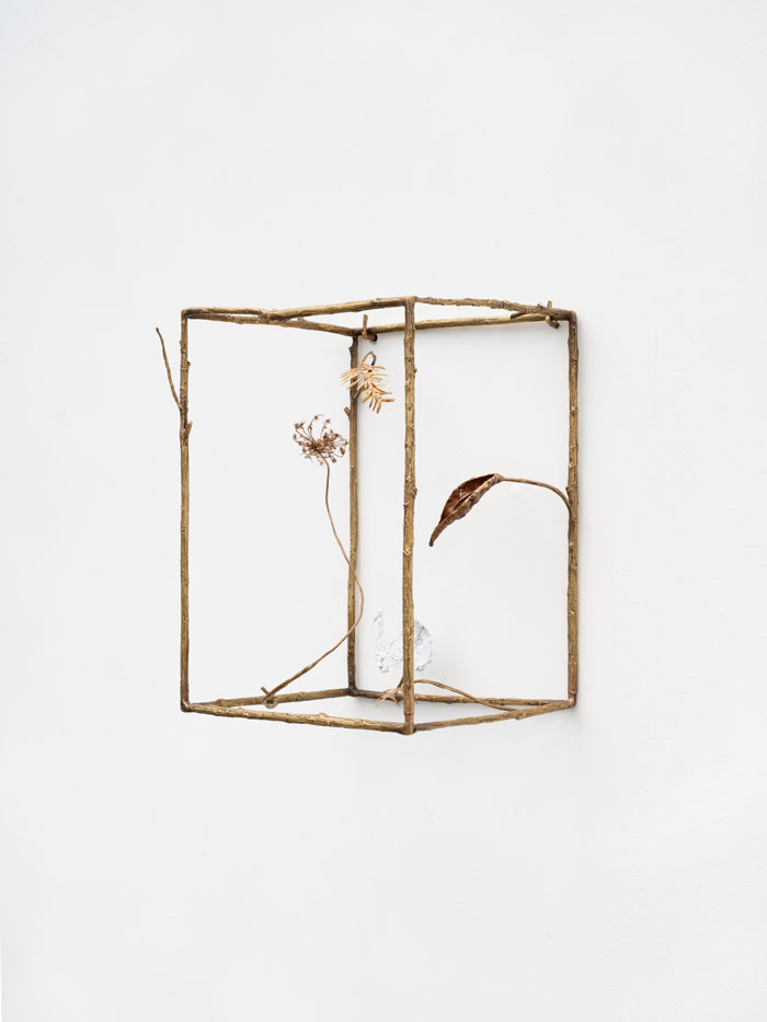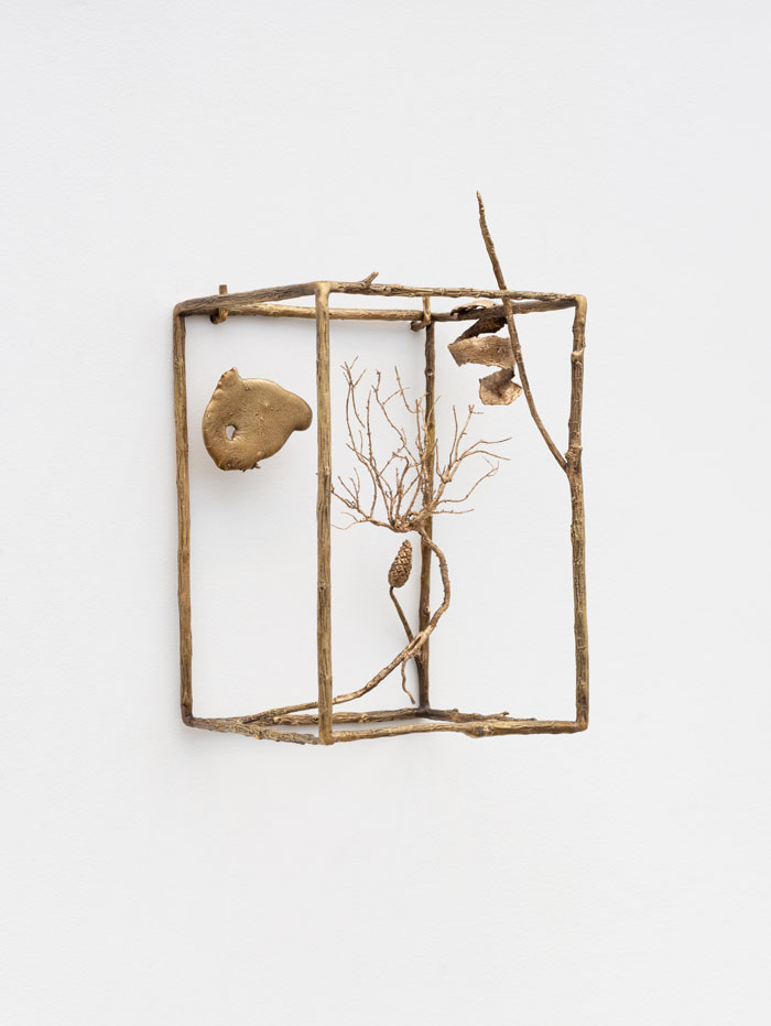 Apresentam-se dois grupos de esculturas, que de alguma forma resvalam por sensibilidades diferentes. Se o compacto das esculturas metamórficas, monocromos voluptuosos, marcam o espaço com uma gravidade séria, e um formalismo com reminiscências do século XX, o segundo grupo de esculturas - o que me apelou à sensibilidade e memórias de ligação à terra, e de um retorno a esse espaço simbólico para o qual os sucessivos portais nos prepararam, o mesmo a que o faz de conta inevitavelmente recorre - aparentemente frágil, de uma delicadeza espectral. Apesar do bronze, este segundo grupo de esculturas de parede cujo enquadramento se assemelha a pequenos cubos flutuantes contra a parede branca, cujas arestas sólidas de ramos definem um espaço proto-cénico e onde outros elementos aparentemente naturais vivem... Retomo o início da frase; apesar do bronze, material de que são feitas, estas esculturas encenam com leveza possíveis paisagens bucólicas. Apesar de não estar certa do porquê do apelo de peças de tão grande simplicidade, transmitem-me estas uma sensação de suspensão, de voo, e também de suspensão do tempo. Não apenas do tempo dos elementos apresentados, que se deduzem recolhidos, secos e reformulados e não apenas pela escala que se reduz frente à grande superfície branca das paredes da galeria.