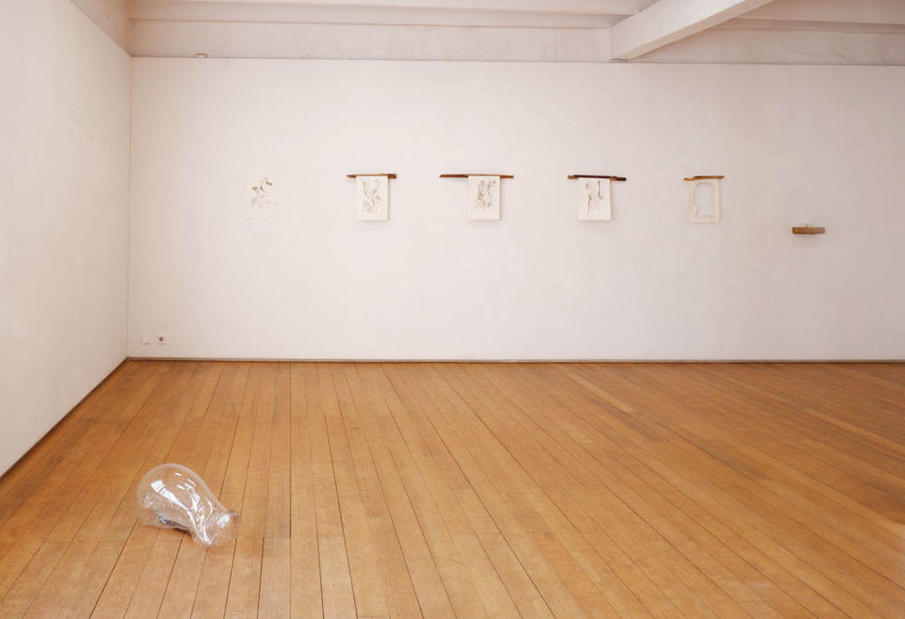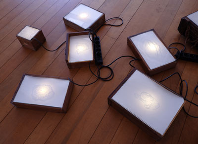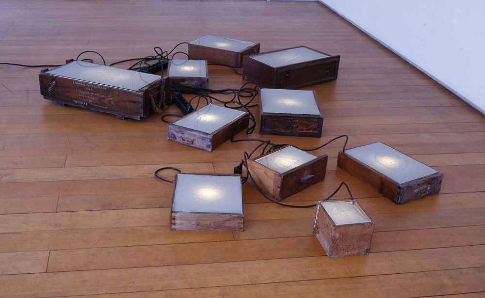No chão da galeria um conjunto de gavetas e caixas de madeira mostram-se conectadas por fios elétricos que permitem a retroprojeção de imagens, de aura espectral, criadas pela união da luz, do vidro e do papel. Esta instalação, designada “La Contemplation du Feu”/ A Contemplação do Fogo (2024), é uma analogia a um estado hipnótico e de embalo causado pela visualização demorada das chamas. Aqui o fogo como luz, não consome, revela. As gavetas e caixas reaproveitadas, não ocultam, mas recebem para exibir. E os fios sendo visíveis, revelam o circuito energético necessário para a projeção. Há nestas imagens-luz uma indicação de pós-concetualidade do arquivo que se serve da energia para reativar a memória da (i)materialidade e (in)visibilidade.