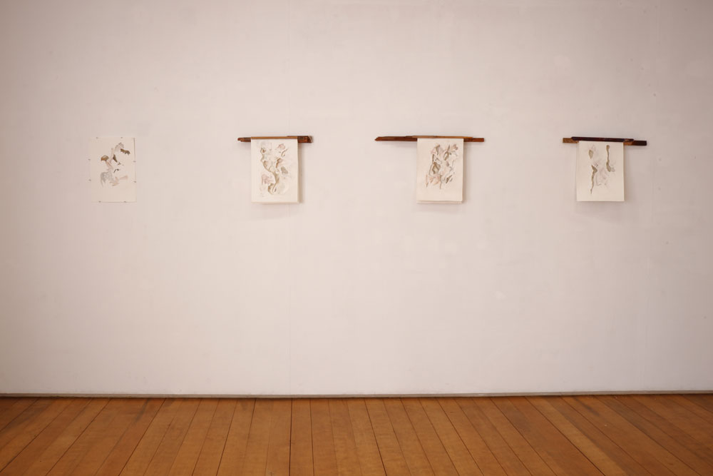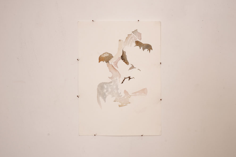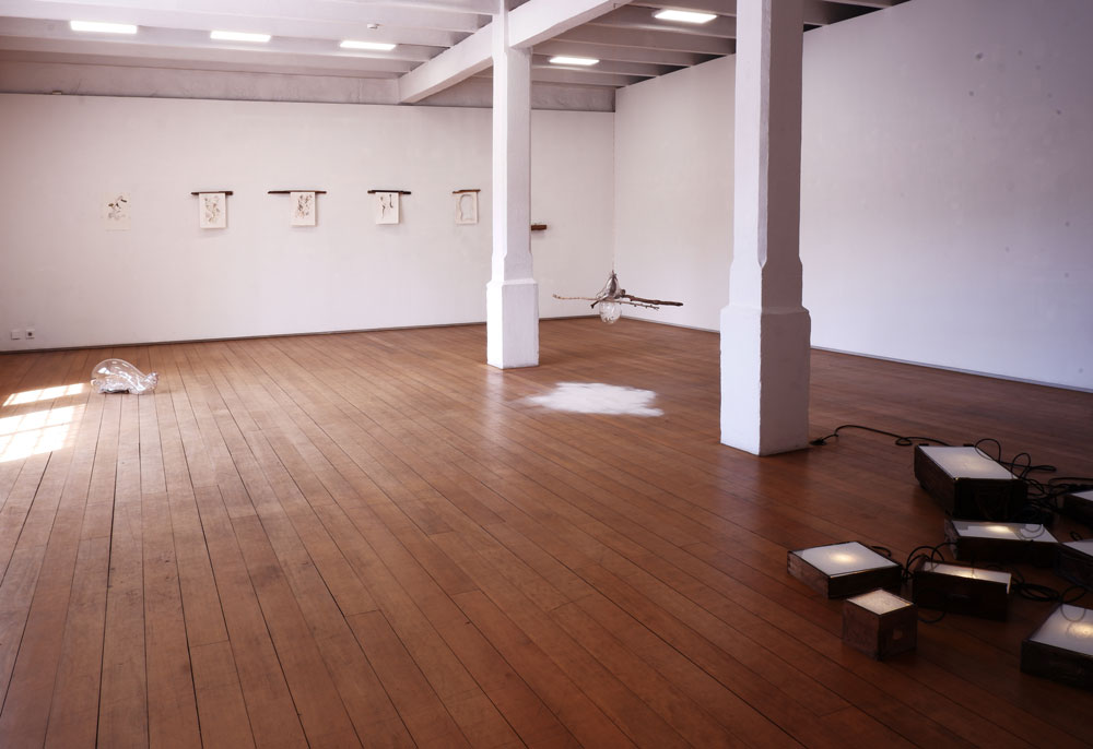 Em conjugação com estas peças, que contemplam uma sensação de estado-limite, surgem pinturas que, não obstante exibirem alguma pigmentação mais saturada, preservam essencialmente uma lúcida suavidade tonal. Rasgadas pelo fogo, parecem partir dessa herança da dor estética de Joan Miró (1893-1983), da pintura subtraída pela fúria das chamas. Desocultam-se camadas de sobreposição e forma-se uma operacionalidade de pós-medium que desagua numa corporalidade de pintura-escultura. E, nesse rastro escuro do fogo, forma-se um caminho que permite um mise en abyme de redundância estética e de reflexividade discursivo-abstrata. Numa outra vertente, o papel sustentado por pedaços assimétricos de madeira nota-se, igualmente, rasgado. Mantém-se o princípio da revelação de sobreposições, mas aqui a honra do gesto é manual. Sem o fogo devorador, é a mão bio-técnica que (des)forma. E uma pequena caixa de madeira contém essas sobras de papel como prova da ação. Mas, guardar fragmentos também pode ser uma forma de acalmar a angústia da perda.