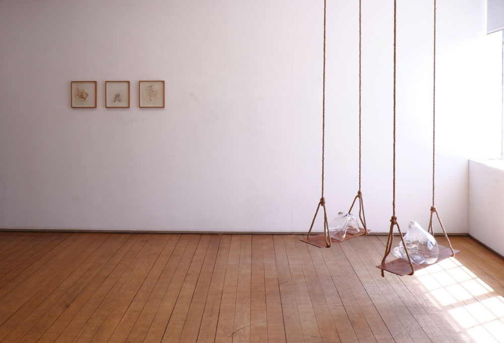 O vidro, como uma espécie de luz solidificada, é um exemplo desse invisível que age, do ar que não só apaga ou atiça. Forjado a fogo, provém do calor, da pressão e da metamorfose, mas também do sopro que substancia o ar como matéria que dá forma. Depois, pulsa-lhe a fragilidade. Vive nessa interioridade e latência da iminência da quebra, onde os fragmentos não mais se concluem no inteiro. Tornam-se memória. As peças em vidro transparente de HElena Valsecchi, e aqui a transparência funciona como um paradoxo entre visibilidade (permitindo ver através de) e invisibilidade (aludindo à impercetibilidade), apresentam-se amorfas. Dispostas em baloiços, pousadas em painéis de vidro, suspensas por fios ou na ponta de pequenos troncos de madeira, habitam numa liminaridade entre equilíbrio e colapso, silêncio e estilhaço, estabilidade e risco.