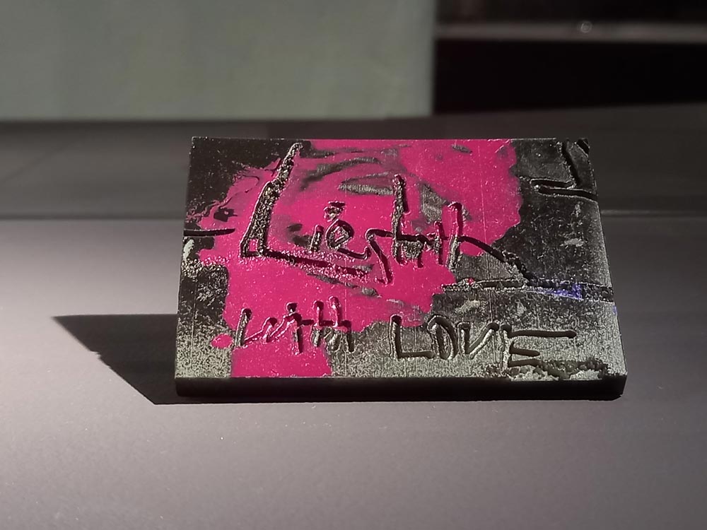 Como exemplo, refiro as duas peças que integram a coleção de Liesbeth den Besten: a primeira, Smell of The Fish [Cheiro a peixe] (2016), incorpora dois elementos readymade assistidos, com intervenção de pintura gestual (muito comum na sua prática): uma faca de peixe em prata e um aro gravado fragmentado, de tipologia clássica; a outra, Liesbeth Brooch [Broche de Liesbeth] (2017), dedicada à colecionadora, num gesto de agradecimento. A inscrição, quase hieroglífica — «Liesbeth with love» — surge pintada de rosa-fúcsia, criando uma disrupção inesperada face ao negro que atravessa grande parte da sua obra, como um grafitti.
