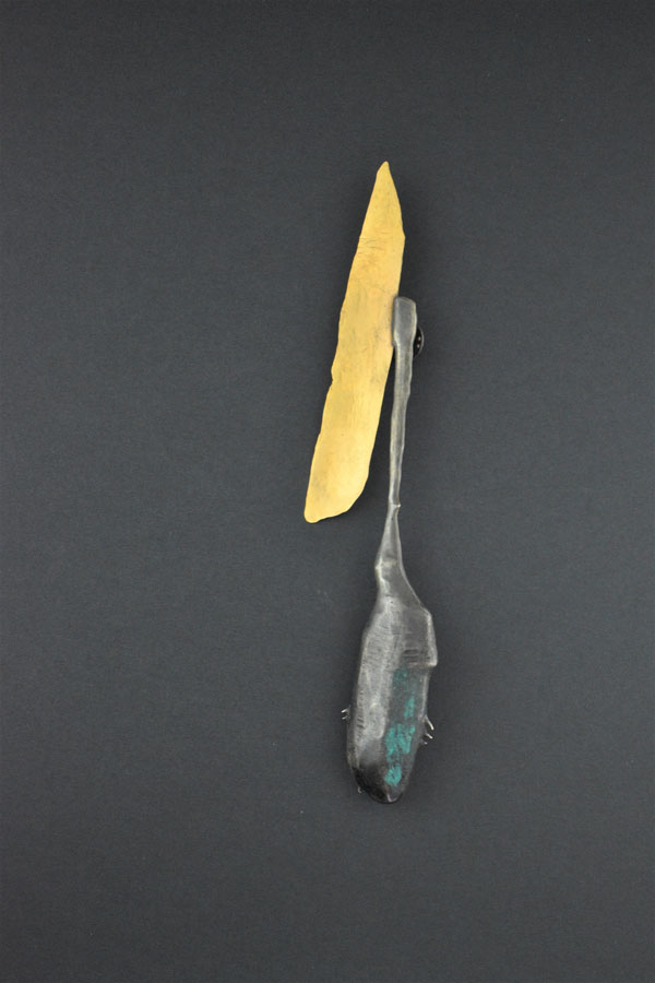 Magical: Smell of the Fish, 2016. Colar. Faca de peixe em prata dourada reciclada, argola de prata, tinta, almandina, pérola preta. Fotografia e cortesia Tiit Rammul. Coleção Liesbeth den Besten