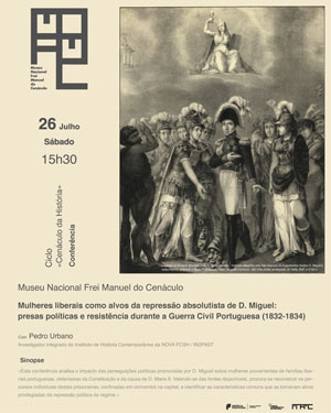 No próximo Sábado, dia 26 de julho, às 15h30, o Museu dará início a um novo Ciclo intitulado «Cenáculo da História». Nesta rubrica terão destaque figuras e temas diversos da História de Portugal e não só. Iniciamos o Ciclo com a conferência intitulada «Mulheres liberais como alvos da repressão absolutista de D. Miguel: presas políticas e resistência durante a Guerra Civil Portuguesa (1832-1834)».