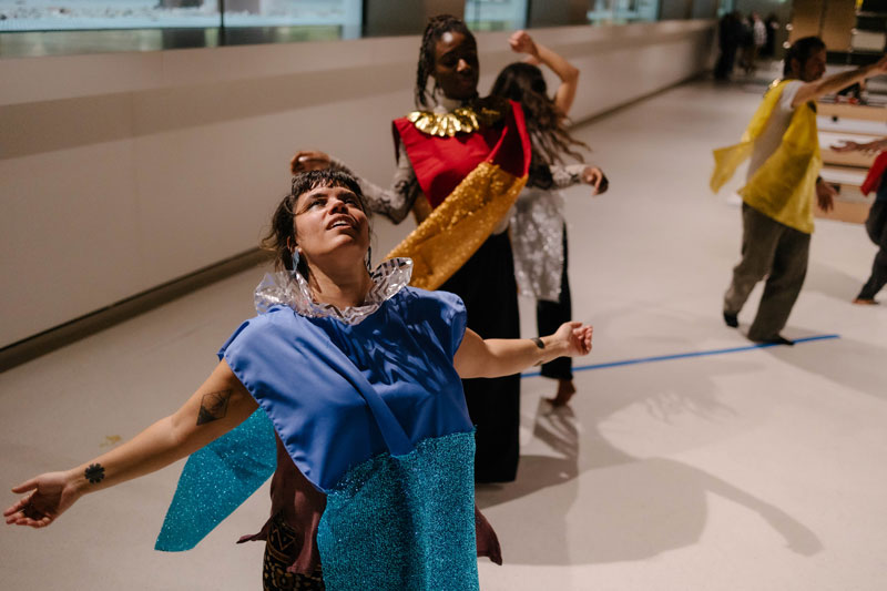 GC: São muitos, mas por exemplo um mais recente, eu te apresentei para o João Gonçalo Lopes que é um grande parceiro e que me está acompanhando nessa viagem (talvez seja a pessoa mais próxima dessa viagem), e tem um espaço que ele falou: “aqui é importante que você coloque a tua relação com a tua mãe”. Como é um projeto que tem muitas facetas, então tem um lado de gerência de lidar com o pessoal da costura, o pessoal da coreografia, da música… Mas aí foi o momento em que pude refletir, então eu estava propondo para todo o mundo, mas alguém dentro do processo me propôs isso. Então isso foi uma maneira de me recolocar. Então são pequenas atitudes que ajudam a gente a refletir (agora estou ouvindo a Maria Filomena Molder que tem todo um texto sobre reflexo, sobre o espelho). Então me fez refletir, mas quase (não sei se existe esta palavra) infletir, ou seja: não se perder no processo. Não se perder no que se tem de fazer e abrir espaço para descobrir dentro da coisa, porque tem muitas coisas por descobrir na gerência das pessoas, na expectativa, seja das avós que estão nos ajudando a fazer as roupas, mas têm várias questões. Ou seja, tem de atender às expectativas. Para mim é o desafio de estar com elas, estar com as pessoas, mas também estar com o espaço, que isso é não ser atropelado, e acho que ainda é um desafio porque a energia está ainda construindo. Vai ter desafio de como lidar com a instituição, também com a expectativa da instituição, com os modos de conhecimento da instituição, com os modos de visibilidade no sentido de: altura do papel, a letra… Ou seja, muitas coisas que eu não cheguei a pensar mas tive de começar a pensar, e talvez tenha tirado do meu tempo que queria estar em outra coisa, mas no final o que fica é um amontoado de desafios. Hoje a gente colocou um desafio para o público que é: para ele entrar ele atravessa esse portão. Então também esse chão está marcado com fita porque aqui é muito reto, então tentei criar desvios, mas também é uma marca no chão que ajuda para as pessoas dançaram, como mapa de dança. Então são muitos desafios lidar com o que se desejava antes, o que passa a desejar, também todo o sonho que vira realidade tem decepções, não é? Coisas simples: queria muito que essa foto aqui da minha mãe (desses dois bonecos segurando um coração de pedra em que ela fala dos brinquedos Miriti), essa foto tivesse grande. Mas eu não consegui fazer uma cópia dessa foto, por conta de tantas outras coisas. Então pode ser uma decepção de uma coisa pequena, pode ser: fulano veio aqui (na Gulbenkian) e não veio aqui (no espaço de ativação).