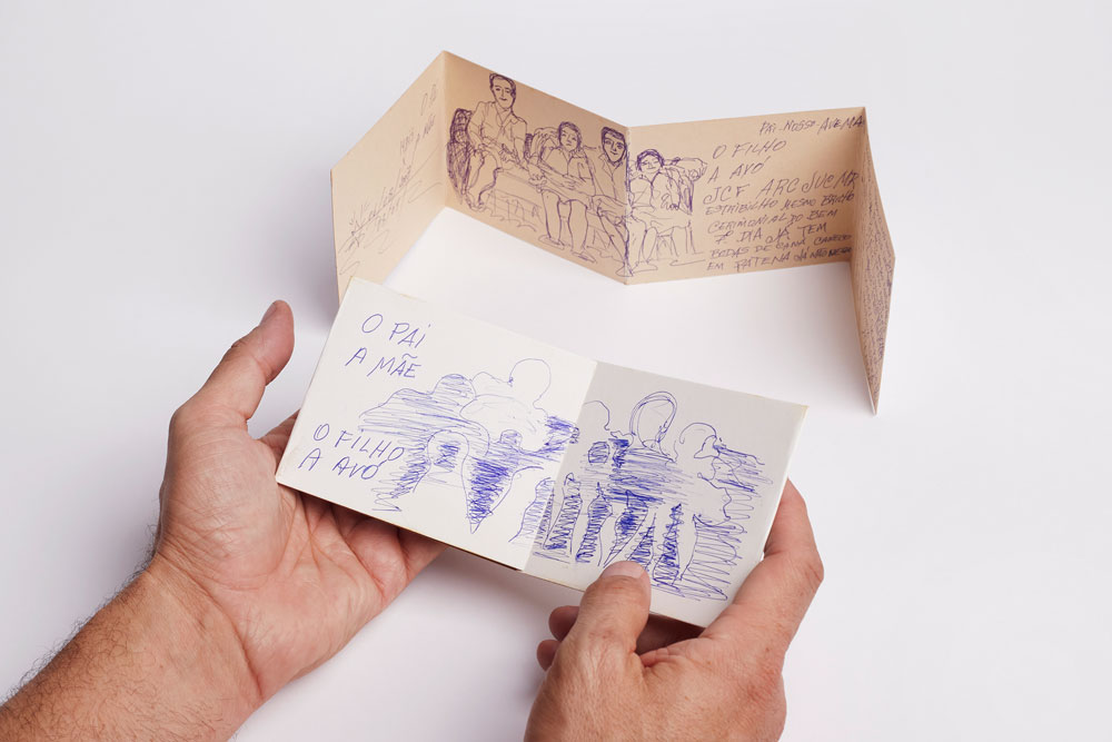 GC: Ela é uma mulher com muito humor, ela por exemplo ia para o autocarro, sentava e ficava escrevendo as suas poesias e se fingia de muda. Então a pessoa sentava e ela fazia um gesto assim como quem não fala, e fazia uma cara para tentar dizer o que ela não estava dizendo com as palavras. E escrevia, a pessoa falava, e aí depois algumas vezes a pessoa ia embora e ela falava: “tchau”, e a pessoa levava um susto. Ou ela cortava as maçãs e enfiava na boca e fazia como se fossem uns dentes enormes, e ia no lugar onde sempre vai mas ia fazer “oi!”, e a pessoa leva um susto. Ela tinha esse espírito, então eu tenho vontade desse humor, dessa irreverência, e ao mergulhar na obra dela fui percebendo quanto eu não conhecia da obra dela, porque como filho tem momentos que a gente não olha com profundidade, embora a gente conheça muito. A minha irmã está chegando hoje, ela se lembra de coisas melhor do que eu para certas coisas. Então eu acho que a minha vontade é trazer esse impulso criativo da minha mãe, ela lida com os materiais quotidianos, matérias que a gente descarta, mais a brincadeira com a palavra, por isso que tem um vídeo que a gente a vê sendo visitada por uma artista chilena, que é a Vivi Curtis. Podemos ouvir a voz dela, o espírito dela sempre contando causas, e ela fala assim: “você olha para uma coisa, você olha, você olha, você olha, e não faz nada. E aí quando você fizer, todo o mundo vai olhar que você fez, e vai querer repetir, porque nada é igual a outra coisa, e tudo é igual.” Ela tinha uma maneira enfática de associar, e eu fui meio vendo modos de dizer, de brincar, e também de como me aproximar das pessoas por essa maneira dela bem-humorada de buscar comunicação, de buscar uma outra versão dos factos, das palavras. Ela falava uma frase assim: “eu javali. Hoje eu (já)vali mais ainda, ainda sou mais javali”. Então é essa brincadeira que eu quero que as pessoas tenham e também da possibilidade de brincar com a palavra, brincar com a palavra, que a gente tem. A gente come coisas que vieram em recipientes, e a minha mãe sempre chamou a atenção para a riqueza desses materiais, de cortar e fazer óculos, como esse material aqui de embalar pão, ou esse aqui que é do matte leão. Eu tenho no meu trabalho um carácter muito interativo, e acho que vem muito desse modo de ser da minha mãe, então minimamente quero que as pessoas possam se sentir à vontade para brincar com elas mesmas. Acho que o bloco é um desafio, ou seja, ainda não é, ainda será, é por isso que é caravan(será), porque a palavra certa que a minha mãe usava era caravançará, mas como em persa é caravanserai, daí eu pensei: caravanserá, uma caravana que será. Os caravançarás (que eram entrepostos na rota da seda, do Oriente, do mediterrâneo para a China, onde as caravanas paravam também para alimentar os animais), elas tinham umas estruturas com um parque central onde as pessoas paravam e conversavam. E a minha mãe associou muito esses caravançarais com os quintais cariocas onde se faz o churrasco, onde se encontra a família, se tem o aniversário de 15 anos, onde se solta pipa, onde se sobe na goiabeira ou na mangueira… e ela (como fazia com o nosso quintal), ela abria para as crianças verem, subirem, e fazerem as brincadeiras. Eram brincadeiras efémeras, ela fazia carrinhos de gelo que dava para as crianças. Os carrinhos derretiam, eram geladinhos (é arte refrescante), e desapareciam, ou pegar todas as garrafas de coca-cola vazias e jogava pela escada fora para fazer uma queda de água mas com sons das garrafas. E era só correr, subir e barulheira. Então ela via nos caravançarais uma maneira de ver os quintais, que os quintais podiam ser também locais em que as caravanas poderiam parar, e conhecer a história de cada quintal. Então a Folia dos reis que eu falei, era o feriado perfeito porque é o modo de funcionamento: eles iam de quintal em quintal, comendo e bebendo, e as pessoas vão alimentando, eles vão seguindo assim até dia 6 de janeiro. Aqui no caso a gente não vai visitar nenhum quintal, as pessoas visitam esse aqui transformado em quintal, a gente não vai na casa de ninguém, talvez possa ser um desdobramento do projeto.