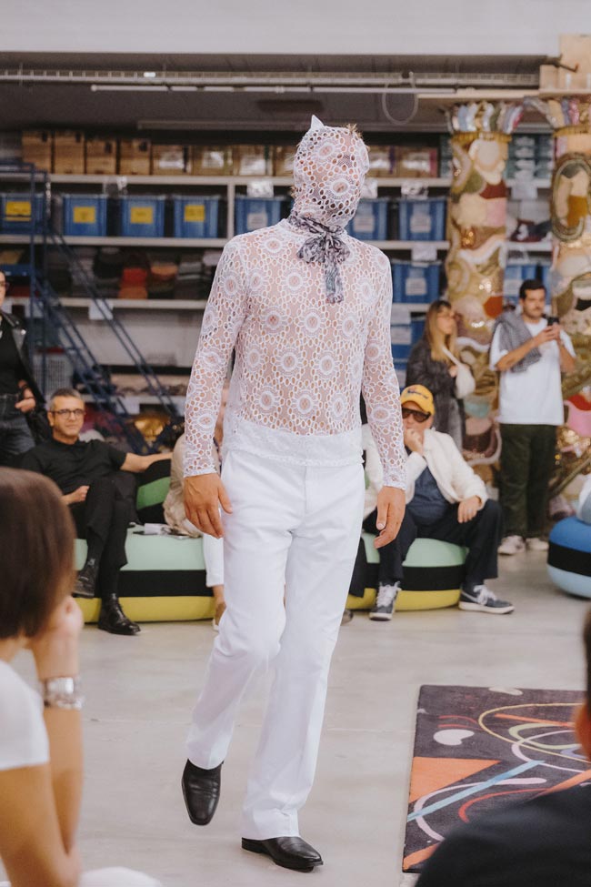 HO: Desta mesma renda aplicada nos 'dandies' de Nuno Gama, nasceu um estampado exclusivo prolongado aos jeans, com volumes e gomos inspirados nas Valquírias de Joana Vasconcelos que já correram o mundo com a Dior, desde a estreia no desfile da maison na Paris Fashion Week, em 2023. Tal como Joana Vasconcelos criou a 'Miss Dior Valkyrie', com 20 padrões diferentes de tecidos fornecidos pela Dior, Nuno Gama elogia e experimenta o ato desta criação no seu estampado único?