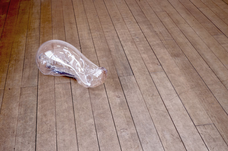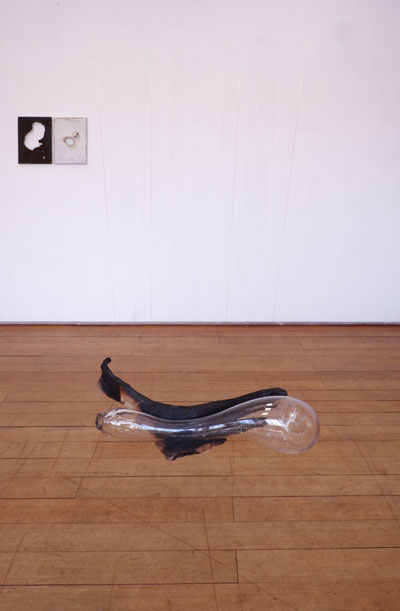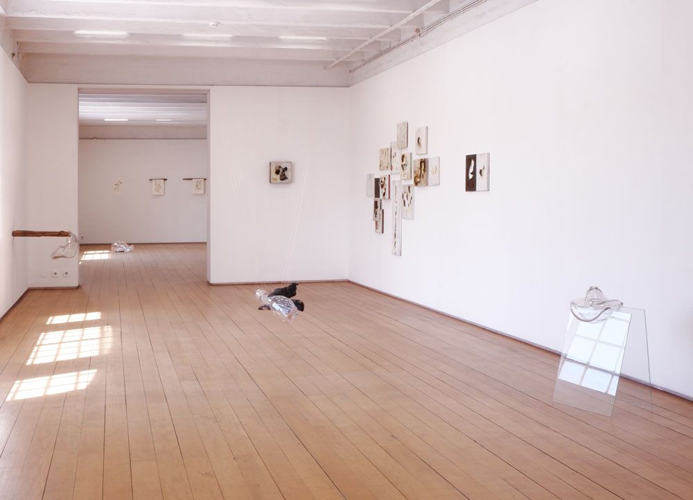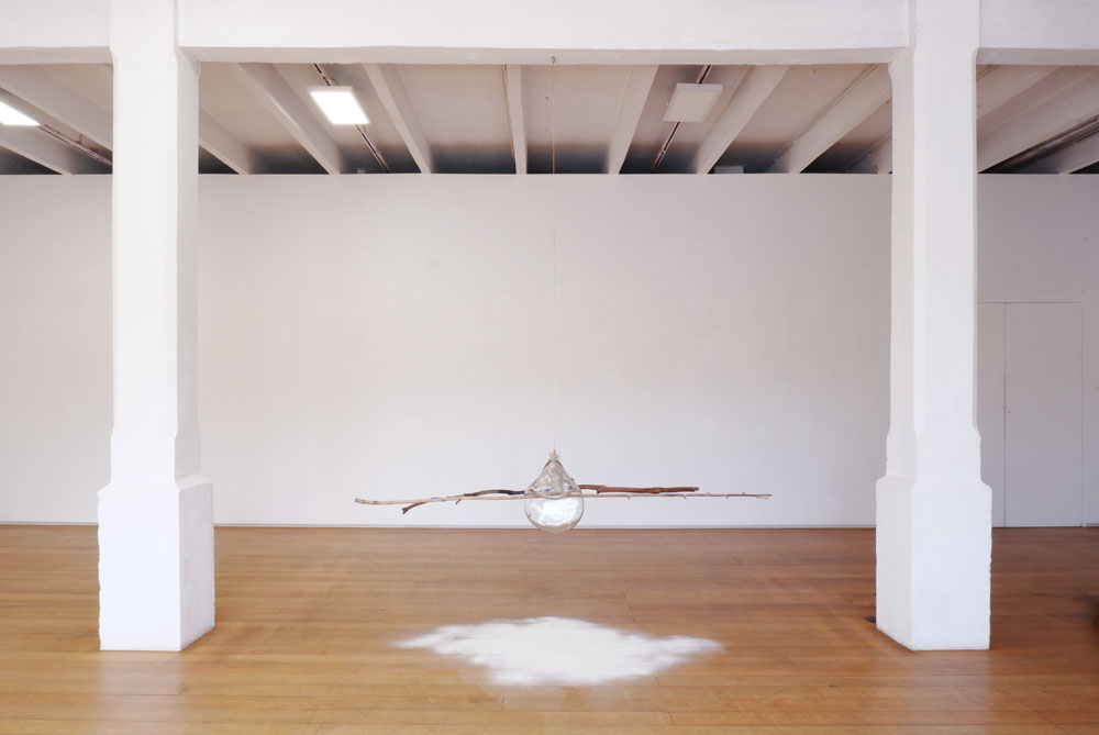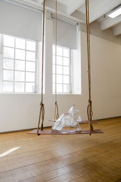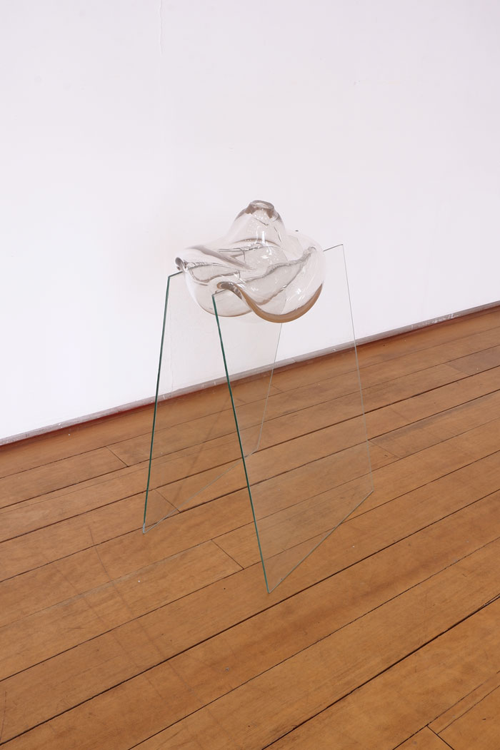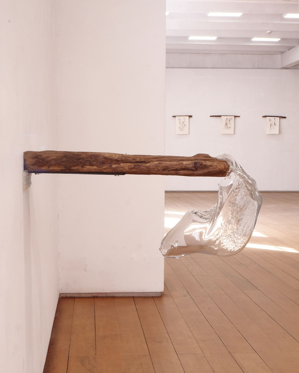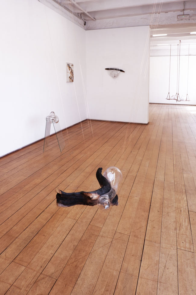 O vidro, como uma espécie de luz solidificada, é um exemplo desse invisível que age, do ar que não só apaga ou atiça. Forjado a fogo, provém do calor, da pressão e da metamorfose, mas também do sopro que substancia o ar como matéria que dá forma. Depois, pulsa-lhe a fragilidade. Vive nessa interioridade e latência da iminência da quebra, onde os fragmentos não mais se concluem no inteiro. Tornam-se memória. As peças em vidro transparente de HElena Valsecchi, e aqui a transparência funciona como um paradoxo entre visibilidade (permitindo ver através de) e invisibilidade (aludindo à impercetibilidade), apresentam-se amorfas. Dispostas em baloiços, pousadas em painéis de vidro, suspensas por fios ou na ponta de pequenos troncos de madeira, habitam numa liminaridade entre equilíbrio e colapso, silêncio e estilhaço, estabilidade e risco.