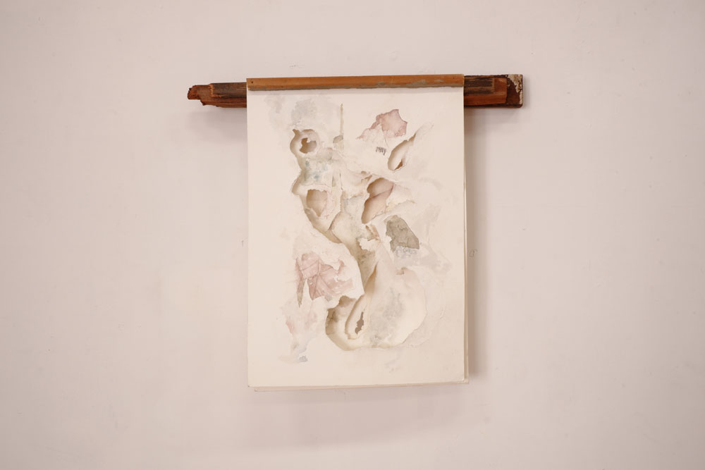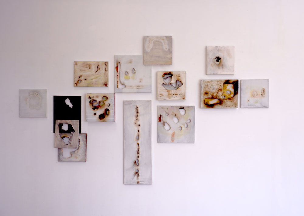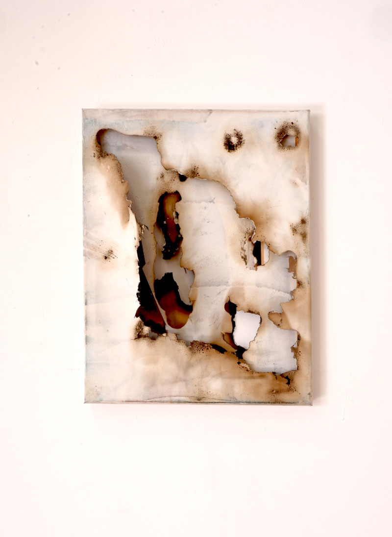 Em conjugação com estas peças, que contemplam uma sensação de estado-limite, surgem pinturas que, não obstante exibirem alguma pigmentação mais saturada, preservam essencialmente uma lúcida suavidade tonal. Rasgadas pelo fogo, parecem partir dessa herança da dor estética de Joan Miró (1893-1983), da pintura subtraída pela fúria das chamas. Desocultam-se camadas de sobreposição e forma-se uma operacionalidade de pós-medium que desagua numa corporalidade de pintura-escultura. E, nesse rastro escuro do fogo, forma-se um caminho que permite um mise en abyme de redundância estética e de reflexividade discursivo-abstrata. Numa outra vertente, o papel sustentado por pedaços assimétricos de madeira nota-se, igualmente, rasgado. Mantém-se o princípio da revelação de sobreposições, mas aqui a honra do gesto é manual. Sem o fogo devorador, é a mão bio-técnica que (des)forma. E uma pequena caixa de madeira contém essas sobras de papel como prova da ação. Mas, guardar fragmentos também pode ser uma forma de acalmar a angústia da perda.