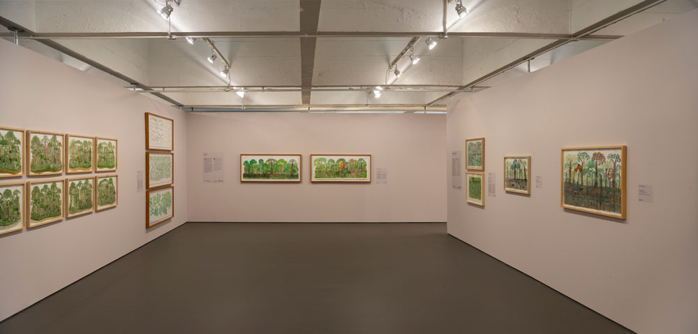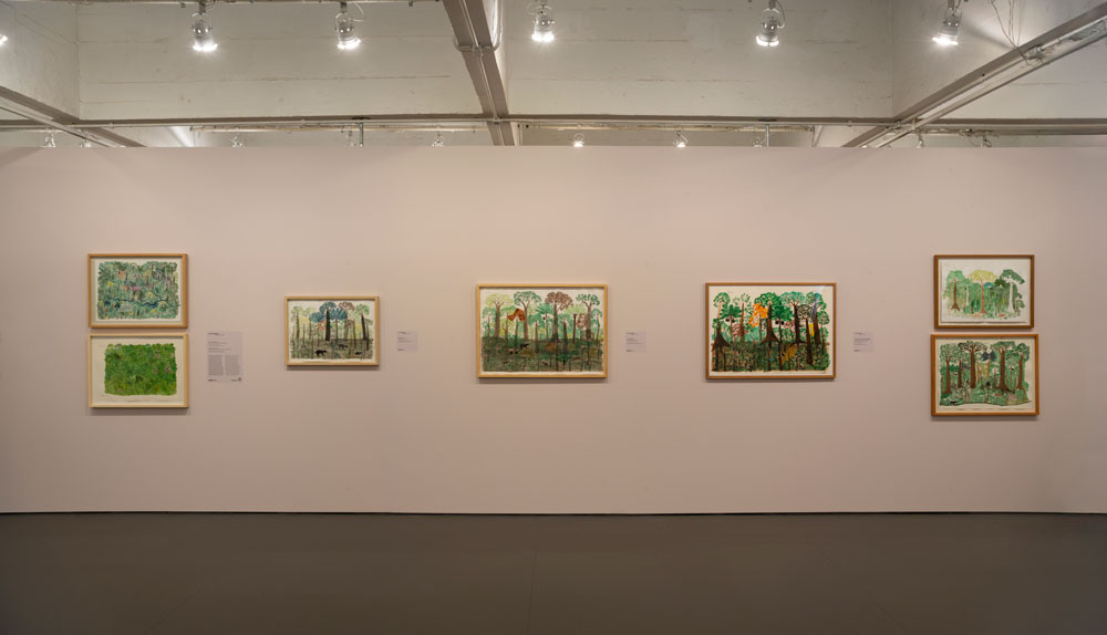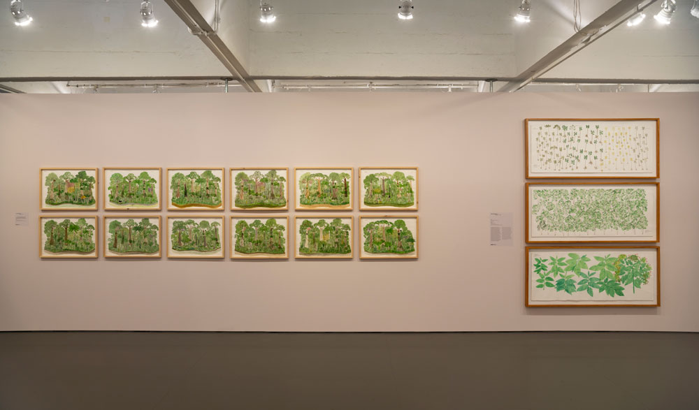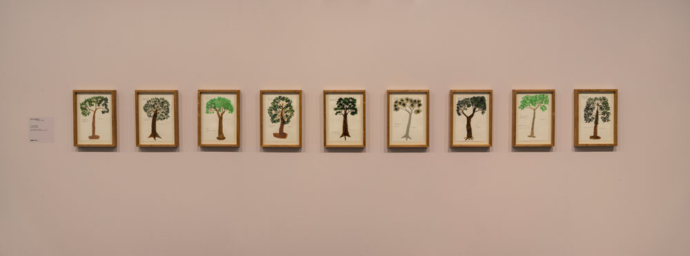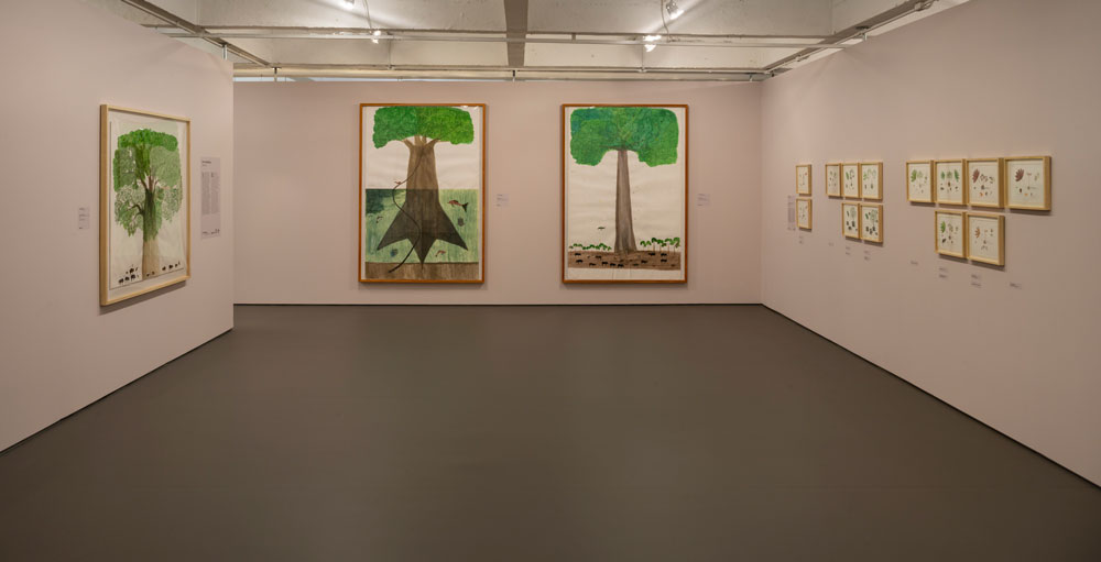 O primeiro condicionamento é uma escolha. A primeira escolha quanto a Mogaje Guihu: A árvore da vida e da abundância, exposição de Abel Rodríguez (1941-2025), é a porta de entrada e a consequente direcção da circulação no espaço expositivo. Circule-se a favor ou contra sentido horário, Mogaje Guihu – nome indígena do artista pertencente ao clã Gavilán, das comunidades Nonuya e Muinane da Amazónia colombiana, e cujo significado é “pena de gavião brilhante” – e respectivos conhecimentos e imaginação botânica são dados a ver com diferentes tonalidades anímicas. Terão Adriano Pedrosa, curador desta exposição e director artístico do Museu de Arte de São Paulo Assis Chateaubriand onde a mesma está patente até 12 de Abril, e Leandro Muniz, curador assistente da mesma instituição, designado como início a entrada correcta, onde informação para-expositiva nos sugere – sublinhe-se, na minha leitura – a série de desenhos como una, quer como símbolo quer como consequência da unidade da natureza com o corpo e comunidades a que Abel pertence. É também animada; diz-se que a árvore da vida implica que a vida se compreenda pela árvore, estrutura matriz. Também nesta abertura nos é dada a saber o mito de origem das comunidades Nonuya e Muinane; “Para eles, a primeira árvore criada no mundo é creditada como a matriz da floresta e de todos os seres. Estes, por sua vez, precisam identificar as frutas que são comestíveis ou não, o que os levará a uma série de disputas até atingirem a harmonia entre humanos e não humanos.” Cumprirá este ânimo da unidade harmoniosa, talvez, objectivos institucionais. A exposição integra a programação anual do museu dedicada às histórias da ecologia e é também a primeira exposição individual pós falecimento do artista no ano passado. Se esta unidade se depreende entre linhas do texto da entrada oficial, é algures noutros elementos textuais, informativos, que se usa “natureza integrada” como um dos temas centrais da obra do artista, juntamente com os demais identificados; árvores mitológicas, desenhos botânicos e ciclos naturais.