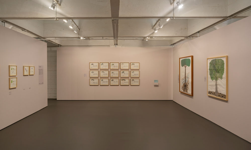 Naturalmente que tanto Adriano como Leandro, os curadores, carregam conhecimento sobre a exposição que propõem, terão estudado os seus temas origens e enquadramento cultural, e tudo o que eu não sei, não estudei, e desconheço. Escuso-me assim a continuar o sublinhado de que qualquer nota sugestiva da minha parte quanto ao espaço entre a plataforma e o comboio, ao espaço entre o texto, visão institucional e a obra, será por demais ignorante e não mais que fruto do aliciamento que estas obras me trouxeram. Fruto da felicidade de encontrar o brilho no olho da obra do artista de quem nunca vi a face; de encontrar o engajamento com a feitura. Como nota adicional acrescento que já na Bienal de Veneza de 2024 com curadoria de Adriano Pedrosa, obras de Abel haviam sido apresentadas, séries centradas na apresentação taxonómica de parte da flora amazónica, com valor científico ao nível da recolha – cor, texturas, formatos, etc. – sem perda da candura do registo, dando uso à sabedoria botânica para a qual foi educado desde infância. Note-se que, se Abel foi treinado desde a infância a reter este conhecimento, foi apenas nos anos 90, mudando-se para Bogotá para fugir aos conflitos armados, que “em contato com a fundação holandesa Tropenbos, foi incentivado a desenhar para registrar e compartilhar seus conhecimentos sobre a floresta. “ Retornando à traseira, onde demos de caras com a unidade, sim. Mas onde encaramos por acumulação a incerteza dessa vida e dessa árvore. Árvore que também morre e vida que nem se sabe o que será. Aqui, a sugestão acontece via incerteza. Dela nasce a união imaginada do humano com a árvore. Só dessa imaginação aparece o uno da vida, da morte, e da imagem que estes podem ter, tudo considerado.