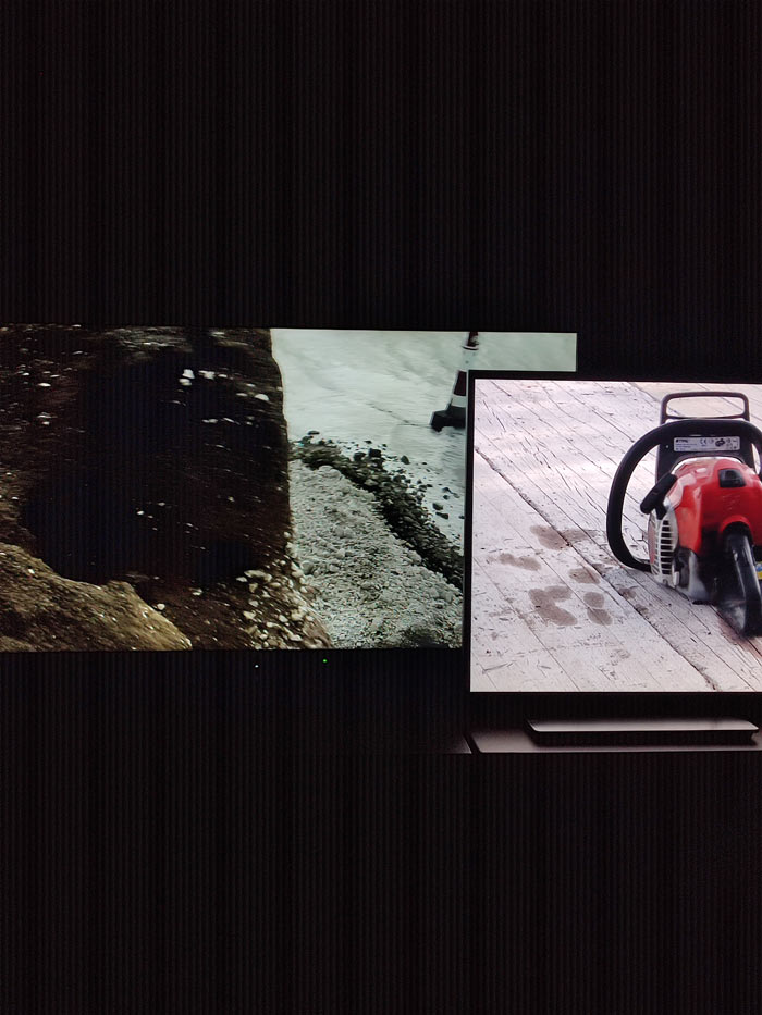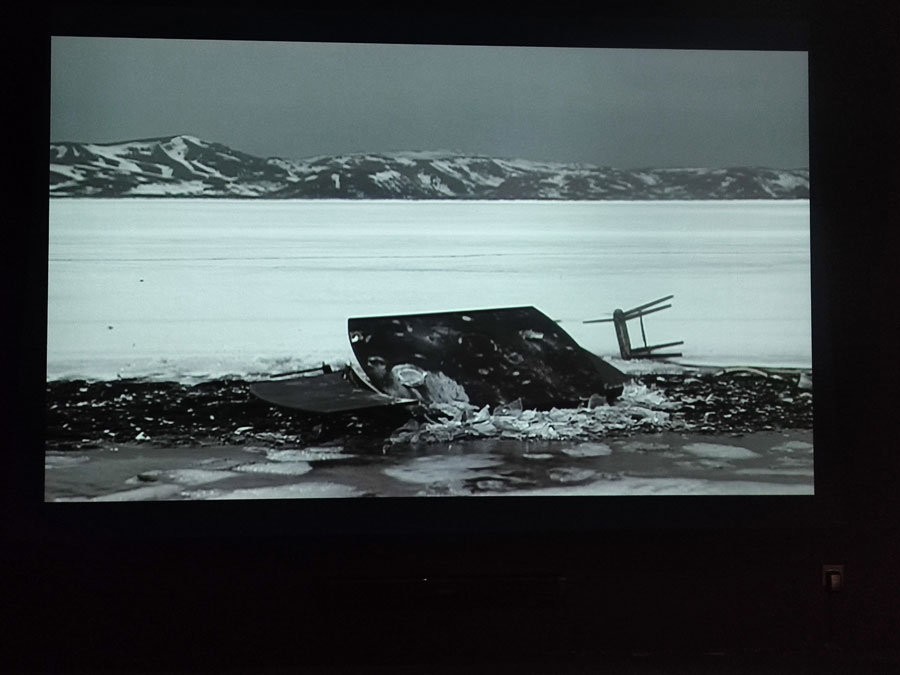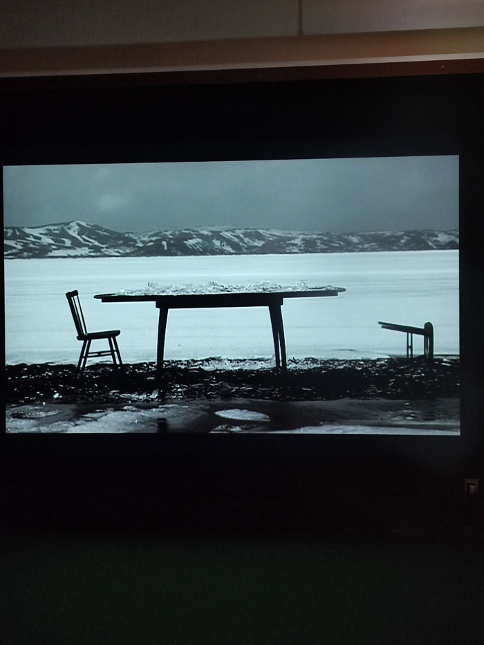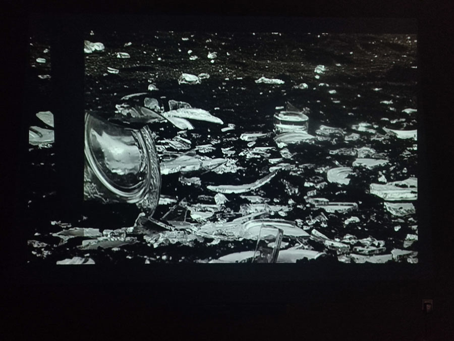Esta paisagem sonora é dominada pelo som de tiros e de vidro a ser partido pelo tiroteio. O vídeo apresenta uma mesa retangular, com louça feita de vidro em cima, e duas cadeiras nos seus extremos. Esta mise-en-scène está posta na margem de um lago, que por sua vez avista ao fundo uma montanha não muito dramática, mas com neve. O filme é a preto-e-branco, o que sublinha o contraste da neve com o negro do solo, fazendo questão que a montanha não seja ‘só paisagem’. Os grandes-planos focam-se nos cacos, no caos, nos pós e no impacto que os tiros causam ao vidro, entrando em diálogo direto com a abordagem escolhida para esta exposição retrospetiva, que se apoia na ideia de arquivo fragmentado, em cima da mesa.