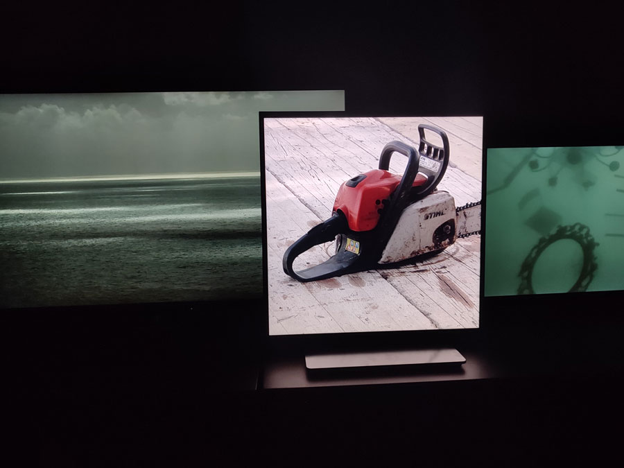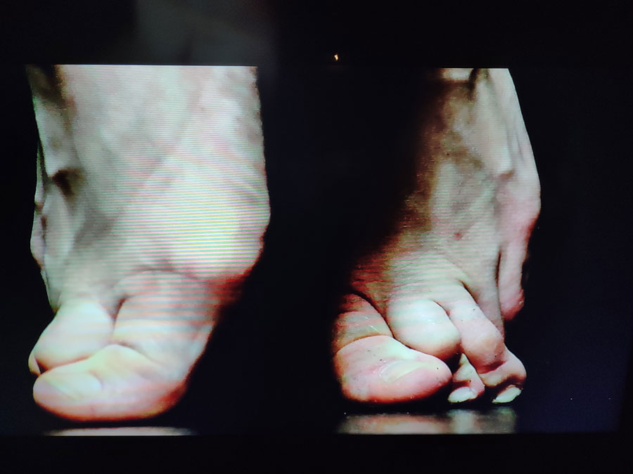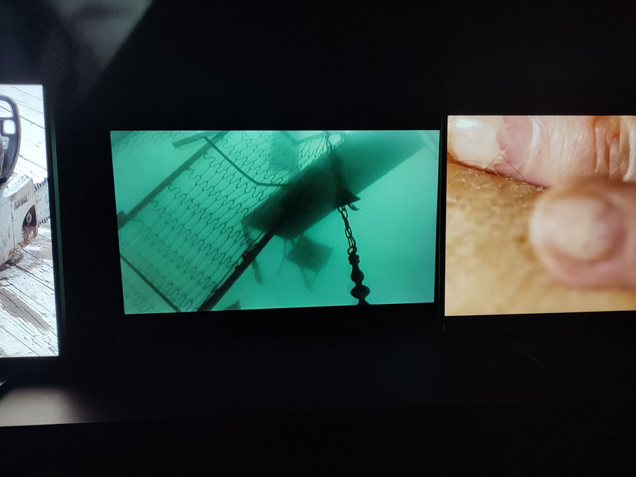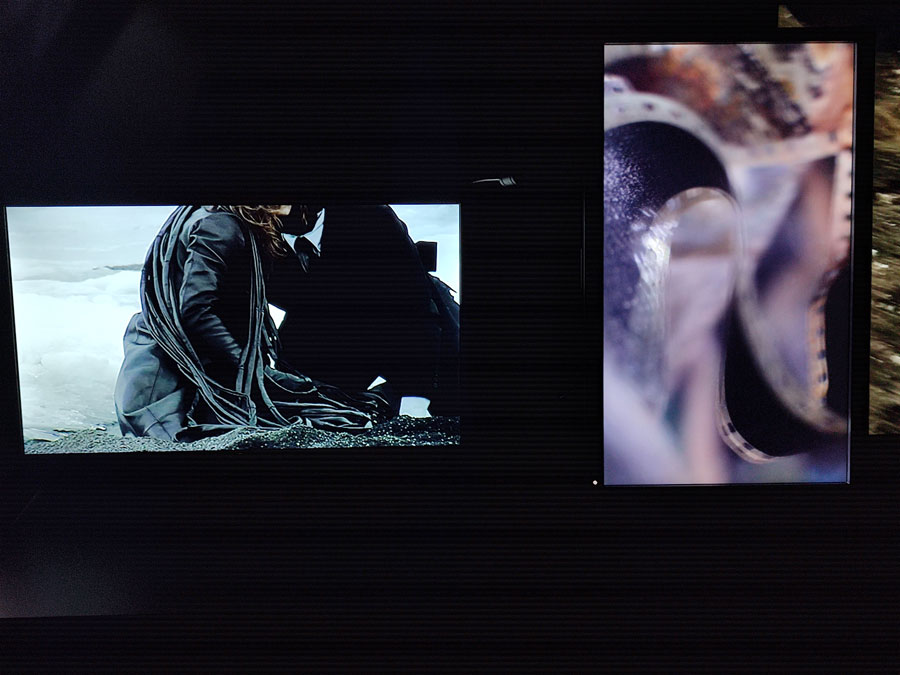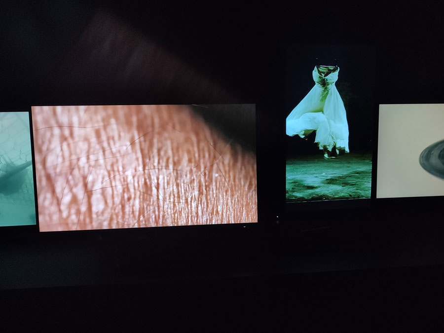 Aquele ecrã que em The Dark Side of the Loop abraça os outros ecrãs, também destaca a paisagem, e presenteia-nos com um dos aspetos que mais me fascinou no seu trabalho: através de um sentido de trans-corporeidade (Stacy Alaimo) há a exploração da fricção entre as superfícies duras e moles, diferentes estados sólidos e líquidos, quer no plano físico quer no plano emocional. Falo de trans-corporeidade, pois quer nos vídeos apresentados na exposição, quer em ARSA, há um vai e vem entre fronteiras físicas que identifico com a definição de Alaimo: uma nova materialidade que se foca no sentir os sentidos como substancialmente e perpetuamente interconectados com o fluxo das substâncias e agência do meio em que nos inserimos [2].