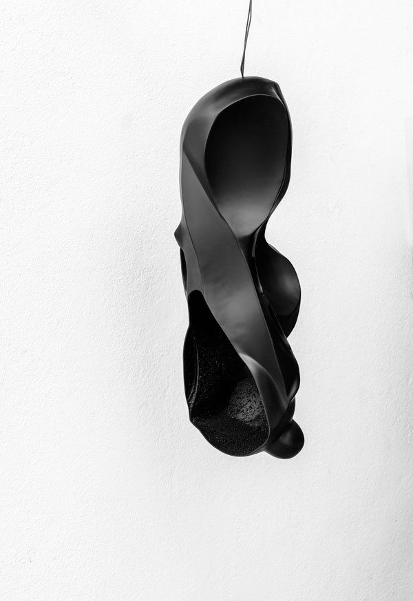 Uma outra instalação de Chafes é, na sala seguinte, um paralelepípedo de aço de 4 metros de comprimento (Luz) no fundo do qual, num minúsculo nicho iluminado, se encontra a ainda mais minúscula Toute petite figurine (4,3cm de altura) sobre um plinto muito maior que a escultura: uma simples encenação? Mas, aí entrando para nos aproximarmos da minúscula estatueta, de repente toma-nos uma vertigem, uma tontura: o chão está inclinado, as paredes parecem balançar, sentimos um desconforto, uma tempestade, um desiquilíbrio, e avançamos o melhor que podermos. Aqui, novamente, a percepção é perturbada e temos de fazer um esforço não só mental, mas físico, vencer o desconforto, para chegar ao fim e, finalmente, desfrutar da contemplação da escultura de Giacometti (novamente, sozinhos, de preferência). Rui Chafes será então um perturbador do visitante, um revelador do olhar, o seu papel limita-se a nos perturbar para nos permitir ver melhor? Um simples cenógrafo genial? Oh não! Além disso, ver frente a frente as esculturas de um e de outro, faz-nos perceber o contraste: umas, de bronze, gesso ou barro, estão em plintos, por vezes desproporcionados; outras, de aço negro, estão suspensas e mudam de acordo com a passagem do visitante. Algumas suportam teimosamente a marca dos dedos que as moldaram, como cicatrizes; as outras tendem a uma perfeição polida (embora, pela primeira vez Chafes, em duas delas, nos dê a ver o interior, a entranha, mais áspera, mas tão refinada quanto a pele externa bem polida). Algumas (em qualquer caso, as escolhidas para esta exposição) são figurativas, seres humanos de pé ou cabeças; as outras são apenas formas abstratas, enrolamentos, torções (mesmo que uma, discreta na escada, se chame Rasgar V, pequena esfera de aço suspensa). Umas tendem a ser "desmaterializadas", as outras flutuam até os limites do ponderável. Umas são um grito para o mundo; outras são um murmúrio no nosso espaço secreto. Fiquei um pouco menos convencido com a montagem que reúne ambas as obras numa única instalação: a escultura de Chafes, A noite, certamente instável e oscilante, é colocada sobre um plinto, enquanto a obra de Giacometti, O nariz, se encontra suspensa, não no interior de uma gaiola como Giacometti fez, mas na própria escultura de Chafes. Essa inversão incomoda. Além disso, estas duas esculturas na exposição são as únicas que nos revelam semelhanças formais, uma parece a extensão da outra, espada e nariz. É certo que, aqui novamente, o olhar deve jogar com as formas e encontrar o seu ponto de vista singular, mas a força da demonstração parece-me aqui enfraquecida. Finalmente, há quatro desenhos de Giacometti nas paredes. Esta exposição nada tem a ver com a outra exposição de Giacometti no Museu Maillol, muito didática (eu não vi a exposição na Fundação Giacometti com Annette Messager). Nada a ver também com as esculturas expansivas de Franz West no Centro Pompidou, em busca de legitimidade, questionando o status da obra de arte e tornando-se móveis: é uma outra concepção da escultura, nos antípodas da pureza de Giacometti e de Chafes.