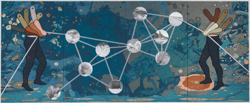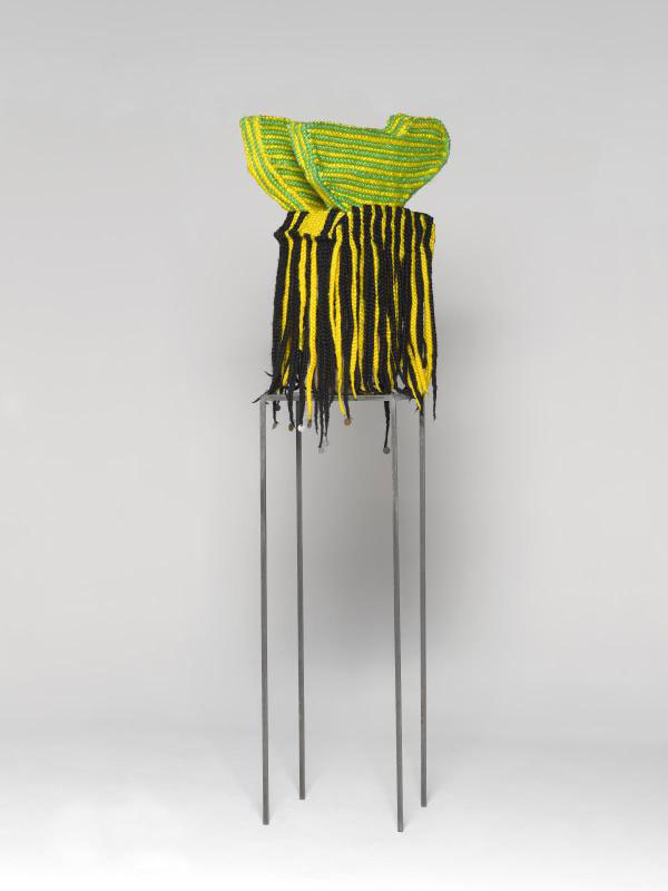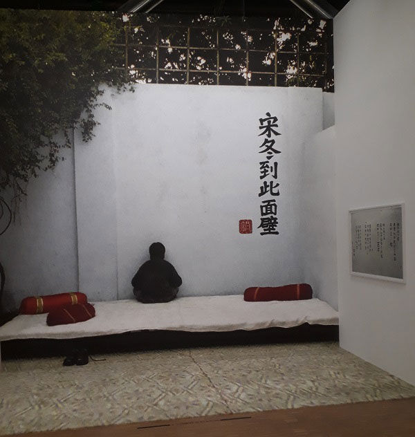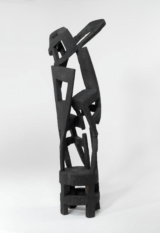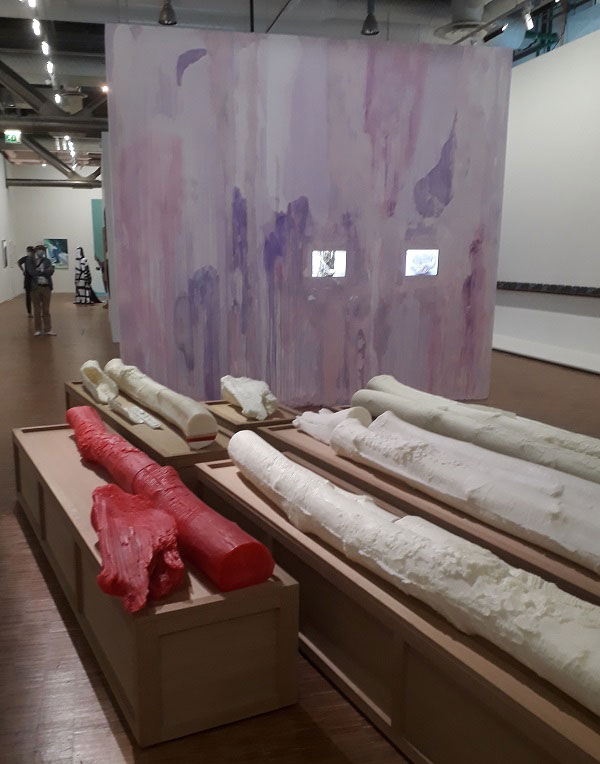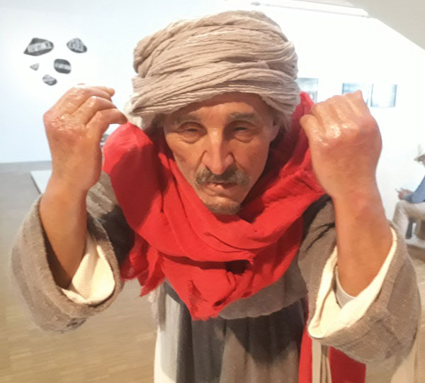 Poética também, a grande instalação do artista chinês Song Dong, uma meditação de frente para a parede, uma resistência passiva, uma ausência do mundo: resistir, é por vezes a recusa em falar, abstrair-se. Não fazer nada é toda uma arte, e também podemos resistir assim. A meio caminho, talvez, a instalação de Thu Van Tran (de quem sigo o trabalho há muito tempo) que aqui regressa à exploração colonial da borracha no Vietnam, o seu país de origem, pela Michelin entre outros: moldes brancos ou vermelhos de troncos de árvore da borracha colocados sobre caixas em madeira, um fresco à base de borracha. Se o discurso da resistência contra a dominação colonial e a pilhagem de recursos é aqui muito claro, a expressão não é militante, mas alusiva. Neste percurso de um polo ao outro, surge em seguida a escultura do palestiniano Khalil Rabah representando um velho homem esmagado sob o peso do mundo (na verdade, é inspirado por uma pintura muito famosa na Palestina, Jamal al Mahamel, o transportador da montanha, de Sliman Mansour, ou é Jerusalém que pesa sobre os seus ombros; esta pintura é também famosa porque a sua primeira versão, que Kadhafi possuía, foi destruída pelas bombas americanas em 1986), mas ele não transporta nada, em todo o caso, nada visível. É contra uma dominação invisível, porque feita de não ditos, aceitações hipócritas, tolerâncias culpáveis, que os palestinianos devem também resistir, nós sussurramos Rabah: a cumplicidade ocidental dando aval ao apartheid e ao colonialismo. Sumud, a resiliência, é o que evoca esta estátua com humor.