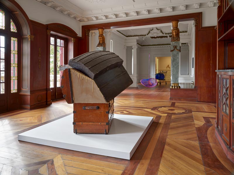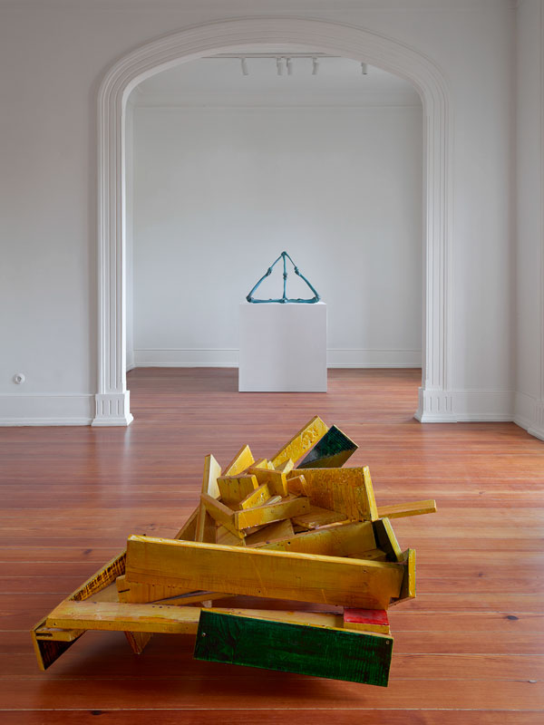 No andar principal da Casa São Roque, cuidadosamente disposta no centro da sala de jantar, ocupando um lugar de destaque, a obra ça ouvre, ça ouvre pas, 2021 desperta de imediato a nossa atenção. A penetração e intensidade da luz solar, conseguida pela varanda-terraço que possibilita um prolongamento do interior da sala e a sua relação com o exterior, acentuam o exotismo e caráter eclético do espaço nobre e de tratamento rico, o requinte do mobiliário e dos elementos decorativos, ao mesmo tempo que qualificam, no cerne da encenação, a grande instalação de Jean-Luc Moulène. A sala de jantar, projetada de raiz por Marques da Silva, por volta de 1902, assim como o mobiliário e os acabamentos, num estilo neo-imperial francês, promove em Técnico Libertário um encontro entre o arquiteto português e o artista francês, não obstante o contexto cultural e temporal que os separa. Sob o olhar atento e sereno das duas esfinges em mármore cinza, de pés e cabeça dourados, quais guardiãs da obra de Jean-Luc Moulène, ça ouvre, ça ouvre pas, emerge desafiando a nossa atenção. A instalação intriga-nos ao mesmo tempo que nos envolve num universo simultaneamente sólido e inquebrável, mas de aparente fragilidade. À medida que percorremos a obra, contornando-a e observando-a sob diversos ângulos, num exercício de proximidade e interação, desvendam-se-nos camadas que se cruzam e intercetam dentro de uma lógica de sobreposições que acompanham a exposição e em que a dualidade interior/exterior, dentro/fora, aberto/fechado é uma constante. Concebida durante o contexto pandémico, no estúdio do artista em Le Buisson, na Baixa Normandia, para integrar a exposição no andar nobre do palacete, não deixa de ser curiosa e com certeza pouco inocente, a escolha de três baús pertencentes ao recheio da casa. Dada a impossibilidade de viajar face à pandemia e após o envio de diversos objetos que remetiam para a história e memória da família, do palacete e do Porto, Jean-Luc Moulène seleciona os baús vazios, mas com muito significado [3], cheios de histórias, enquanto objetos que materializam a memória material do espaço. Os rótulos Premiado na Exposição Universal de Paris de 1889 e Para viagens e exportações entre o Reino, as Ilhas e África, de 1900, denunciam o caráter nómada e transatlântico - que com certeza terá atraído Jean-Luc Moulène - destes baús coloniais, fabricados em Lisboa e no Rio de Janeiro, que após a recente viagem ao encontro de Moulène, são devolvidos pelo próprio à casa, agora com uma função e tipologia diferentes. Interessante pensarmos na própria ideia de baú/mala enquanto casa, como signo que comporta uma dimensão pessoal, de identidade e de pertença no qual guardamos e transportamos objetos relacionados com a nossa intimidade, o nosso universo privado e, por conseguinte, uma extensão de nós próprios, da nossa individualidade. Assim como a arquitetura de elite dos séculos XIX e XX, resultante do Iluminismo e do Liberalismo, traduz uma nova forma burguesa de habitar o espaço onde as esferas do privado/público se encontram bem diferenciadas, de que a Casa São Roque é exemplo, também os baús enquanto objetos que se abrem e fecham, ocasionam uma dialética e ambiguidade entre o interior e o exterior, presença e ausência, privado e público, qualidades que percecionamos na instalação. Objetos do quotidiano, provenientes de uma aparente banalidade, subvertidos, camuflados pelo artista que recorre ao uso do cartão, material pobre, de fabrico industrial, simultaneamente leve e robusto, mas também efémero e perecível que contrasta com os restantes materiais que compõem a instalação: a madeira, a pele e o metal, aludindo conceitos de fragilidade e temporalidade. Destaquemos ainda o rigor matemático com que Jean-Luc Moulène concebe a obra, ao mesmo tempo que explora a potencialidade experimental do cartão – trabalhado manualmente como indiciam os traços de cola na união entre os baús e cartão – num certo cubismo ou geometrismo, envolvendo extrema precisão e atenção aos detalhes: linhas que se cruzam diagonalmente, que se intercetam criando ângulos retos. Como num puzzle em que se tenta encontrar a peça certa para inserir na outra, Moulène com grande rigor e minúcia procura a geometria correta para promover um encaixe entre os três baús e assim fazer algo reflexivo sobre os movimentos de coisas e pessoas. À precisão matemática e geométrica da instalação acrescesse como contraponto a imperfeição e desordem propositadas, recorrentes da utilização do cartão, o menos qualificado dos materiais para fechar todas aberturas, numa obra que joga com a nossa perceção, simultaneamente aberta e fechada, num jogo irónico e ilusório, assumido pelo título da obra –ça ouvre, ça ouvre pas- num contrassenso que revela o humor e genialidade de Jean-Luc Moulène. Como o Angelus Novus (1920), de Paul Klee – pertencente à coleção da Casa São Roque - que para Walter Benjamim se assemelhava ao anjo da história que contempla os despojos do passado quando empurrado pelos ventos do progresso, também nos observamos a o equilíbrio frágil da instalação, entre a queda, o abandono e a eternidade. A par da qualidade imagética das suas fotografias e esculturas [4], destaquemos a plasticidade dos materiais a que Moulène recorre - o bronze, o vidro, o cimento ou o plástico - e a sua capacidade de manipular e transformar os objetos que cria ou encontra, industriais ou orgânicos, metamorfoseando-os. I consider my images and objects as tools, articles of use: practical above all else. I begin to think that my ideal art objects could be something like a tool acting directly in life. If I could do art works operate with the same efficiency as tools, I would be really pleased [5]. O artista enfatiza na sua prática a importância da manipulação a partir da ideia do utensílio: as tensões im