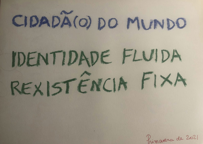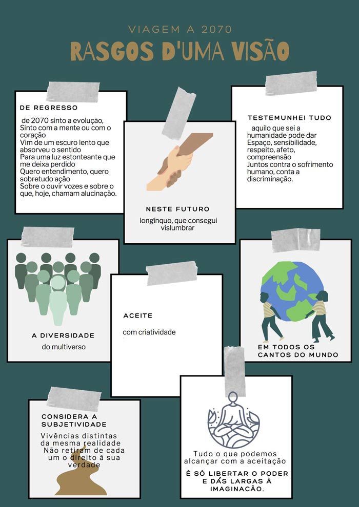 No contexto atual, pautado pelas alterações climáticas, emergências de saúde, ascensão de movimentos populistas e conservadores ou guerras e ameaça nuclear, imaginar um futuro justo pode ser considerado um acto transgressor. Foi mesmo esse o mote da Escola de Verão CES ‘Reacender a imaginação cívica para a mudança social’ (junho de 2021) e para a exposição virtual com o mesmo nome, que ficou disponível ao público em junho de 2022. ‘Imaginação cívica’ refere-se à capacidade de imaginar alternativas às condições culturais, sociais, políticas e/ou económicas contemporâneas. A pesquisa sobre a imaginação cívica (Jenkins et al. 2020) tem criado um espaço onde as humanidades se encontram com as ciências sociais para, juntas, explorarem as consequências sociopolíticas das representações culturais e as raízes culturais da participação política. Nesse processo, cria-se a necessidade de (re)pensar a nossa voz enquanto agentes políticos de mudança e a forma como entendemos e sonhamos as relações com outros/as, humanos e não humanos, e com o planeta Terra; e de reimaginar como vivenciamos a liberdade, o respeito e a democracia em momentos desafiadores em que esses direitos nos são negados. Ao longo de uma semana de Escola de Verão navegámos por essa imaginação cívica através da investigação académica vinda de vários contextos geográficos, escutámos discussões em mesas redondas com artistas e ativistas de diversas áreas e organizações de base comunitária sobre o clima, as artes e cultura ou a saúde mental e realizámos de workshops em que pensámos representações do futuro feitas pelo cinema mainstream e discutimos formatos, meios e o alcance da forma como, enquanto académicas, comunicamos ciência social para diferentes públicos. Ao longo de todo este processo, a articulação entre a teoria e a prática, assim como da história pessoal de cada participante, foi tão evidente como essencial. A exposição virtual ‘Reacender a imaginação cívica para a mudança social’ resulta precisamente dessa reflexão crítica e também autoetnográfica levada a efeito durante o período da Escola, mas com muitas reverberações para além dela. Através de várias linguagens artísticas e de comunicação – escolhidas por cada participante e buriladas pela curadoria da exposição – este conjunto de onze obras constitui um olhar carregado de dúvidas e receios de quem já sentiu na pele a injustiça social, mas também de desejos e afectos, construindo um verdadeiro caderno de encargos para as lutas civil e social, climática, cultural e identitária que resultarão num mundo mais justo daqui a meio século. Logo no arranque da exposição, Isabella Alves vai direta ao assunto escrevendo a pastel de cera numa folha já usada – ou seja, fiel depositária de outras histórias e camadas de significados – um apelo à resistência pela possibilidade de todo e qualquer tipo de existência. Em cinco cartazes, Tiago Mindrico elabora sobre a muito necessária reinvenção social e política decorrente do contexto de emergência climática. Passaremos a ser uma sociedade digital com todos os dispositivos ligados em rede, gerida pelas forças de mercado; com o nuclear como fonte de energia, que leva a pouca população existente a viver sob uma cúpula, sem poder olhar o céu; dependente da luz solar e que cria a sua própria comida e ferramentas DIY; ou de total oposição a sistemas tecnológicos para centrar na natureza a resposta para a coexistência saudável com as outras espécies do planeta? Do individual para o coletivo, Andrea Martins reflete sobre os temas da Escola de Verão e faz uma chamada para a acção através de um poema. Juntando um vídeo a um comentário áudio, e tendo o Brasil como foco, Mayalu Matos imagina futuros justos e dignos que rompem com o ciclo de violência intergeracional e de desigual distribuição de riqueza. ‘Nonada’, palavra oferecida por João Guimarães Rosa em Grande Sertão Veredas, é o mote para uma reflexão em modo de fragmento poético, montagem de palavras e ilustrações de Renata Motta. Marta Ferraz usa o cartaz/colagem para ilustrar um momento futuro em que existirá um melhor entendimento e aceitação da neurodiversidade nos seres humanos, como potência e não deficiência.