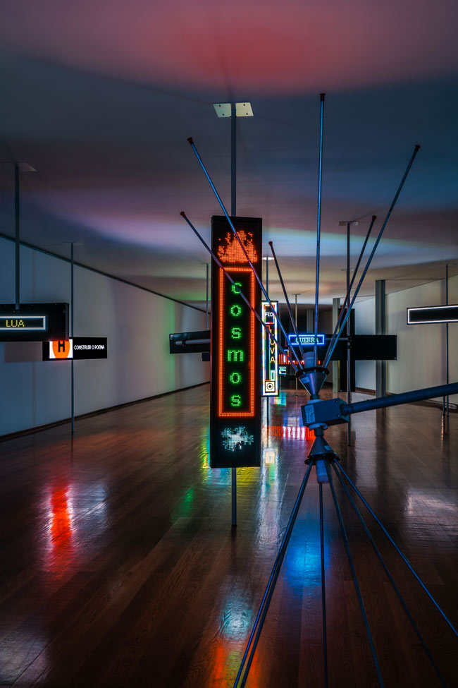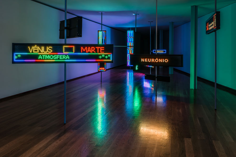 No dia da inauguração, o artista partilha que a intuição é a principal referência que guia o seu processo artístico. Silvestre Pestana tem desenvolvido uma constante reflexão sobre a vida diária, o imediato e a contemporaneidade. Apresenta a sua mais recente exposição Colapso na Galeria Municipal do Porto, propondo representar a chegada à cidade, este centro que se determina por uma realidade labiríntica e saturada de tecnologia. Com a curadoria de João Laia, a exposição foi, propositadamente, concebida para ocupar o espaço alongado do primeiro piso da galeria, o que reforça a intencionalidade de um percurso sem fim, de uma caminhada enérgica e, simultaneamente, esgotante pela cidade. Os elementos visuais da exposição levam o artista a estabelecer um diálogo intertextual, fazendo referência a obras anteriores para inscrever a sua prática em diferentes modos de ver. Quando analisamos a obra de Silvestre Pestana, torna-se impossível ignorar o impacto do passado na construção de uma narrativa que emerge de um contexto limitador, em que a educação e a liberdade eram direitos exclusivos. O seu percurso artístico inicia em 1960, ao encontrar no coletivo Poesia Experimental Portuguesa (PO.EX.) um espaço para a escrita ganhar o seu valor na luta contra o regime antifascista. Quando regressa a Portugal, no pós- 25 de Abril, após exílio na Suécia entre 1969 e 1974, adapta a visualidade, a sonoridade e a corporalidade do poema ao vídeo, à performance e à fotografia. Desde então, é considerado um artista inovador, nunca temendo pela novidade e pelo futuro que a tecnologia carrega. Esta constante curiosidade pelos diferentes meios tecnológicos reflete-se também no uso de LEDs, néons e luzes florescentes, que se tornam, muitas vezes, elementos complementares à escultura, à performance e aos poemas gráficos. Para Pestana, as novas tecnologias assumem-se como novos campos exploratórios nas artes visuais. Trata-se de um constante desafio de aprendizagem e de adaptação do saber fazer manual à experiência multidirecional tecnológica. Ao entrar na galeria, reservo um breve momento para que os olhos se acalmem naquela falsa escuridão. Estou perante uma composição de dispositivos LED em diferentes posições, com variadas cores e informações, sempre em constante mudança. O espaço enche-se de luz, uma claridade que desgasta a atenção e impossibilita o foco num único pormenor. Gradualmente, percorro os obstáculos, encarando as palavras como uma construção de uma narrativa. A cada tentativa de olhar novamente com curiosidade, mais turva se torna a visão, bem como a informação que daí se retira. Embora os LEDs tenham sido considerados nos anos 80 estruturas extravagantes e obsoletas, Pestana apresenta-os como potencial visual e sensorial na sua exposição. A partir de memórias de infância, o artista destaca a presença destes painéis em festividades populares, montras publicitárias ou até mesmo no dia a dia, onde pequenas palavras definem o destino, a saída e a chegada de uma viagem. Silvestre Pestana, já antes designado por “artista de contraciclos”, sempre refletiu sobre inquietações políticas e sociais para além do seu tempo; hoje, a sua postura radical e audaz ganha ainda mais sentido. A tecnologia tem tido um foco ainda mais gritante na sociedade, quer para aqueles que tomam consciência dela ou para os outros que se encontram perdidos neste jogo de persuasão e manipulação. Vive-se numa realidade, onde se questiona a sua própria veracidade. Tenta-se encontrar respostas nos ecrãs e fontes inesgotáveis de informação que aparentam concentrar todo o conhecimento humano. No espaço superior da Galeria, somos envolvidos numa instalação que coloca a língua portuguesa no centro de um contexto urbano. Naturalmente, a linguagem assume-se como um meio de expressão, levando os visitantes a terem uma compreensão imediata da informação. Pontualmente, as estruturas densas e metálicas de sistemas de rede reforçam a atual facilidade de comunicação e partilha de conhecimento, podendo ser análogas à representação visual da palavra neurónio. É nestas palavras soltas e aparentemente desconexas, que encontramos o poema de Silvestre Pestana. Um poema que é em si uma constelação, passível de ser reformulado a cada visita, em cada procura de uma nova interpretação. A combinação infinita das palavras selecionadas pelo artista lembra a atual partilha facilitada de informação e a constante luta de uma verdade no meio de tantos significados. O artista reativa o primeiro poema-objeto Atómico Acto – Construir o poema, destruir o objeto (1969) servindo-se, novamente, de um balão de borracha vermelho e o seu consequente impacto ao ser rebentado, estabelecendo a analogia com uma bomba atómica em contexto de guerra. A performance foi apresentada no dia da inauguração, com o intuito do público ser surpreendido por um momento de rutura, um momento que quebra a cadência da exposição. Regressando à poesia concreta e à arte experimental, a poesia de Silvestre Pestana é intemporal e propõe a reformulação de um poema num ato sensorial e visual. Deste modo, o artista oferece-nos um espaço para refletir no poder das tecnologias enquanto força para criar e destruir. Pode-se entender que é da responsabilidade humana identificar quando estes momentos de rutura aprisionam e desencadeiam consequências irreversíveis. Colapso é a primeira palavra revelada e título da exposição. Tal como João Laia refere na folha de sala, este momento de falência é comparado à contemporaneidade e à vida urbana pela qual todos ansiamos. Atualmente, a tecnologia apresenta-se, simultaneamente, como avanço e ameaça, fascínio e receio, assumindo-se, por vezes, como um espaço inspirador e otimista, como um meio criativo e multidisciplinar. Silvestre Pestana poderá ser enquadrado na descrição de Walter Benjamin, em 1928, em Rua