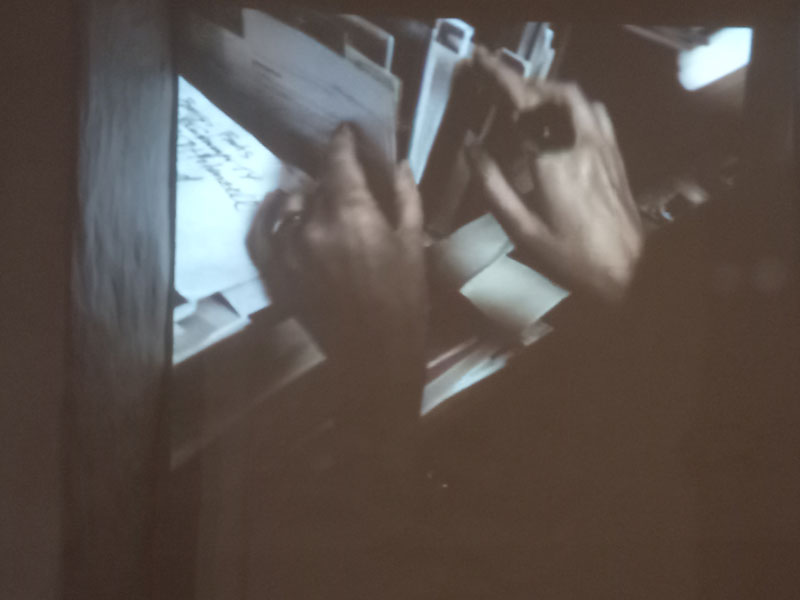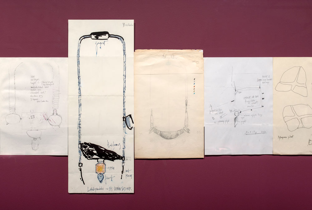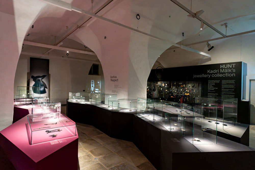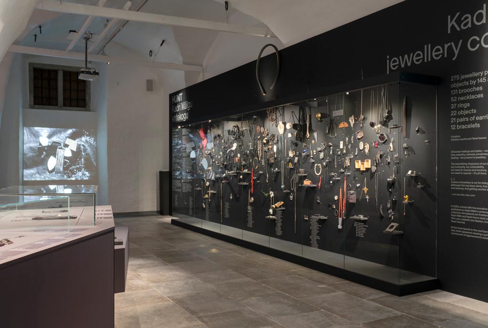 Um tríptico cinematográfico, composto por três planos sequenciais a preto e branco, mostra-a a olhar-nos de frente, olhos nos olhos, enquanto se vislumbram, ao que parece, as icónicas águas-furtadas onde viveu e trabalhou a partir do Ano Novo de 1990. Na parede oposta, uma fotografia muito aproximada do seu atelier — de novo um plano quase cinematográfico — permite-nos ser voyeurs da sua maior intimidade: a sua bancada de trabalho, fixada após a sua morte (2023), por Tanel Veenre. [5] [imagem 9]. Na segunda sala, a parede da esquerda apresenta uma sequência de desenhos de joias, realizados entre 1980 e 2000s, dispostos em linha contínua. Esboços simples e alguns desenhos mais detalhados revelam o modo como a artista pensava a joalharia — como a projetava e construía. São desenhos de contorno, muito minimalistas, mas também de um certo expressionismo, nos quais o seu traço gótico se torna sempre evidente [imagem 10]. Na parede oposta, que encerra a exposição, encontra-se Hunt, a coleção de joalharia que Mälk reuniu ao longo de quarenta anos, composta por duzentas e setenta e cinco peças de cento e quarenta e cinco artistas de diversas nacionalidades, quase todos amigos, colegas e muitos seus discípulos [imagem 11]. Uma grande vitrine contra a parede exibe, por ordem alfabética dos nomes dos artistas, esta coleção, revelando uma dimensão esotérica e xamânica que prolonga a obra de Kadri Mälk e o seu desejo de apoiar e incentivar esta disciplina, para além da sua própria prática artística. Kadri usava regularmente, com orgulho, as joias da sua coleção. Uma concentração improvável de autores, tipologias, materiais e dimensões expande-se para lá da vitrine — uma peça de grande escala encontra-se suspensa na parede, sobre o vidro, anunciando a sua continuidade. Hoje sob a responsabilidade de Tanel Veenre, aguardamos o que o seu futuro reserva [imagem 12]. No final do percurso, é apresentado o filme Dark Side of Imagination, da realizadora Marianne Korver, de 2003, filmado na ilha de Muhu, na Estónia — lugar onde, em 2001, Kadri organizou o icónico simpósio Nocturnus, no qual tive o privilégio de participar —, incluindo também imagens da artista a trabalhar no atelier. O filme mostra ainda testemunhos de Tanel Veenre e de Harry Liivrand, historiador e curador da exposição Cidades Fronteiriças, mostrada em Tallinn e Lisboa no âmbito de Tallinn Capital Europeia da Cultura 2011.