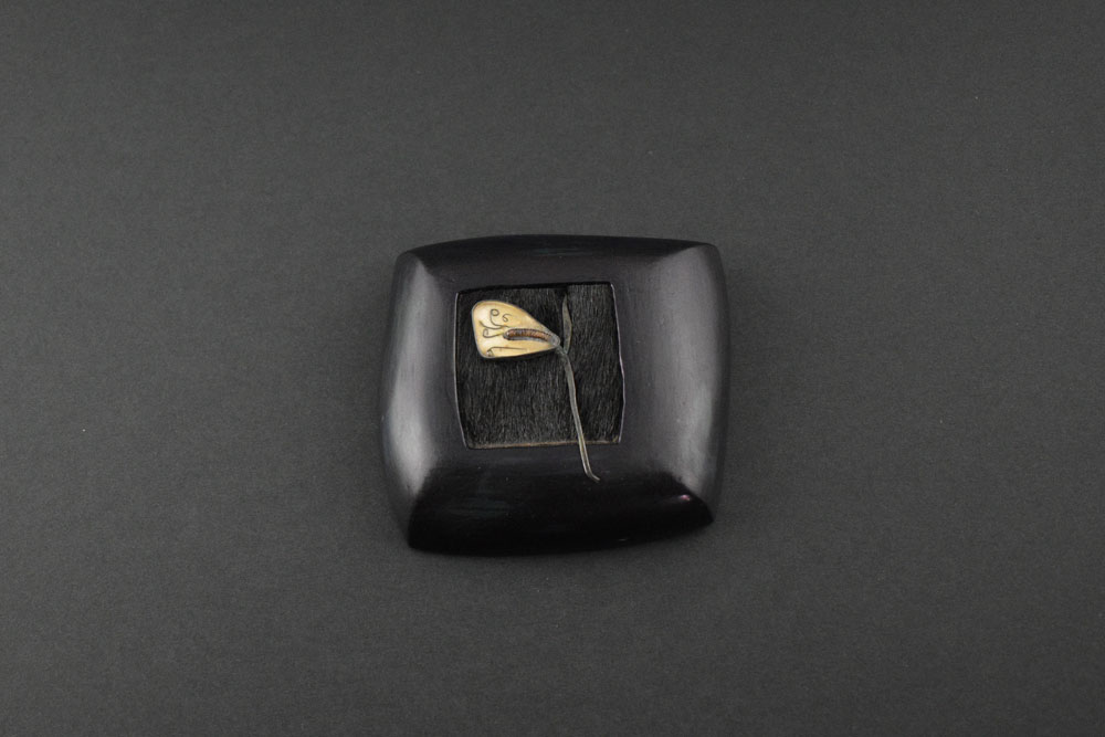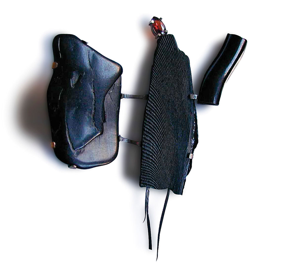As próprias curadoras colocam a questão: em que consiste o fenómeno da joalharia de Kadri Mälk? Propõem pensar a sua obra como um território de carácter xamânico, no qual símbolo, emoção e matéria coexistem, e a experiência emerge da tensão entre forma e significado — um espaço em que não só as formas, mas também a materialidade atua, atuam como desencadeadoras de sentido. [7] [imagens 24, 25, 26, 27]. Dark Side of Imagination [O lado sombrio da imaginação], série iniciada em 1996 e que dá título à exposição, apresenta um conjunto de peças de formato aproximadamente quadrado, com cerca de sete centímetros e meio de lado, realizadas em ébano e madeira policromada, no centro das quais se inscreve um quadrado de pele de toupeira embutido — material de eleição da artista [imagens 28, 29]. Sobre essa superfície tátil, que remete simultaneamente para o interior da terra e para a escuridão, Kadri Mälk intervém com metais (prata, ferro, ouro), pedras (turmalina, espinélio, ónix) e outros materiais naturais, como dente de tubarão, cera de abelha ou ébano. São pequenas constelações, quase emolduramentos do imaginado. O preto e o azul profundo acentuam essa dimensão sombria, onde a imaginação não se limita a representar — expande-se [imagem 30].