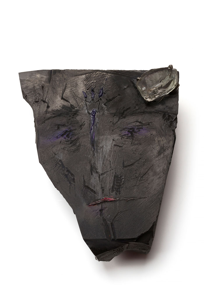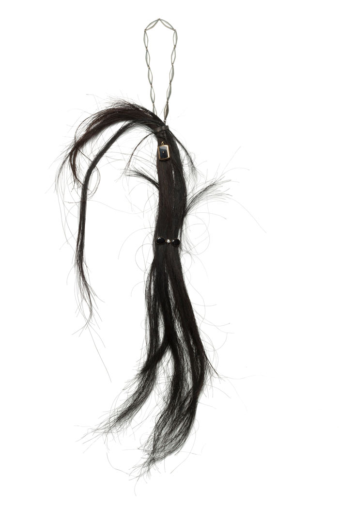 Como exemplo, refiro as duas peças que integram a coleção de Liesbeth den Besten: a primeira, Smell of The Fish [Cheiro a peixe] (2016), incorpora dois elementos readymade assistidos, com intervenção de pintura gestual (muito comum na sua prática): uma faca de peixe em prata e um aro gravado fragmentado, de tipologia clássica; a outra, Liesbeth Brooch [Broche de Liesbeth] (2017), dedicada à colecionadora, num gesto de agradecimento. A inscrição, quase hieroglífica — «Liesbeth with love» — surge pintada de rosa-fúcsia, criando uma disrupção inesperada face ao negro que atravessa grande parte da sua obra, como um grafitti.