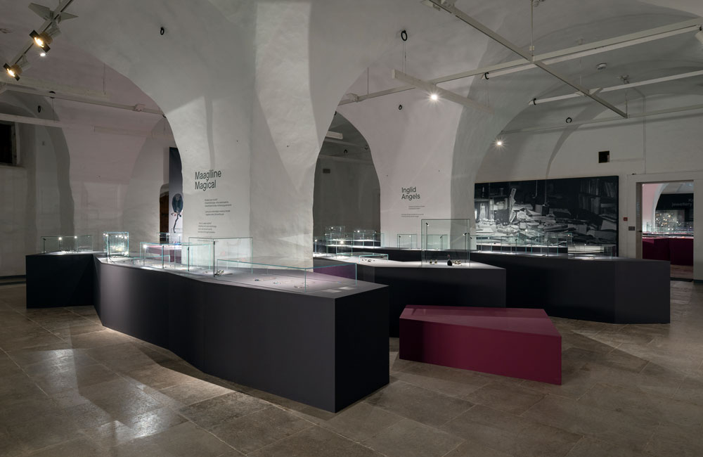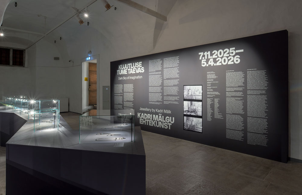 Tenho adiado escrever sobre esta exposição por ela parecer dispensar palavras que a interpretem. Precisei de esperar pelo seu encerramento — ontem, dia 5 de abril, domingo de Páscoa — para finalmente iniciar esta reflexão que, mais do que uma interpretação, pretende ser uma descrição: uma tentativa de fixar uma exposição que se quer irredutível. É uma estranha sensação imaginar que uma constelação tão imaculada de joias, desenhos, fotografias, design expositivo, som e filme tenha um fim. É como assistir à segunda morte de Kadri Mälk — como perdê-la duas vezes: primeiro, no dia 1 de janeiro de 2023, simbolicamente no dia de Ano Novo; agora, no dia seguinte à Ressurreição. Estive presente no funeral de Kadri Mälk e pude prestar-lhe essa homenagem. Visitei a exposição por duas vezes, ambas precedidas de uma passagem pela sua campa. Esse ritual — tão caro a Kadri — tornou-se parte do impacto da exposição. A exposição resulta de um trabalho curatorial rigoroso, conduzido por Krista Kodres e Kai Lobjakas e sustentado por uma equipa, que inclui Ketli Tiitsar, que torna visível — com notável precisão — a obra única de Kadri Mälk. A montagem da sua coleção de joias, a cargo dos seus discípulos Tanel Veenre e Kriistina Lauritz, integra-se de forma orgânica no percurso expositivo. A exposição centra-se, assim, tanto na obra criativa da artista como no seu papel enquanto colecionadora. Como referem as curadoras, vista na sua totalidade, a sua obra revela uma notável riqueza e versatilidade de expressão, marcada por uma tensão entre imaginação e meios que gera uma intensidade perceptível nas peças, tornando-as objetos com forte carga emocional. [3] A clareza do design gráfico de Indrek Sirkel — que convida à leitura dos textos de sala e das legendas —, o preciso desenho expositivo de Pille Lausmäe e o hipnótico desenho de som criado por Janek Murd constituem elementos determinantes na construção desta experiência — não como suporte, mas como parte ativa da linguagem da exposição. Começo pelo som hipnótico que Janek Murd desenhou. Como um mantra, capta a nossa atenção e fixa o olhar nas obras. Esta peça, de duração contínua e extensão invulgar, é um elemento vital da exposição — é ela que nos convida a entrar, envolvendo-nos desde o primeiro momento. Perdemos, no som, o sentido do tempo, sem nunca nos alhearmos do que vemos; pelo contrário, tornamo-nos mais atentos, vendo para lá do que nos é dado. A mente é, assim, ativada ao seu expoente máximo, e as obras de Kadri Mälk estabelecem um diálogo que ultrapassa o olhar, cumprindo a sua função essencial [imagens 1, 2]. O design expositivo, simples e rigoroso, cumpre a missão de acolher a alma gótica da artista e de apresentar uma obra complexa com respeito e dignidade. Um «altar» contínuo com cerca de noventa metros, composto por módulos minimais, pintados de preto e púrpura — as cores de eleição da artista — cujas variações pontiagudas no seu contorno acentuam esse carácter gótico, percorre as duas salas do museu, que não poderiam ser mais adequadas [imagens 3, 4]. O museu está instalado num antigo celeiro, um edifício que remonta ao final do século XVII, posteriormente adaptado para o acolher em 1980. As salas, embora situadas no piso térreo, no contexto desta exposição e na ausência de luz, lembram catacumbas. Os tetos abobadados em cruz, sustentados por grossas colunas pintadas de branco — baixos —, e o chão em lajes de pedra escura, de corte retangular, frio e neutro, criam um ambiente rígido e austero, evocando uma espacialidade de matriz gótica. As joias imaculadas dispõem-se ao longo do «altar», isoladas ou em pequenos grupos, protegidas por setenta e cinco campânulas de vidro, de diferentes tamanhos, que as configuram como «relíquias». A luz — num total de cento e dez focos — pontua cada conjunto e incide sobre as peças, intensificando a sua presença. O espaço assume, assim, um carácter simultaneamente místico e sagrado [imagem 5]. As cerca de duzentas [4] peças em exposição, realizadas entre a década de 1980 e a de 2020 — sendo a mais antiga datada de 1986 e a mais recente, de 2022, assinalada como última realizada pela artista — organizam-se em dez secções temáticas, cada uma acompanhada por uma citação da artista. Os nomes dessas secções surgem inscritos nas largas colunas brancas que sustentam o teto abobadado [imagens 6, 7]. Metaforicamente, estes pilares são também a coluna vertebral da obra de Kadri Mälk: os temas que a perseguiram e acompanharam ao longo da vida.