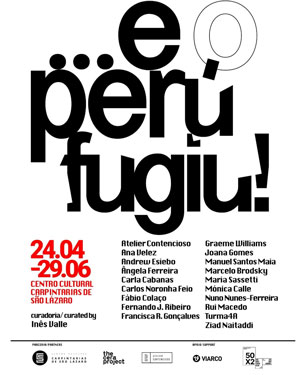 INAUGURAÇÃO: 24 de Abril a partir das 17h, no Centro Cultural Carpintarias de São Lázaro exposição …e o perú fugiu! Curadoria de Inês Valle Uma exposição coletiva sobre liberdade, com obras de: Atelier Contencioso, Ana Velez, Ângela Ferreira, Carla Cabanas, Carlos Noronha Feio, Fábio Colaço, Fernando J. Ribeiro, Francisca Rocha Gonçalves, Graeme Williams, Joana Gomes, Manuel Santos Maia, Marcelo Brodsky, Maria Sassetti, Mónica Calle, Nuno Nunes-Ferreia, Rui Macedo, Turma4A e Ziad Naitaddi. Esta exposição resulta de uma parceria entre as Carpintarias de São Lázaro, o The CERA PROJECT e o Atelier Contencioso, com o apoio da Viarco e da Comissão Comemorativa 50 anos 25 de Abril.
