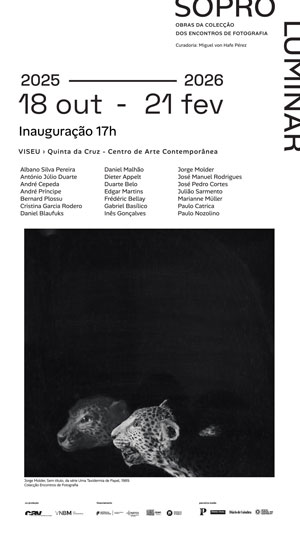 COLECTIVASopro luminarQUINTA DA CRUZ - CENTRO DE ARTE CONTEMPORâNEA Quinta da Cruz rnRua de São Salvador 3510-072 VISEU 18 OUT - 18 FEV 2026 INAUGURAÇÃO: 18 de outubro, 17h, Quinta da Cruz - Centro de Arte Contemporânea, Viseu Sopro luminar Curadoria de Miguel V. Hafe Peréz Artistas Albano Silva Pereira, André Cepeda, André PrÃncipe, António Júlio Duarte, Bernard Plossu, Cristina Garcia Rodero, Daniel Blaufuks, Daniel Malhão, Dieter Appelt, Duarte Belo, Edgar Martins, Frédéric Bellay, Gabriel BasÃlico, Inês Gonçalves, Jorge Molder, José Manuel Rodrigues, José Pedro Cortes, Julião Sarmento, Marianne Müller, Paulo Catrica e Paulo Nozolino. “Sopro luminar†é uma exposição que reúne artistas portugueses e internacionais de várias gerações que utilizam a fotografia de modos diversificados naquilo que são visões mais ou menos subjectivas da realidade. As obras pertencem à Colecção Encontros de Fotografia e correspondem em determinados casos a encomendas feitas no sentido de um mapeamento de territórios nacionais que os autores exploraram mediante um trabalho autoral de inegável valor estético e histórico. A escolha agora apresentada reflecte sobre a importância da luz na definição de projectos que podem assumir um carácter mais documental ou privilegiar narrativas eminentemente subjetivas ou conceptuais. Trata-se, acima de tudo, de um diálogo com a própria história da arte, onde a luz sempre assumiu um papel preponderante na pintura, e com a perceção do mundo eminentemente condicionada pela imagem televisiva a partir da segunda metade do século XX e as chamadas redes sociais na actualidade. Ou seja, a imagem fotográfica é aqui ancoragem possÃvel de um olhar diferenciado sobre o que nos rodeia, permitindo que paisagens, retratos, interiores e pequenos apontamentos do quotidiano assumam uma singularidade “transtemporalâ€. ::: A Colecção Encontros de Fotografia Surgidos nos anos 80, numa altura em que a representatividade da fotografia no nosso paÃs era praticamente nula, os Encontros de Fotografia nascem com o intuito de inscrever Portugal no circuito internacional da fotografia contemporânea. Os Encontros de Fotografia transformaram Coimbra num pólo de divulgação da fotografia moderna e contemporânea, promovendo a apresentação regular de exposições de fotógrafos incontornáveis da História da Fotografia, bem como a encomenda de projetos especÃficos a artistas reconhecidos no circuito da arte internacional, para além de uma clara aposta em autores portugueses. O caso particular das encomendas de projectos fotográficos em diversas regiões de Portugal, desenvolvido sobretudo durante a década de 1990, promoveu a descoberta do nosso território sob um novo olhar, quer pelas lentes dos fotógrafos estrangeiros, quer pelas lentes de jovens fotógrafos portugueses cujo interesse por este meio foi claramente impulsionado pelos Encontros de Fotografia. Ao longo dos mais de 40 anos de história, os Encontros de Fotografia foram reunindo no seu espólio uma vasta e importante colecção de fotografia, com mais de 2500 obras, bem como um extenso fundo bibliográfico decorrente das exposições. O Centro de Artes Visuais, inaugurado em 2003 com uma programação regular que resulta do caminho trilhado pelos Encontros de Fotografia, tornou-se assim uma instituição Ãmpar e pioneira em Portugal na divulgação das artes da imagem no contexto da arte contemporânea. |